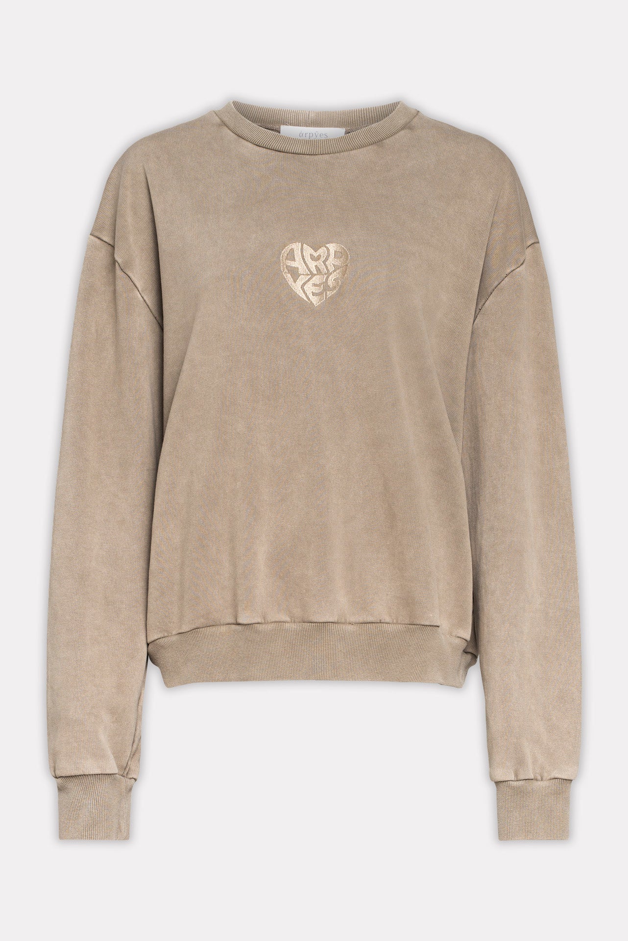 The Unique sweater is made from soft cotton with a washed effect for a relaxed, lived-in feel. It features dropped shoulders, ribbed cuffs and hem, and a round neckline. The front showcases a tonal embossed heart-shaped "ARPYES" logo. Designed for comfort and style, it has a loose, unisex fit perfect for everyday wear.