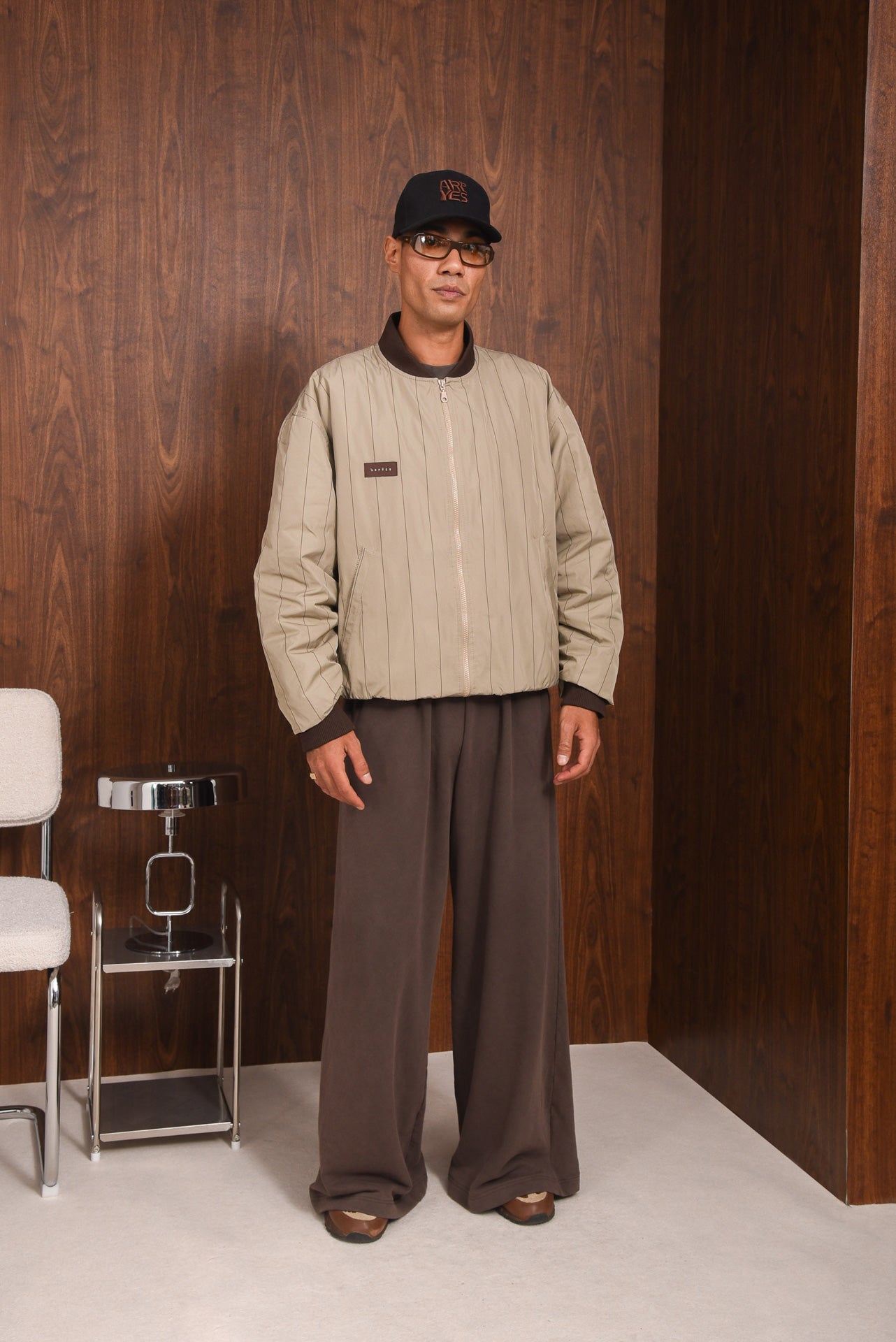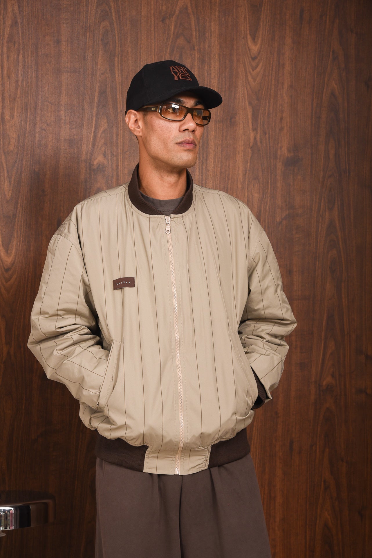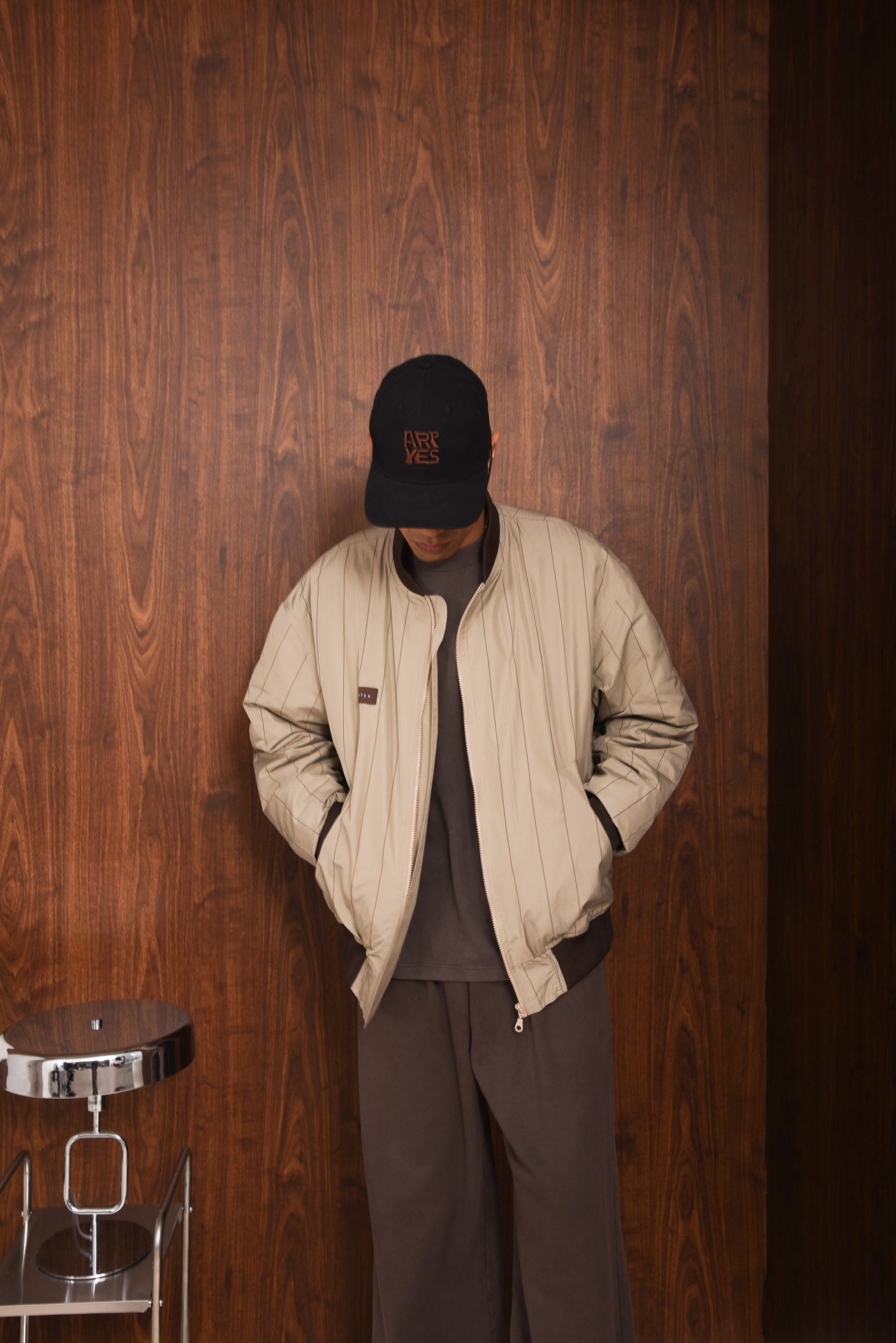 The Expression Bomber Jacket has a relaxed fit and a soft, padded feel for comfort and warmth. It features vertical stitching, a front zip closure, and side pockets. The collar, cuffs, and hem are ribbed in contrast brown ribbed fabric. Finished with a small brown "ARPYES" patch on the chest, it’s an easy everyday outer layer.