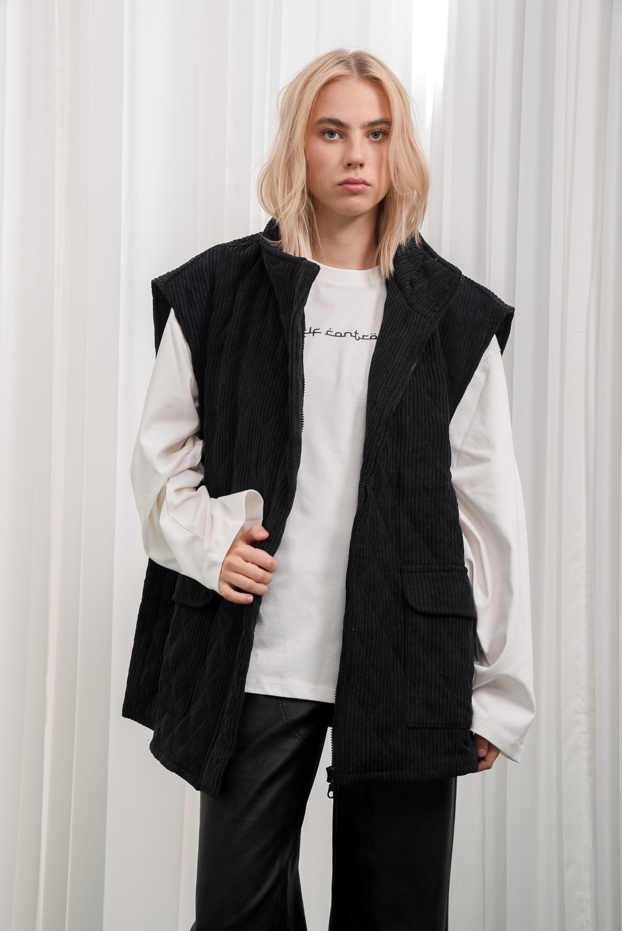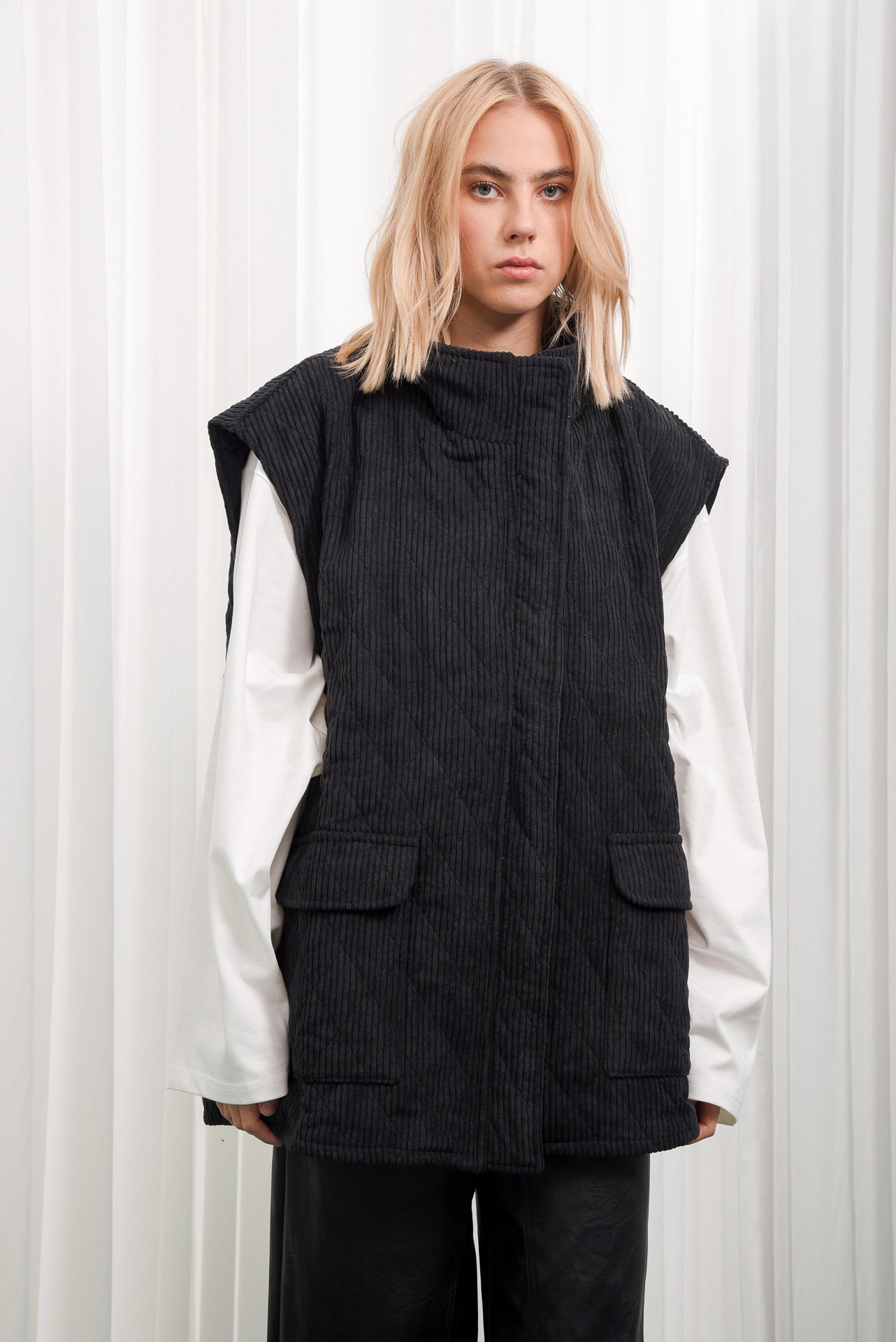 Reborn Vest is a sleeveless corduroy vest with a quilted texture and relaxed, boxy fit. Designed with a high collar, front zip closure, and large flap pockets. Fully lined for comfort and warmth. Made from soft corduroy fabric in earthy tones, ideal for layering over shirts or sweaters for a cozy, modern look.