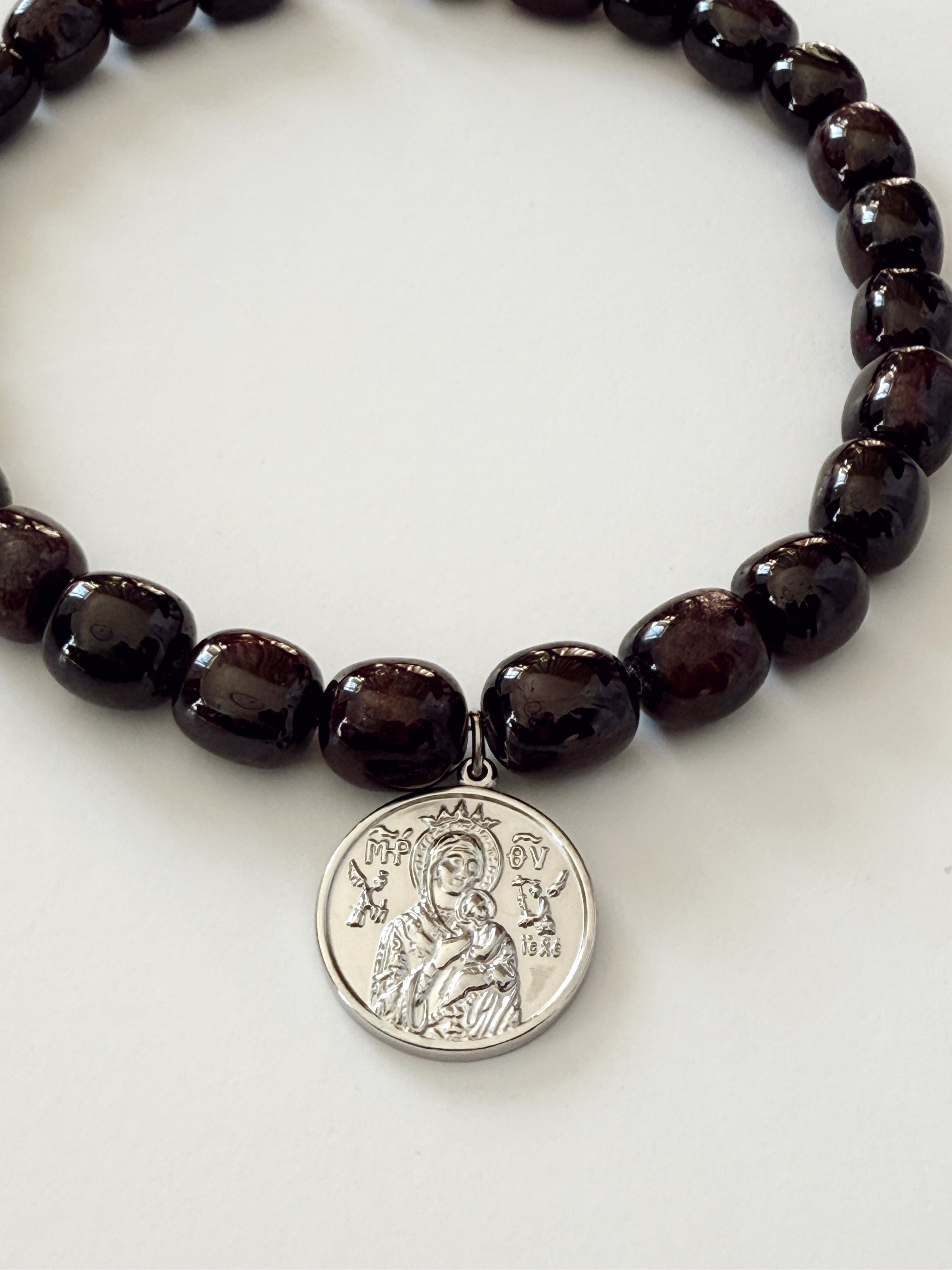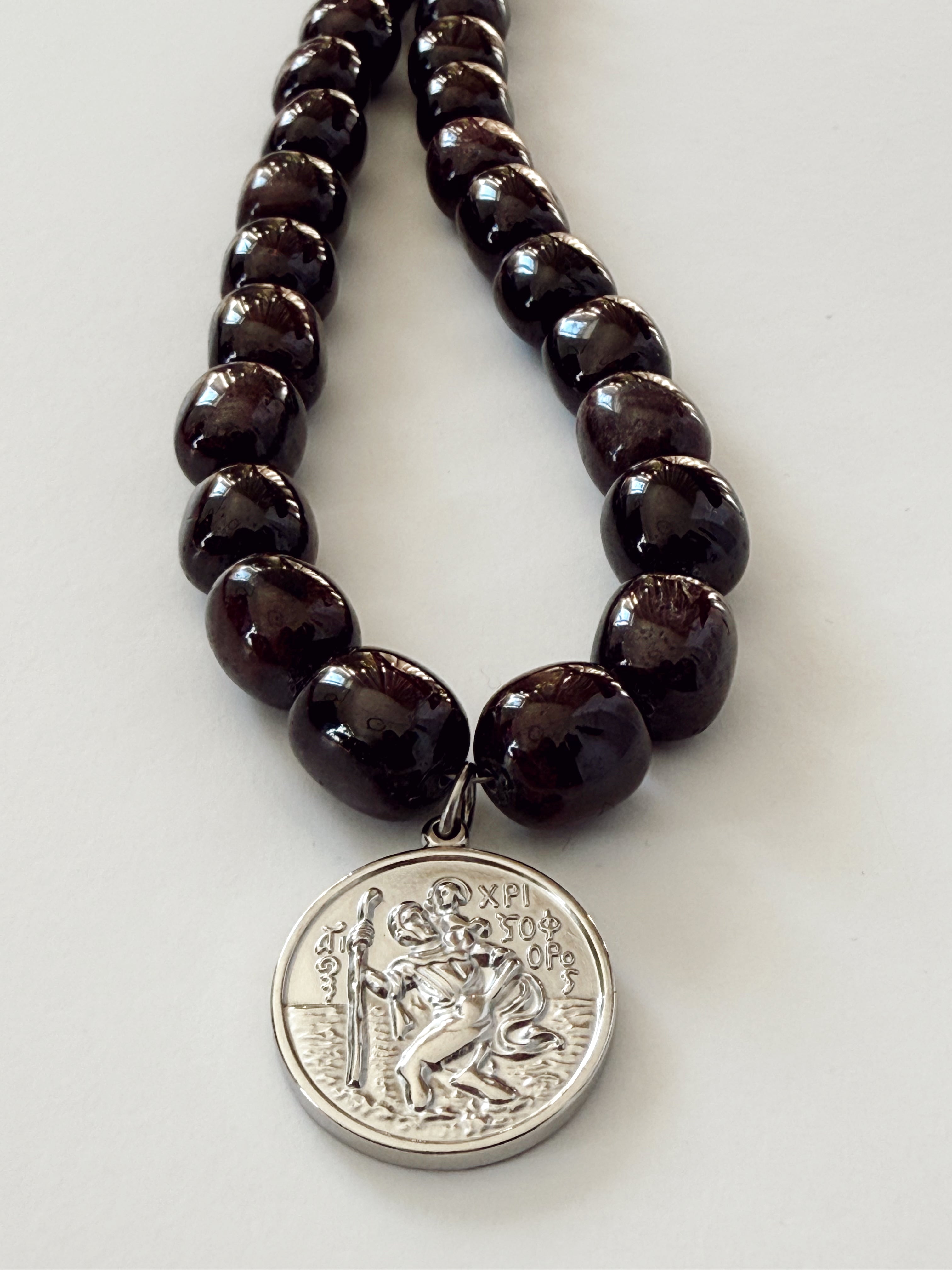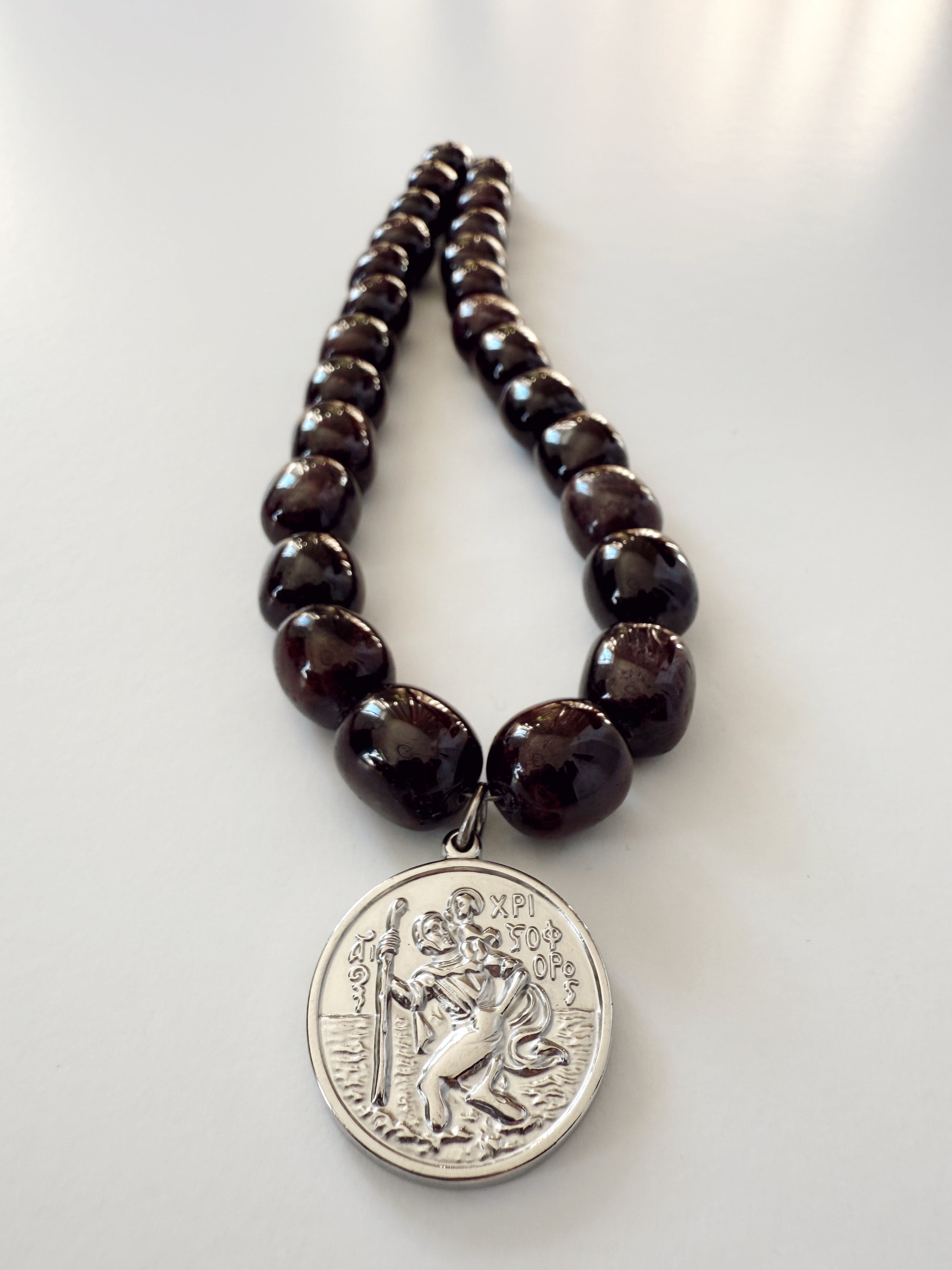 BORDEAUX BEADED SILVER MEDALLION NECKLACE