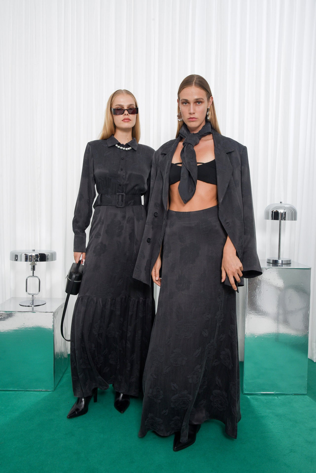 Inner Voice scarf, a lightweight black jacquard scarf with a soft feel and subtle floral pattern. Its fluid drape makes it easy to wear around the neck, shoulders, or as a stylish accessory for any look.