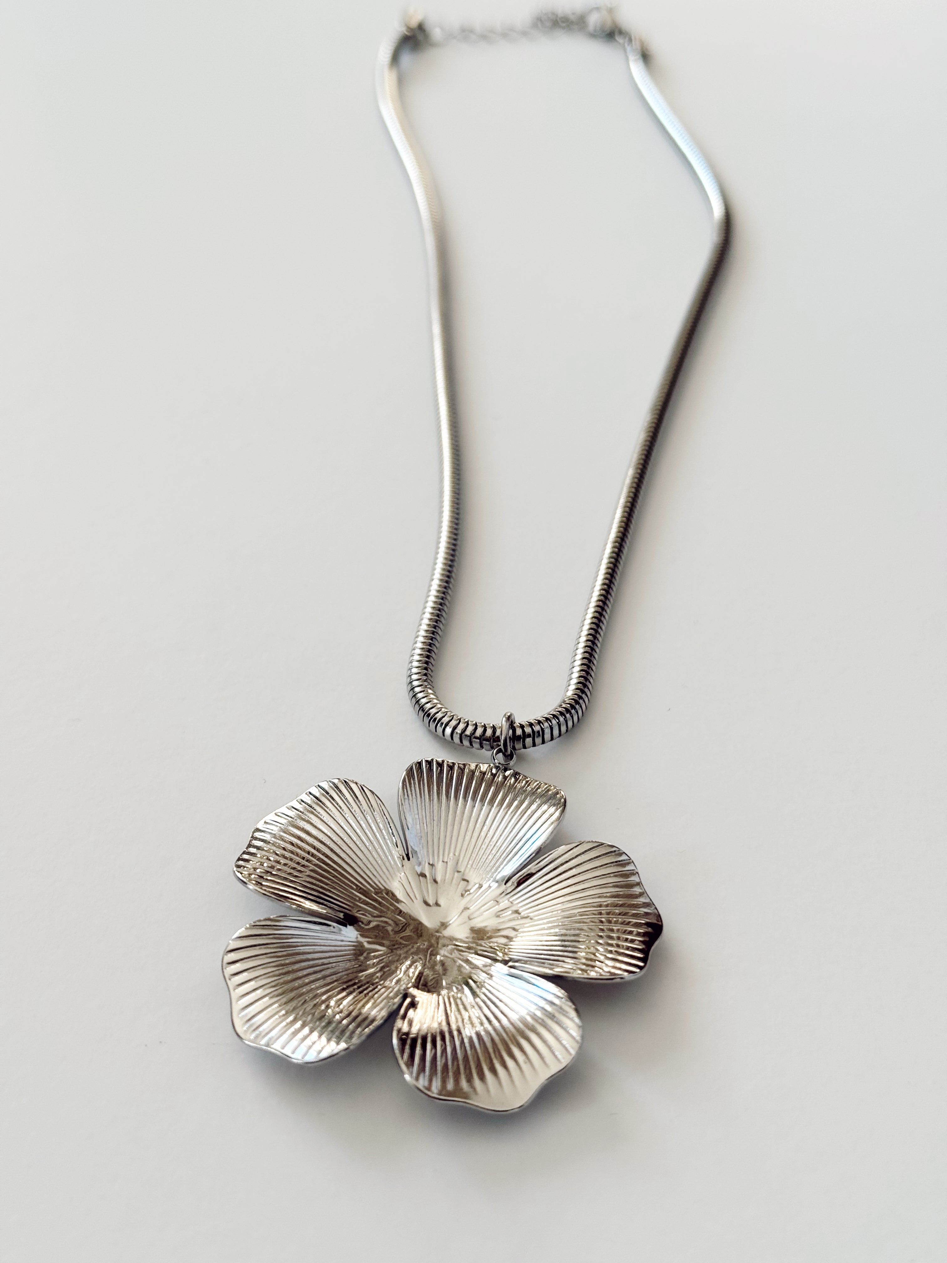 A striking silver-tone statement necklace featuring a large textured flower pendant. Designed on a sleek snake-style chain, it sits beautifully on the neckline while adding shine and elegance. Adjustable closure for comfortable fit.