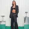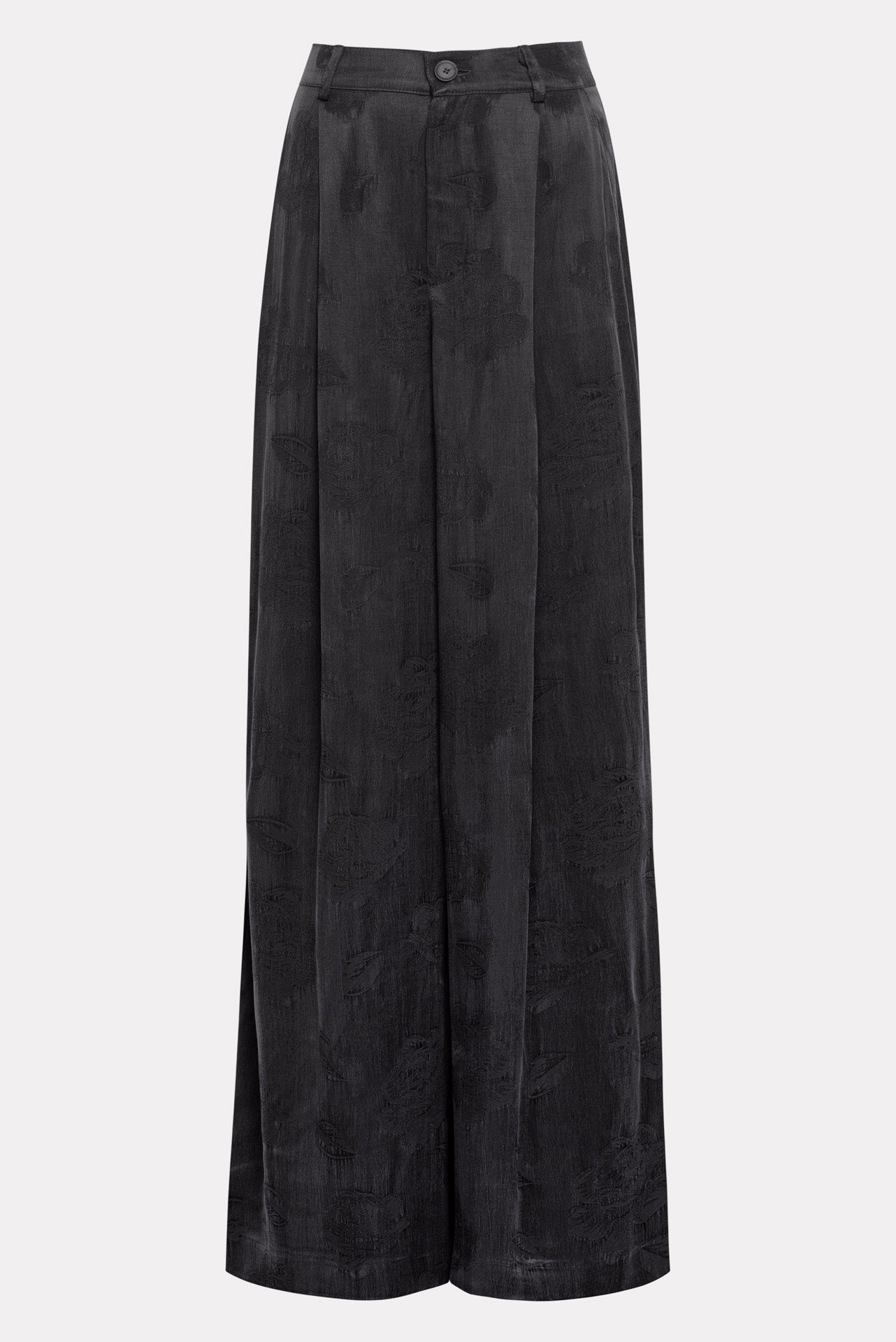 The Inner Voice Pants are wide-leg trousers in anthracite with a subtle jacquard floral pattern. They feature a mid-rise waist, pleated front, side pockets, and a single button with zip closure. The long, flowing cut adds comfort and style for any occasion.