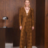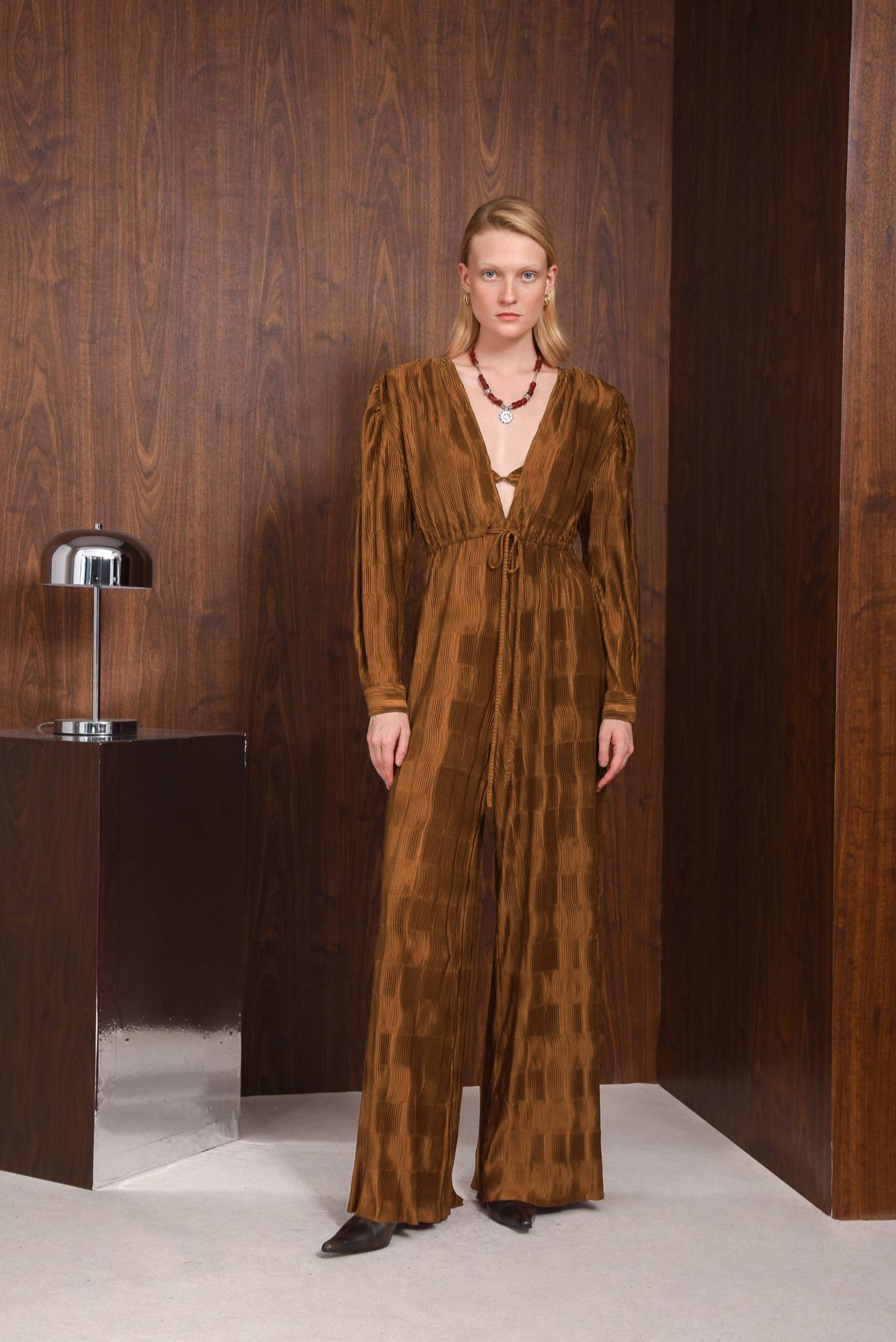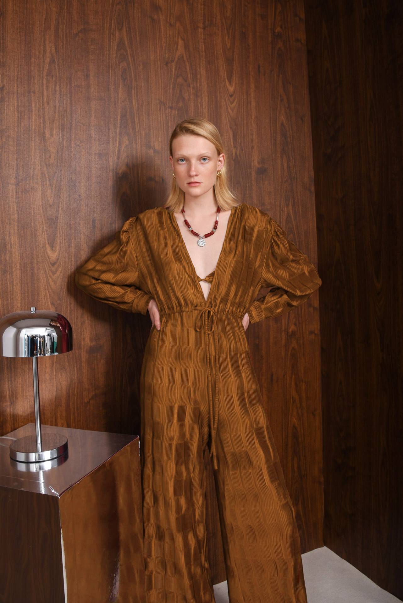 The Role Jumpsuit features fluid wide legs, long sleeves, and a plunging neckline with gathered waist ties for a flattering shape. Its subtly pleated texture elevates movement. Each jumpsuit includes a matching triangle top, perfect for wearing underneath or styled separately.