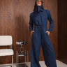 The Trust jumpsuit is crafted in dark blue denim with a relaxed, wide-leg fit. It features a classic shirt collar, button-up front, long sleeves with buttoned cuffs, and a single chest pocket. The adjustable drawstring waist adds shape, while side pockets bring functionality. Designed to keep you stylish and comfortable with no effort.