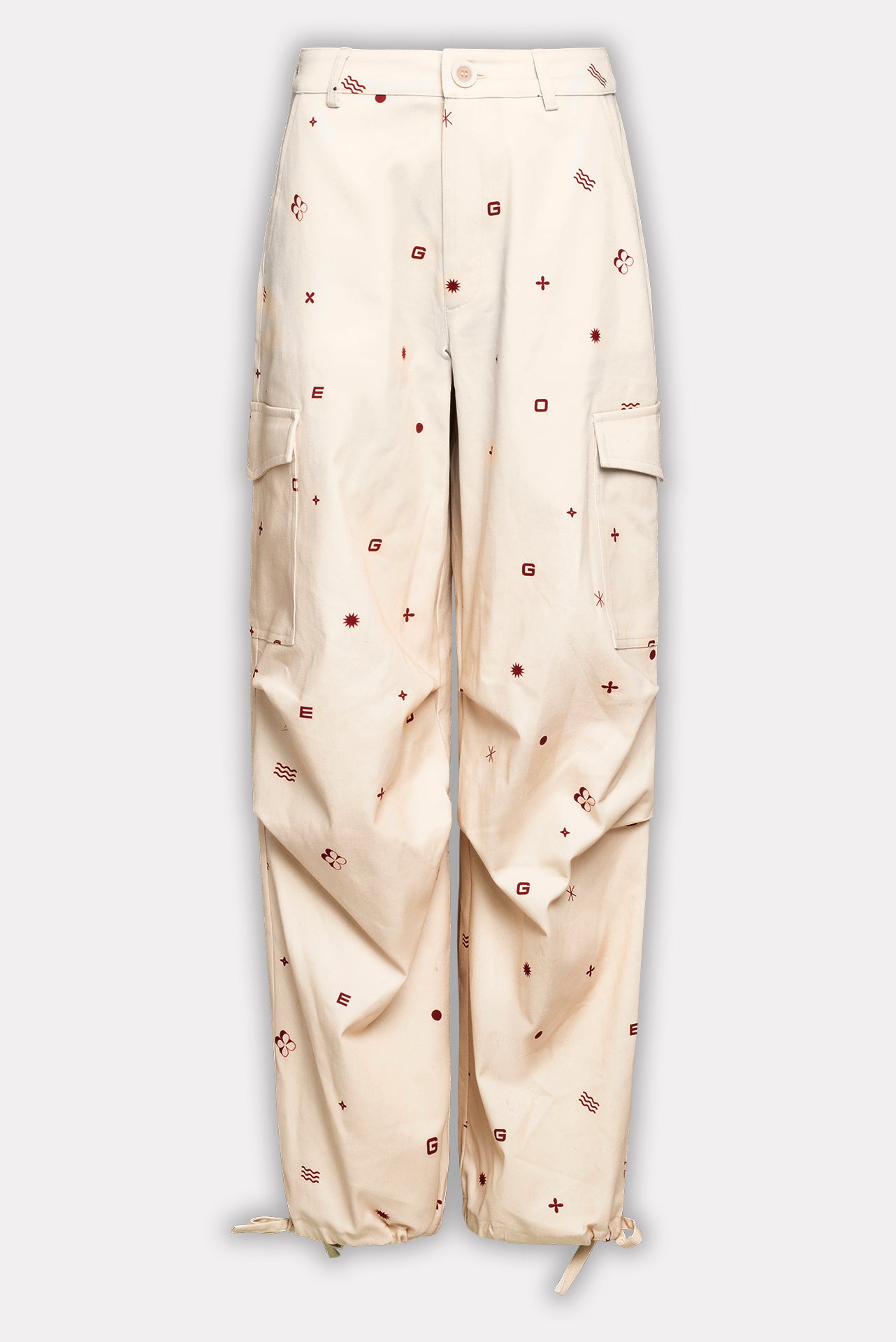 The Ego cargo pants are high-waisted with a relaxed straight leg. Made from sturdy beige cotton printed with red geometric symbols, they feature side and back pockets, large flap cargo pockets, belt loops, and drawstring hems for adjustable shape and fit.