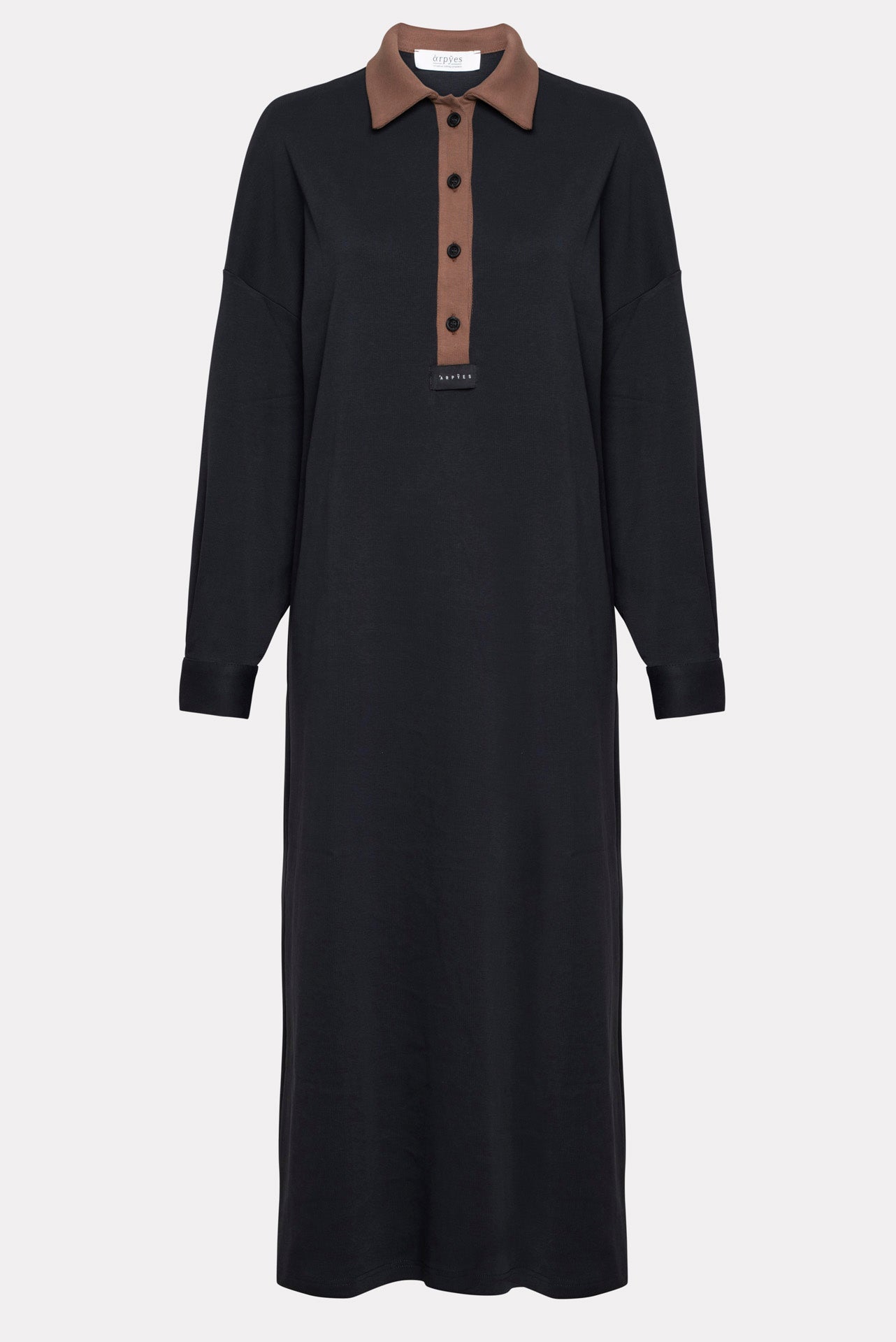 Real dress in blue black features a contrasting brown collar and button placket, long sleeves with buttoned cuffs, and a detachable belt to shape the waist. Made from soft fabric, it offers a relaxed fit that’s easy to wear from day to night.