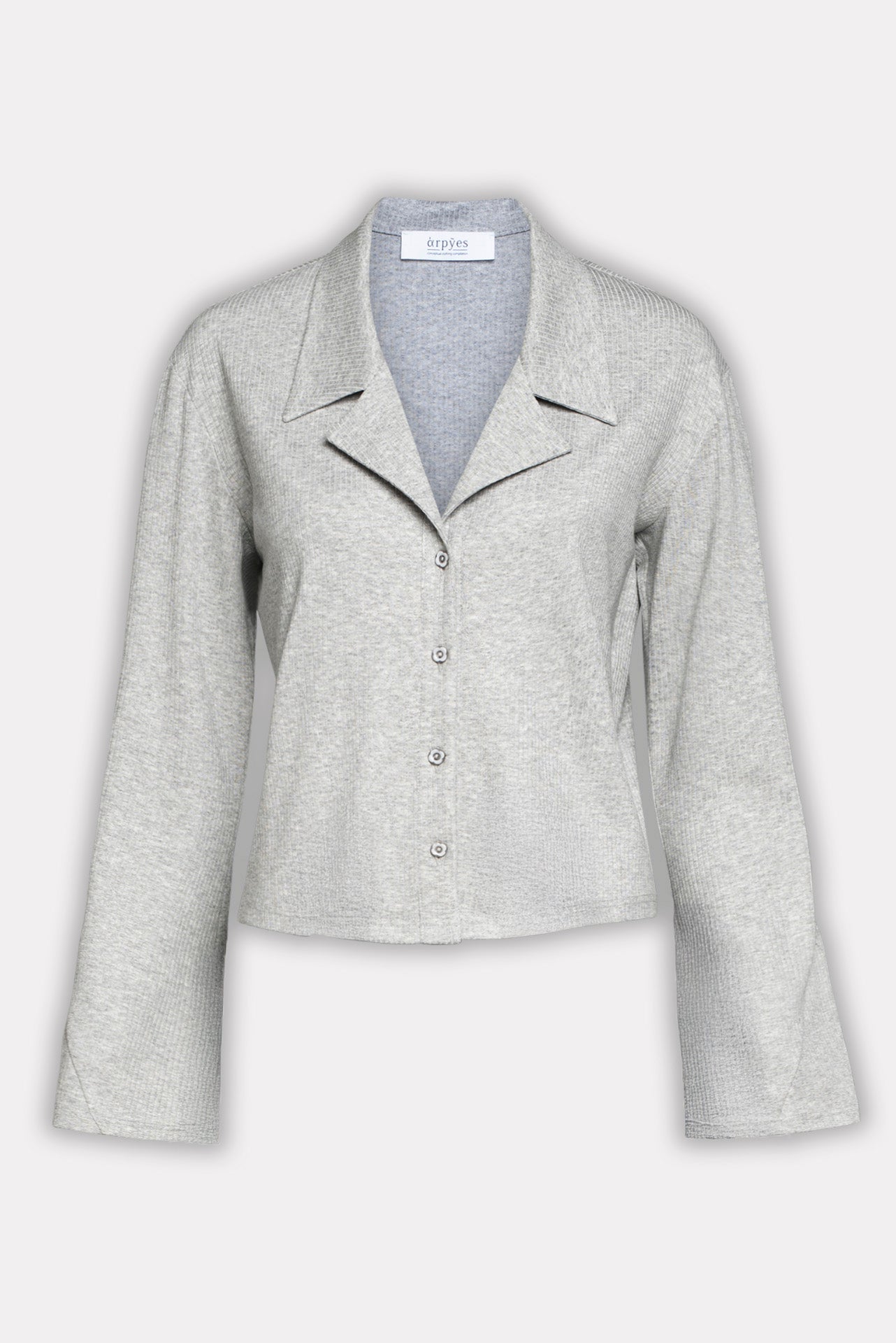 The Reflect top is a cropped, long-sleeve shirt with a relaxed fit and structured collar. Made from soft, ribbed fabric, it features a button-down front and subtly flared sleeves for an effortless flow. The lightweight texture makes it perfect for layering or wearing solo.