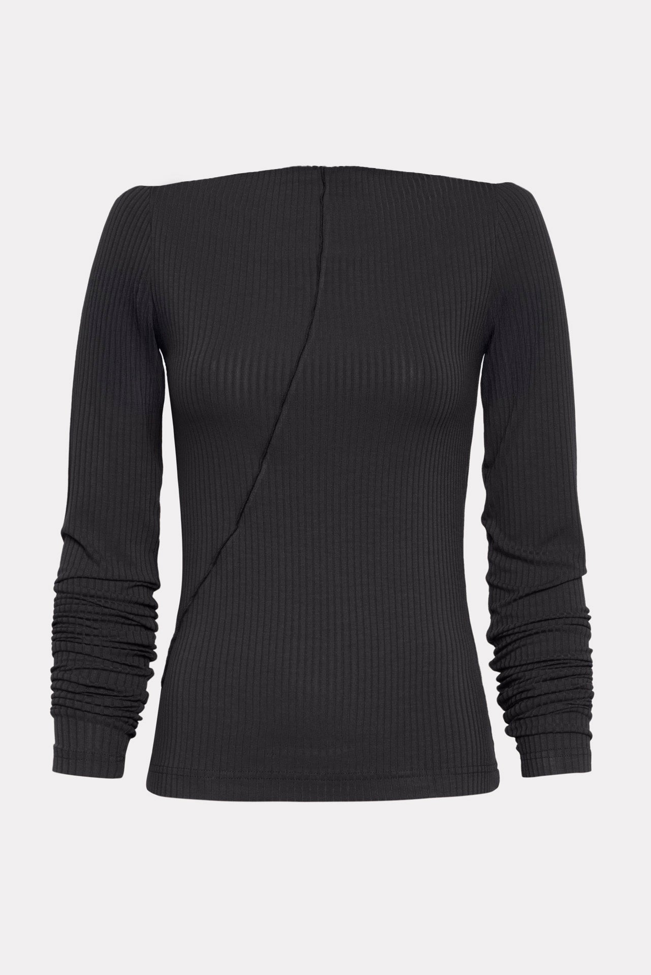 The Respect top is a fitted long-sleeve blouse made from soft ribbed fabric for comfort and stretch. It features a boat neckline and a unique diagonal seam detail across the front, adding a modern twist to a timeless design.