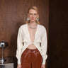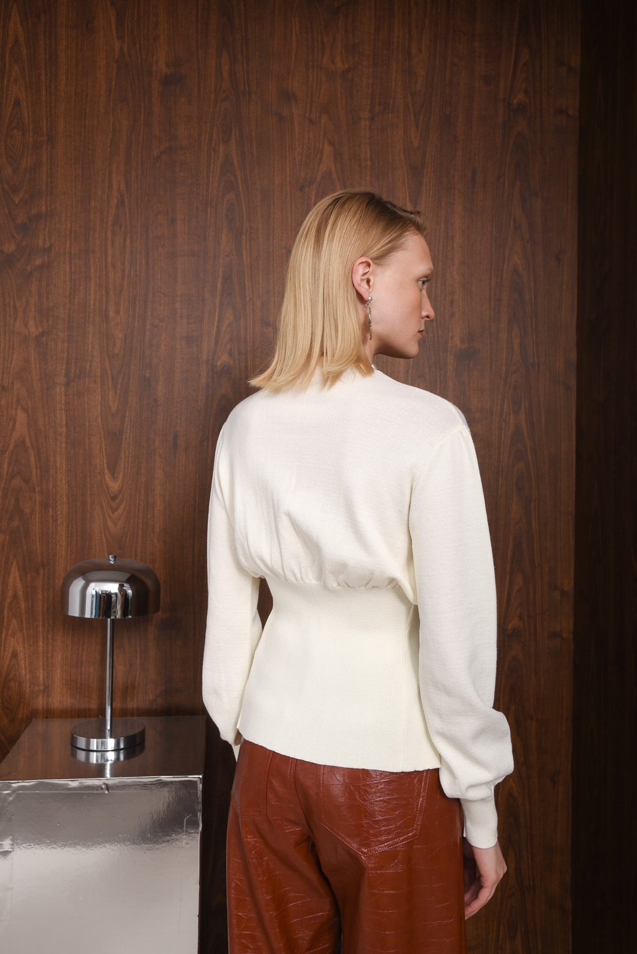 The Thought cardigan is a soft, fitted knit with a deep V-neck and a single front button closure. It features a gathered bust detail, ribbed waist, and long puffed sleeves with snug cuffs for a flattering silhouette. Made from soft knit fabric, it’s both comfortable and stylish — perfect for any occasion.