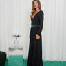 The Change Dress features a deep V-neckline, long fitted sleeves, and a flowing sheer maxi silhouette with subtle vertical texture. Front buttons shape the bodice, while the lightweight fabric creates elegant movement. Wear it over the Peace undergarment dress or style it with belts and layers for a striking, versatile look.