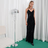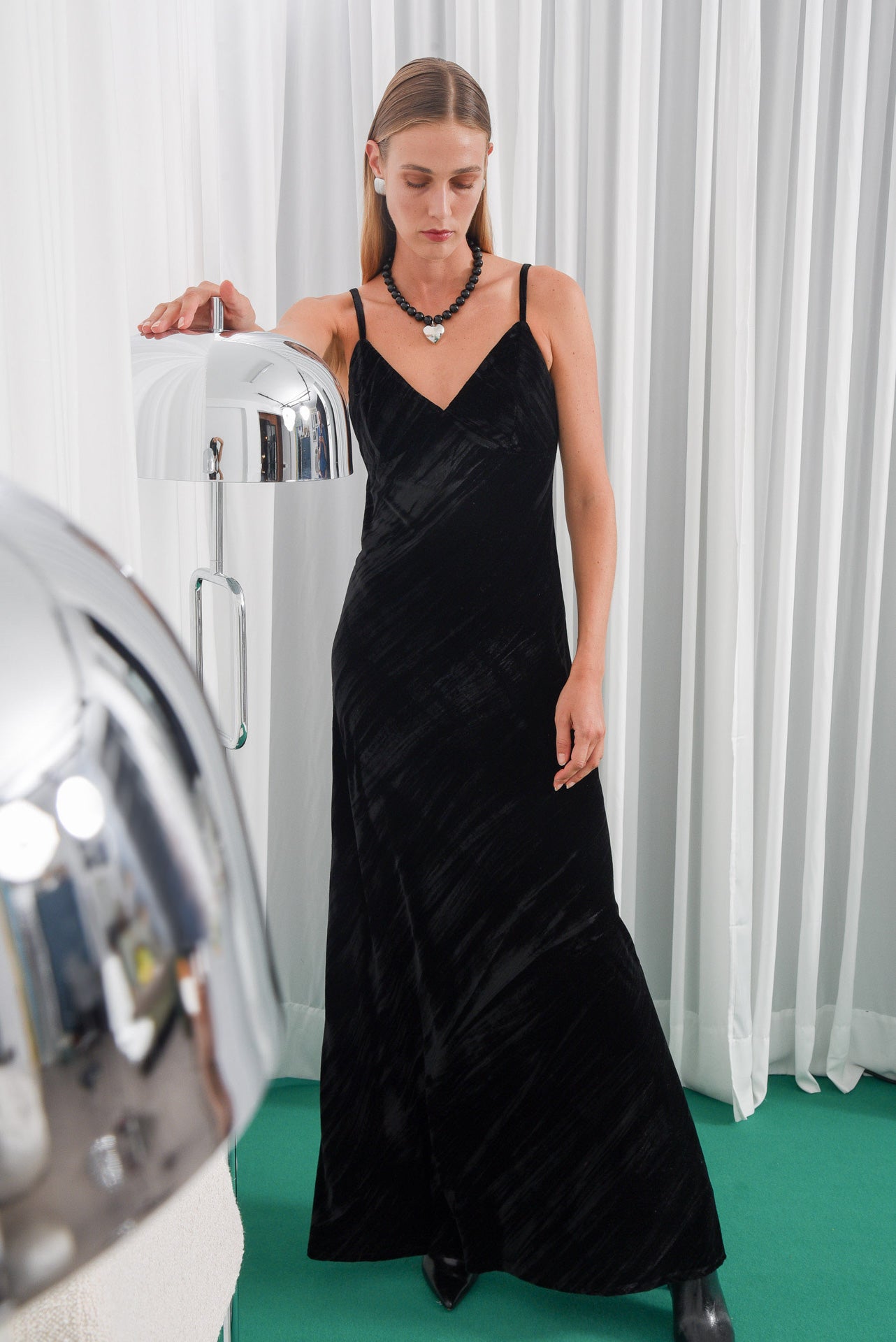Fearless Maxi Dress, a long dress made from soft fabric with velvet finish, rich texture and natural shine. It features a flattering V-neckline, thin adjustable straps, and a bias-cut design that follows the body’s shape. The floor-length silhouette flows smoothly, creating an elegant and timeless look.
