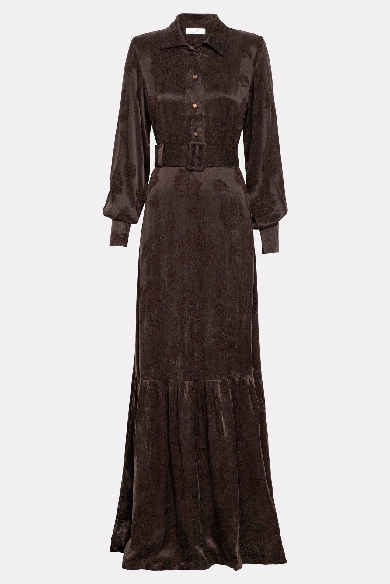 The Inner Voice maxi dress is crafted from dark jacquard floral fabric. It features a pointed collar, button front, and long sleeves with buttoned cuffs. A wide belt defines the waist, while the floor-length skirt finishes with a soft, flowing ruffle hem for graceful movement.