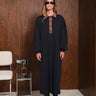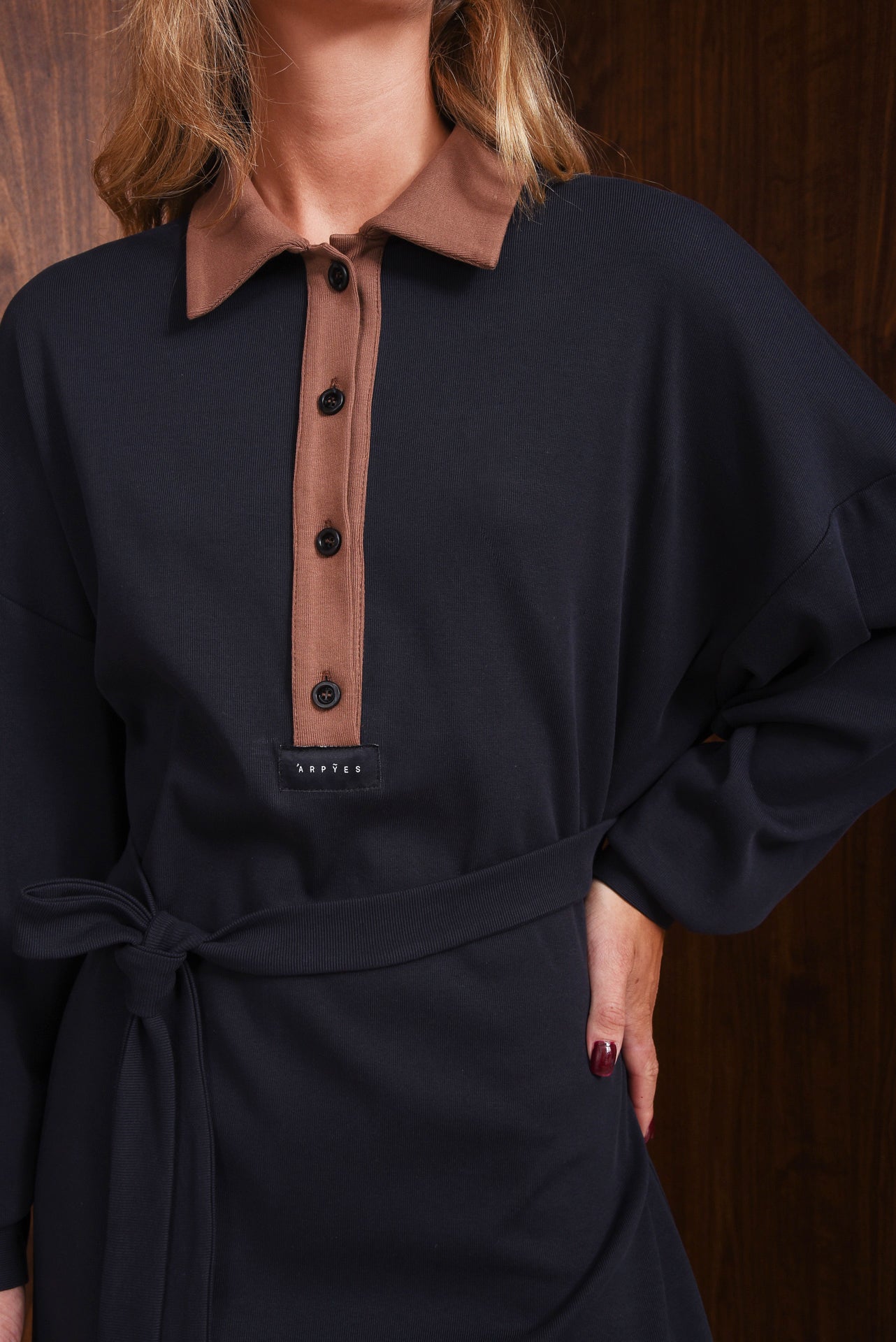 Real dress in blue black features a contrasting brown collar and button placket, long sleeves with buttoned cuffs, and a detachable belt to shape the waist. Made from soft fabric, it offers a relaxed fit that’s easy to wear from day to night.