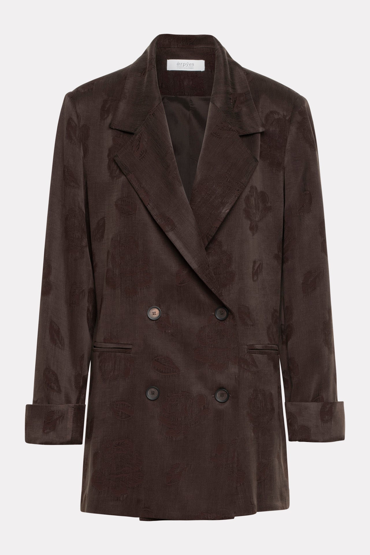 The Inner Voice blazer is cut in a relaxed, oversized fit with sharp lapels and long sleeves. Crafted from jacquard fabric, it features a subtle tonal floral pattern, front flap pockets, and a double-breasted button closure. Designed with a straight silhouette and clean lines, this blazer blends elegance and ease.
