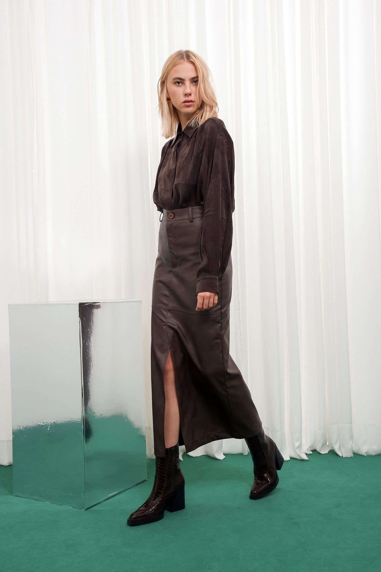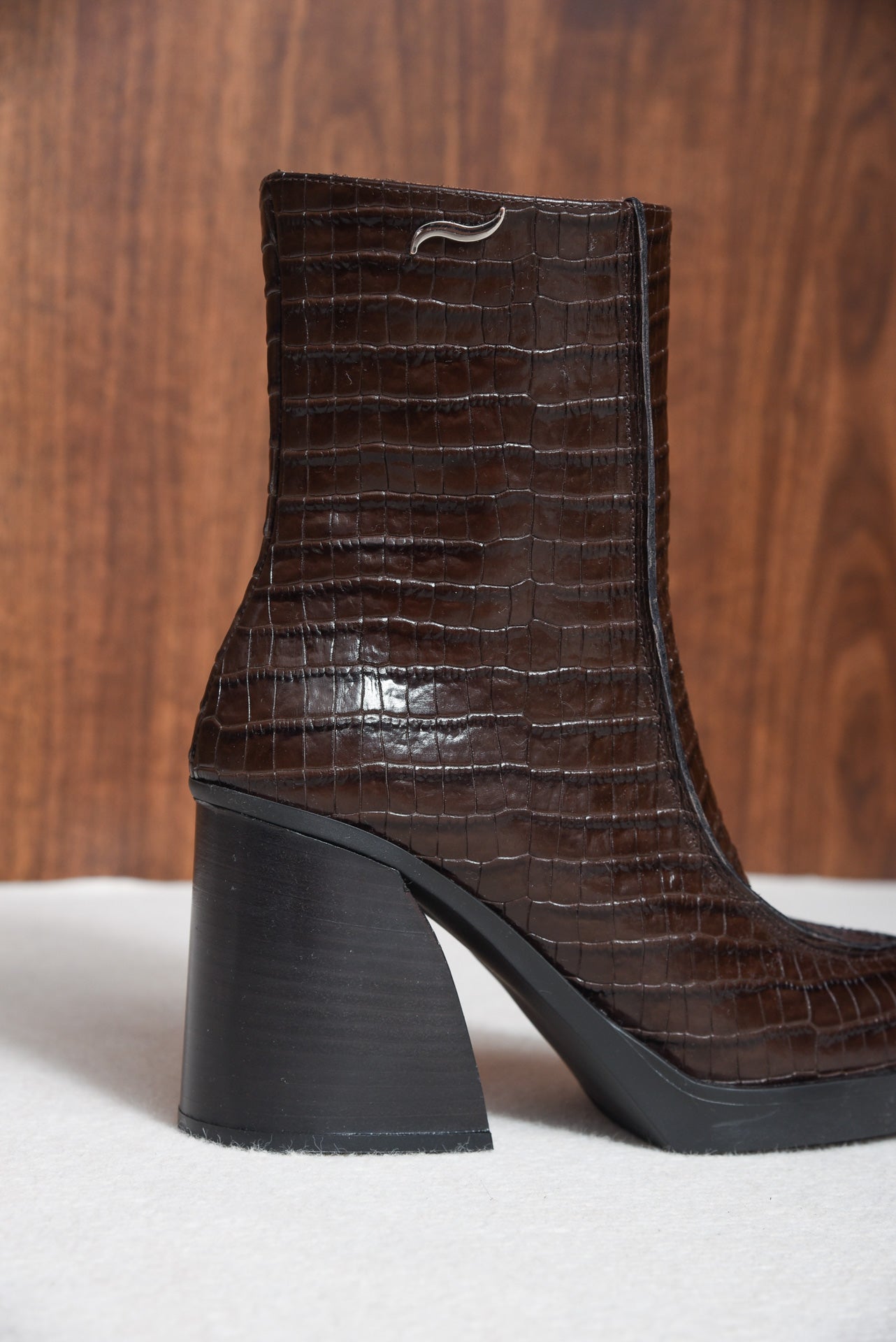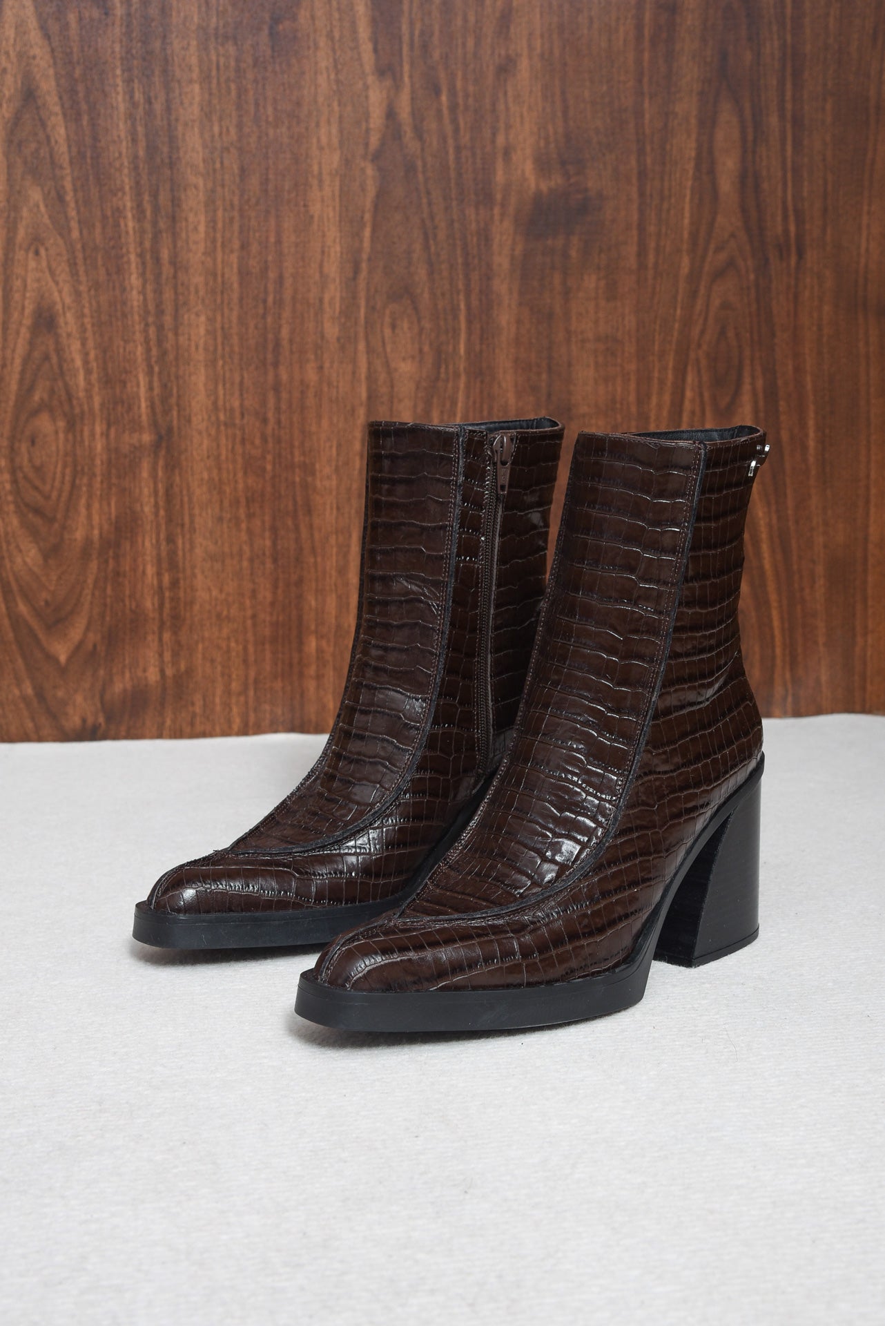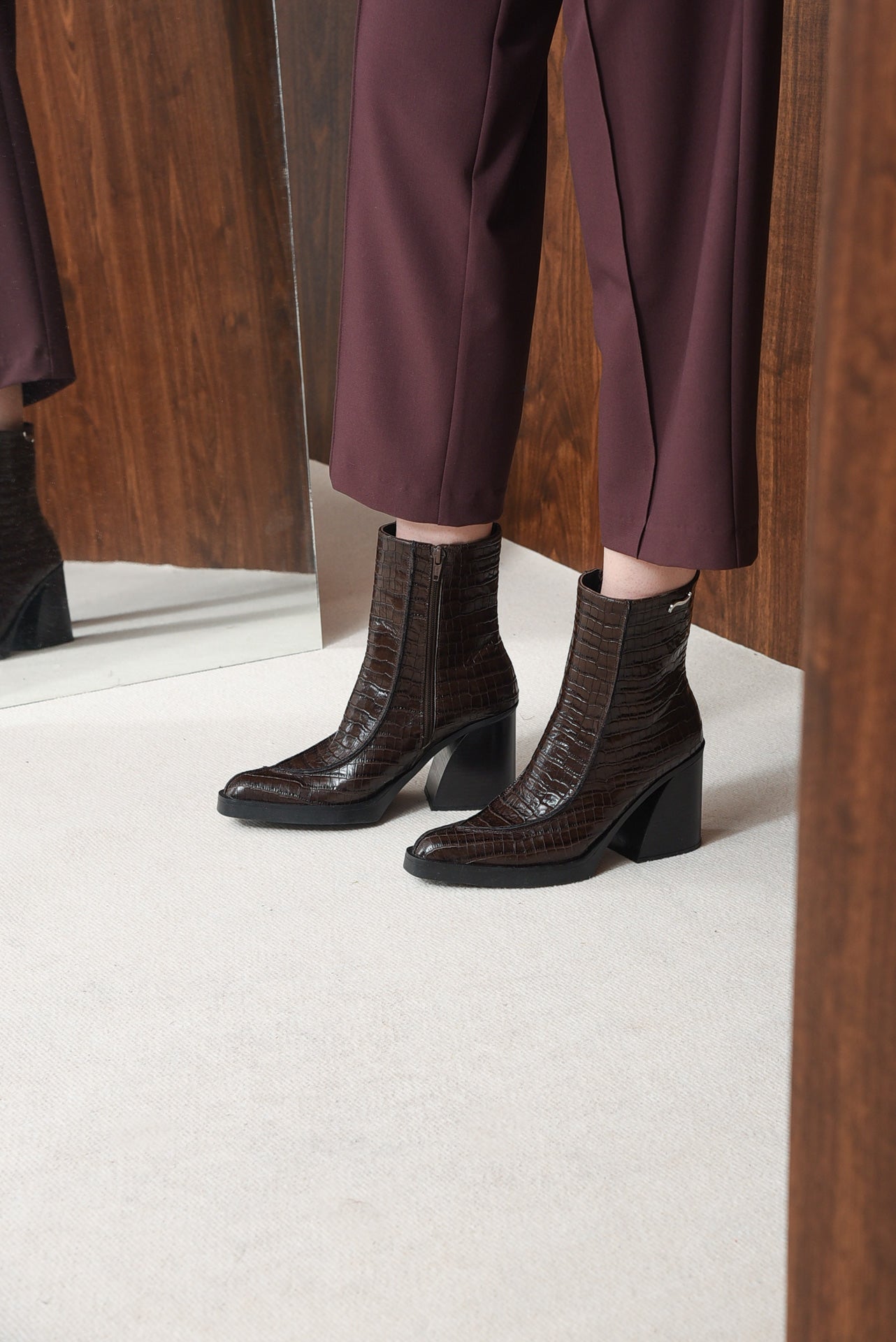 The Exist boots are made from croc-embossed vegan leather with a soft shine and rich texture. Designed with a pointed toe, side zip, and sturdy block heel, they offer a modern, structured look that’s easy to wear. Finished with a subtle metallic logo detail for an elegant touch.