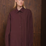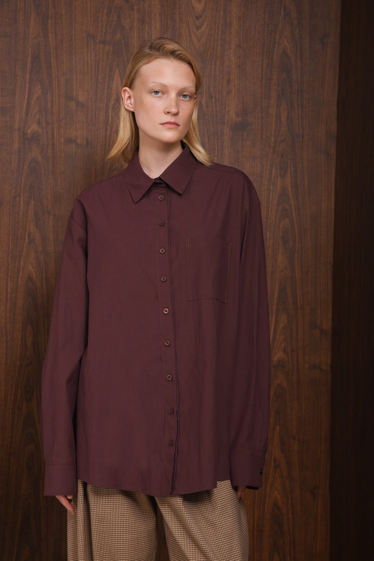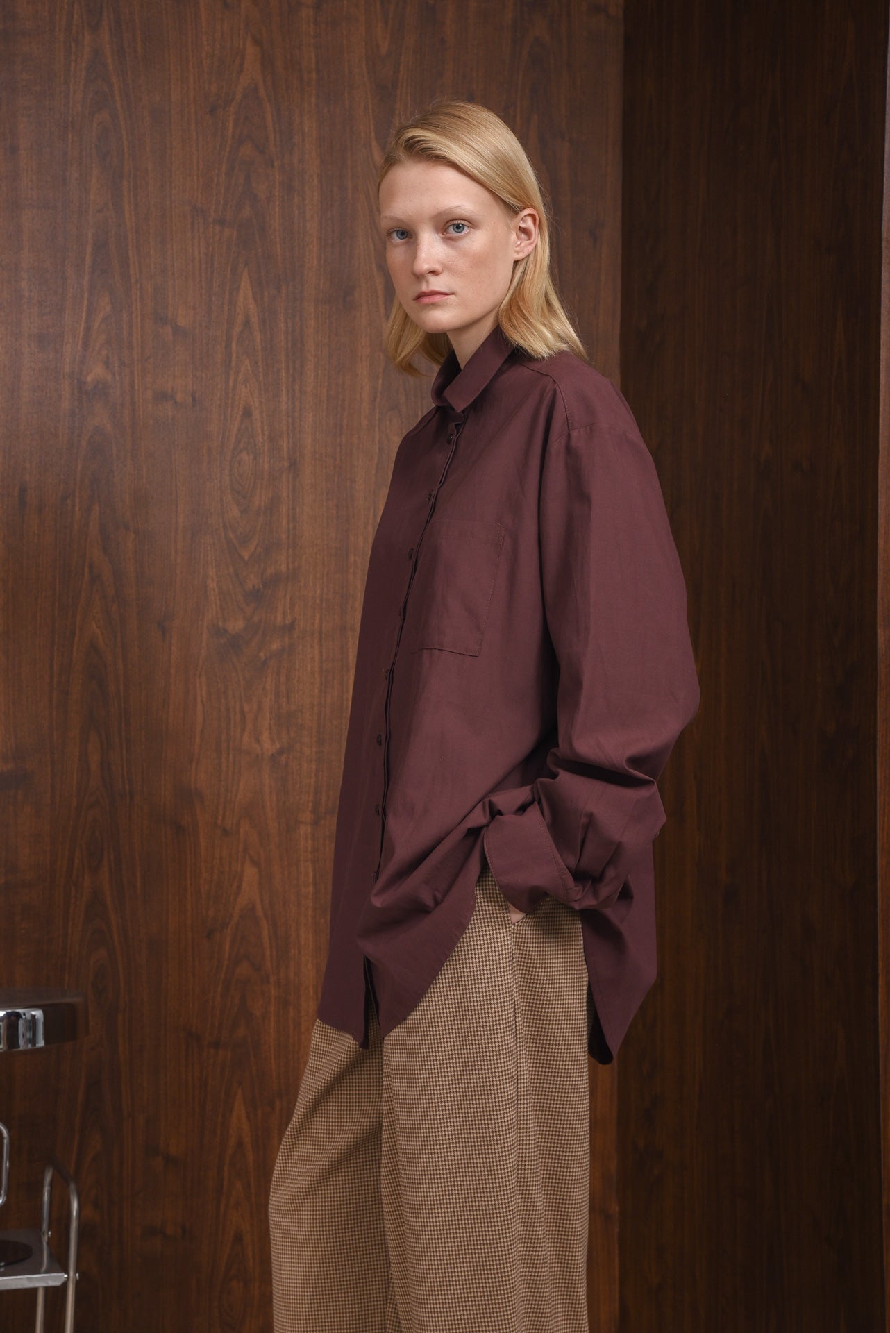 The Accept shirt is a timeless oversized button-up crafted from soft fabric. It features a sharp pointed collar, long sleeves with buttoned cuffs, and a single chest pocket. Designed with a relaxed fit, it falls longer at the back than the front, creating an effortless silhouette.