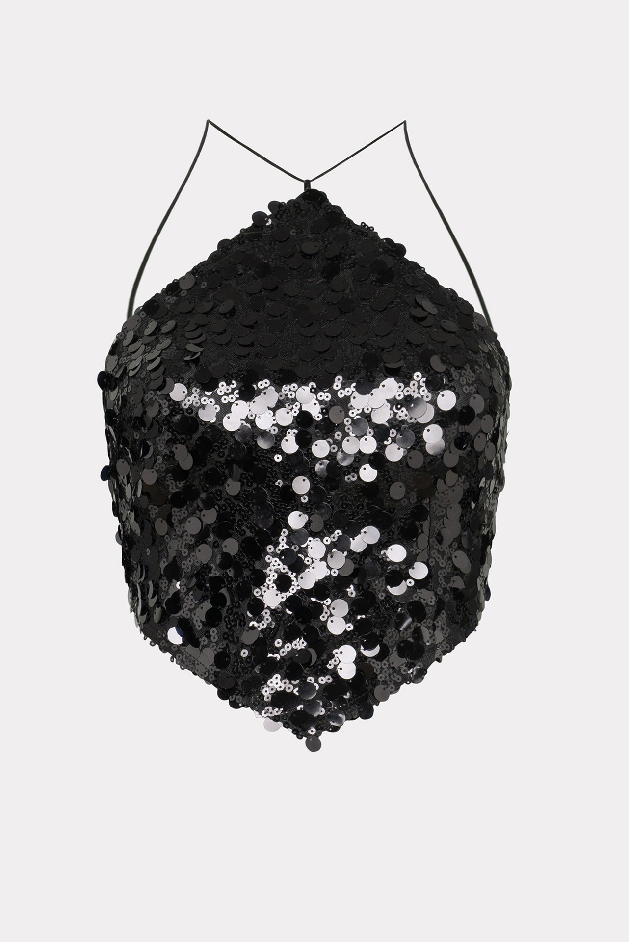 The Emotional top is a statement halter design covered in large, shimmering sequins. It features a pointed hem and an open back with delicate crisscross straps that tie for an adjustable fit. Lightweight and eye-catching, it’s the perfect piece to elevate any night-out look.