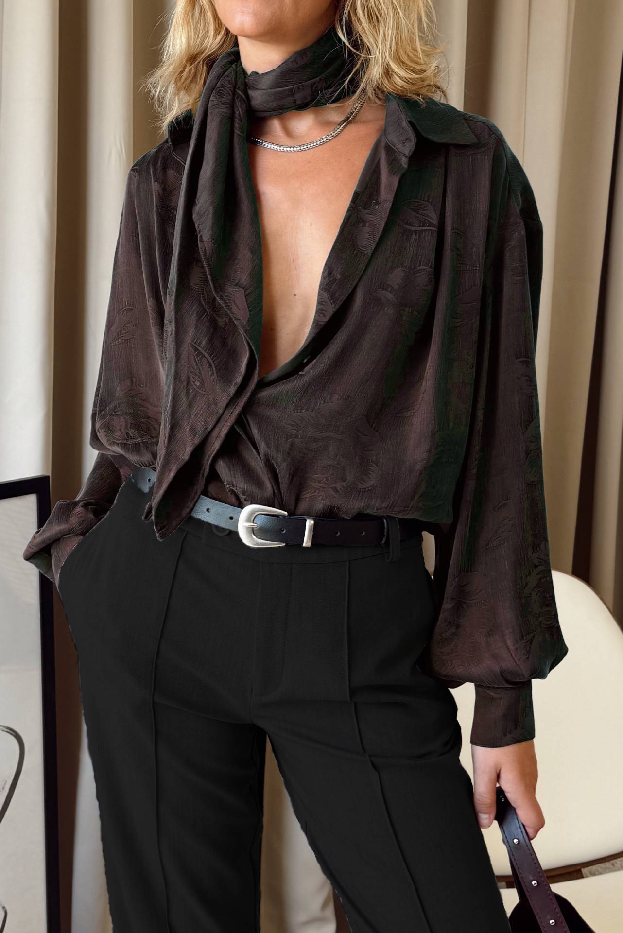 The Inner Voice Shirt is crafted from lightweight jacquard fabric with a subtle floral texture. It features a relaxed silhouette, soft drape, pointed collar, and wide cuffed sleeves. Designed with a fluid fit for versatile styling, it can be worn open or tucked in.