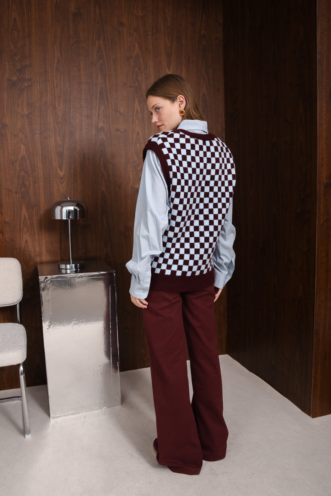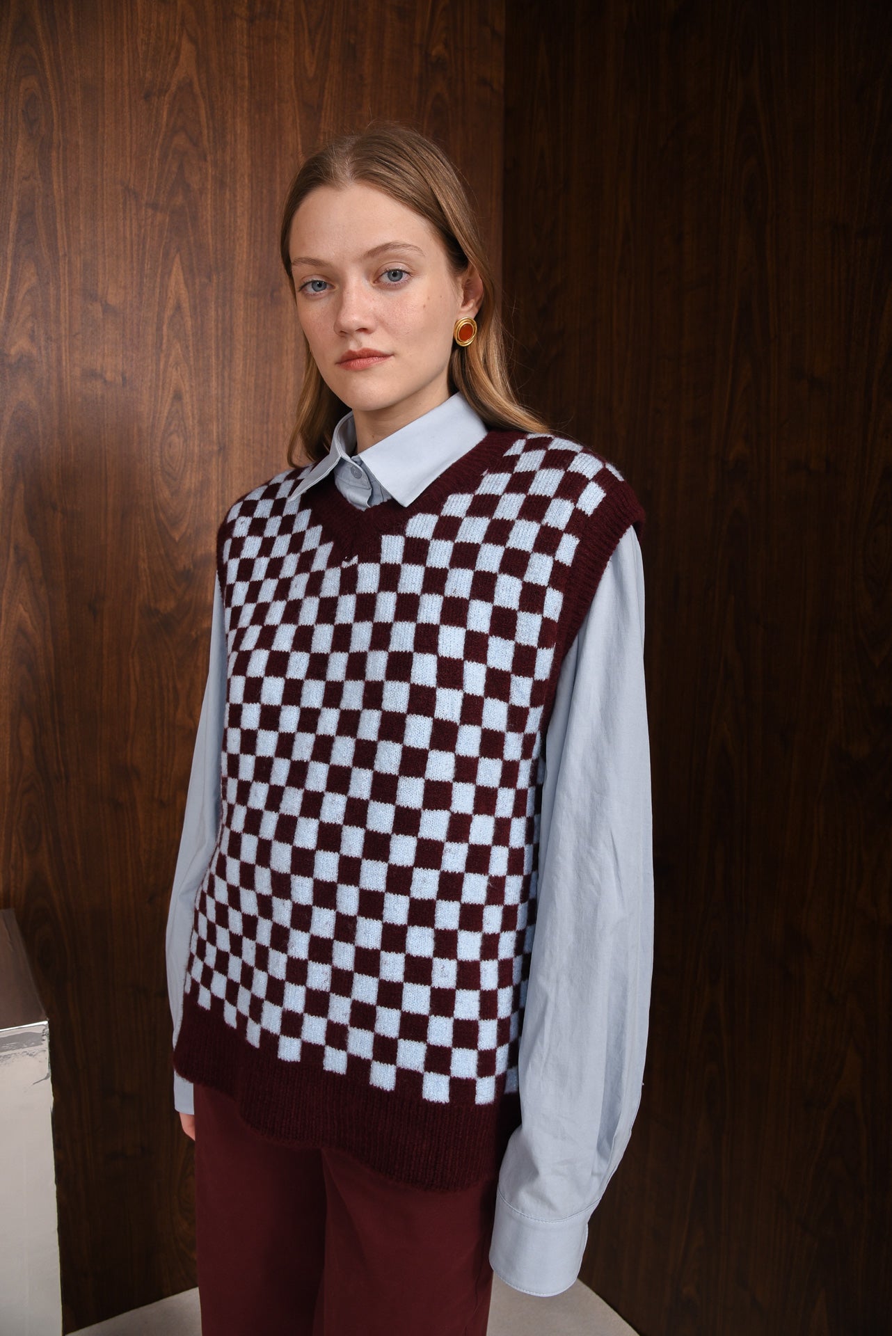 Manner Knitted Vest, a soft, cosy vest with a bold checkered pattern for everyday layering. Designed with a relaxed fit, V-neckline and ribbed trims for structure. Easy to wear over shirts or tops, adding warmth and style. A simple, comfortable knit that works with any outfit.