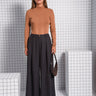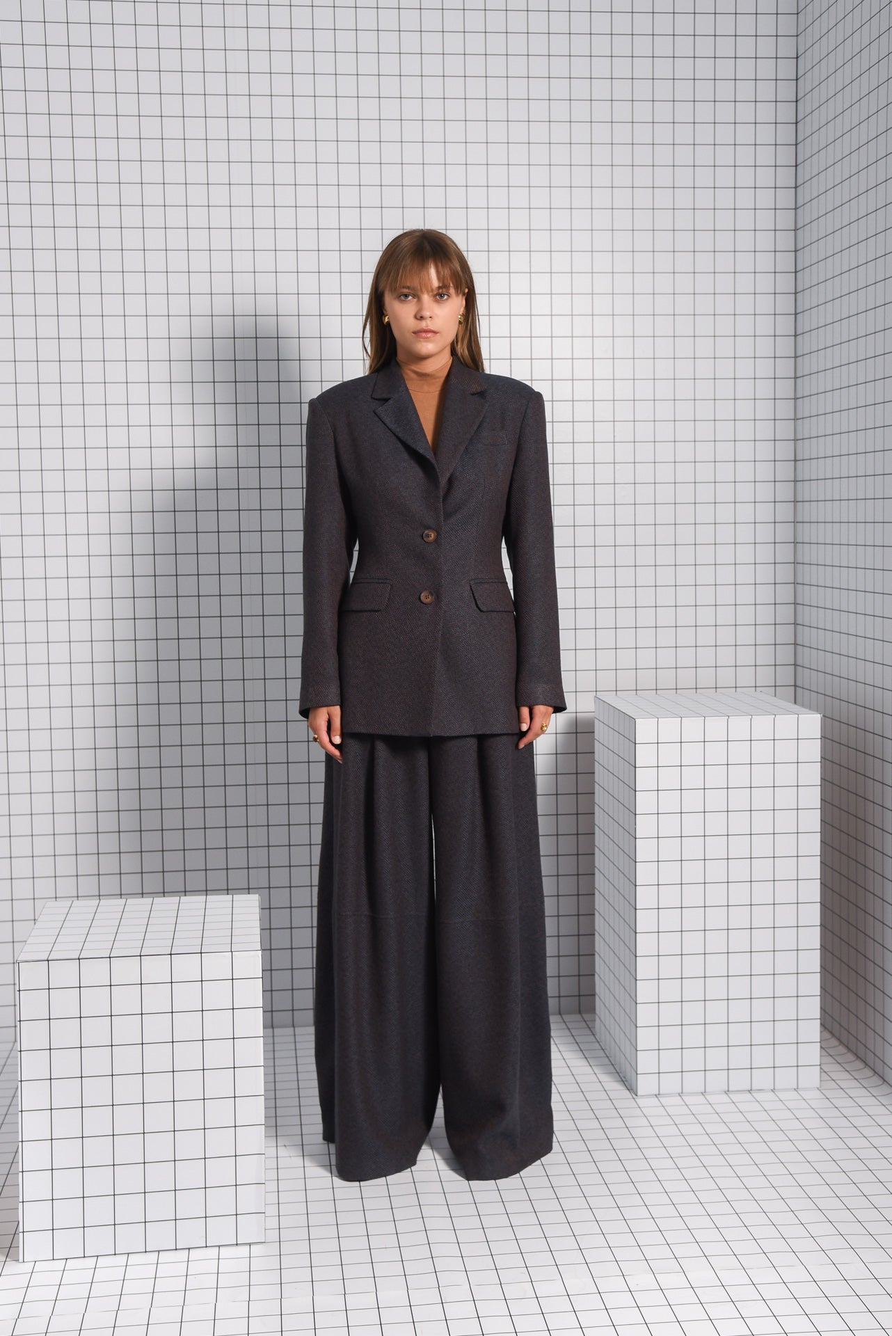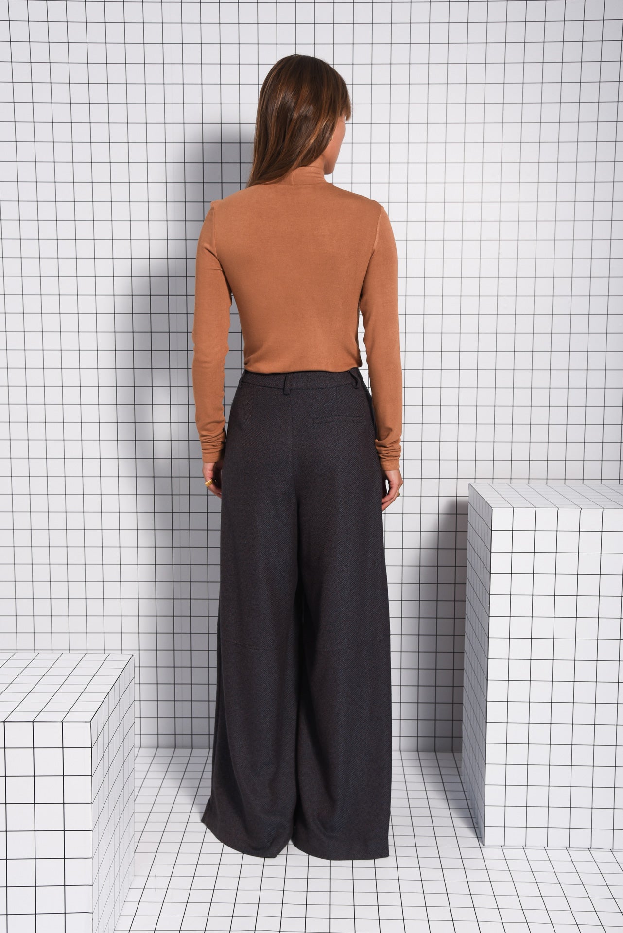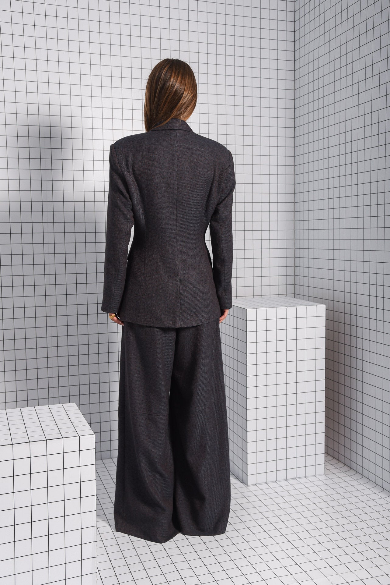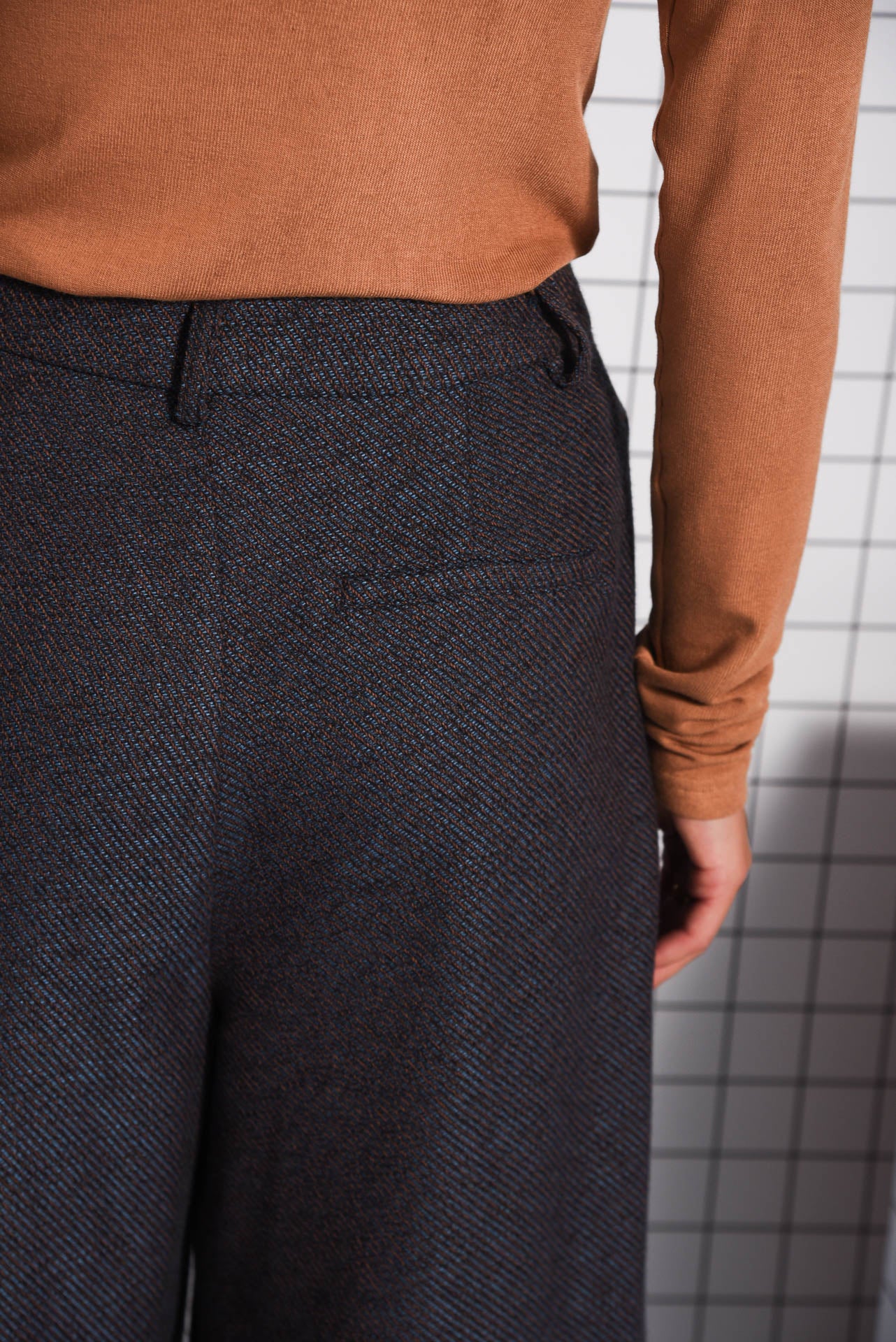 The "Innovative" pants feature a wide-leg silhouette. Made from a textured fabric with subtle dark tones, they offer a high-waisted fit with a front button closure. They are designed with discreet pockets and pleating for added volume. Pair them with a tailored blazer or casual top for versatile styling options.