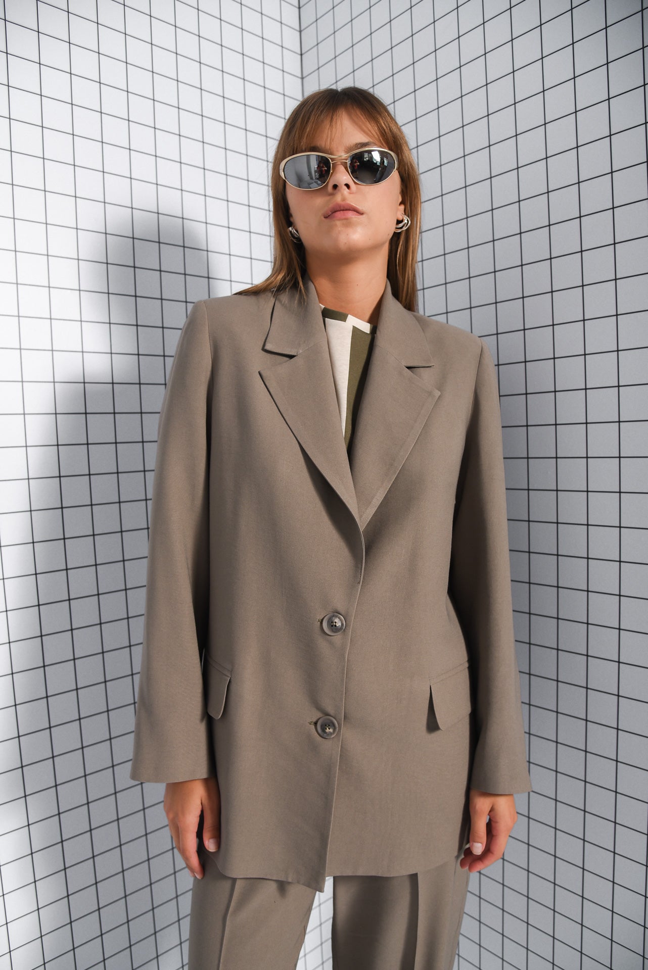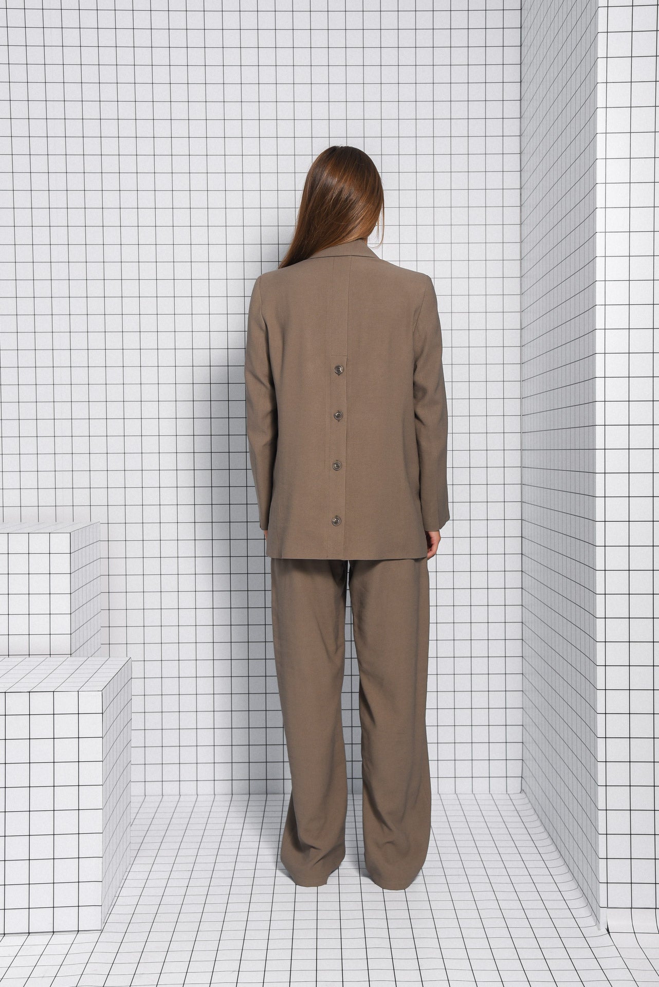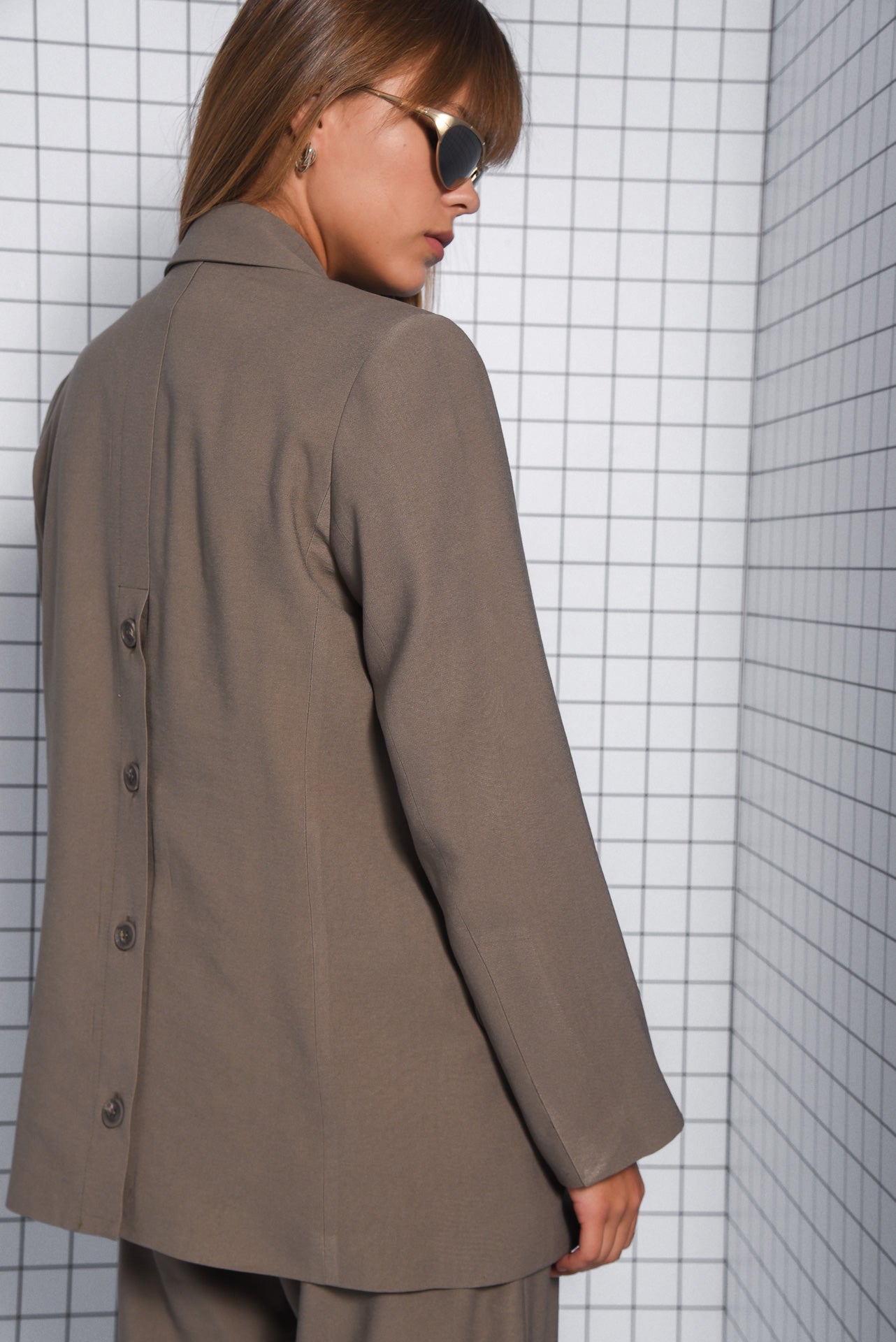 Upgrade your wardrobe with the Navigate khaki blazer, featuring a unique button-up back design for a modern twist. The tailored fit and structured shoulders offer a sophisticated silhouette, perfect for both professional and casual events. Pair it with matching trousers for a complete, look, or dress it down with jeans for a more casual vibe.