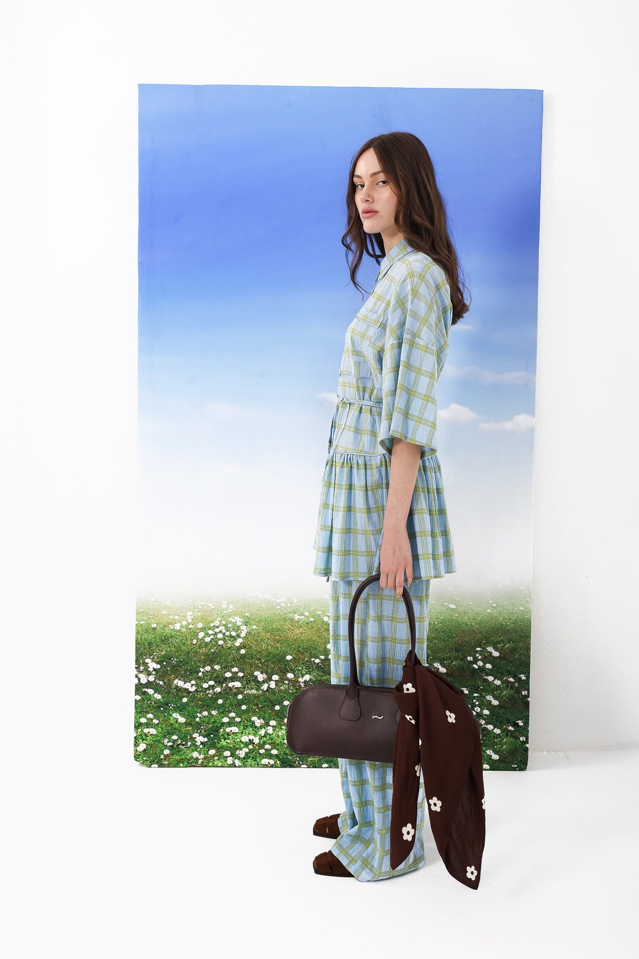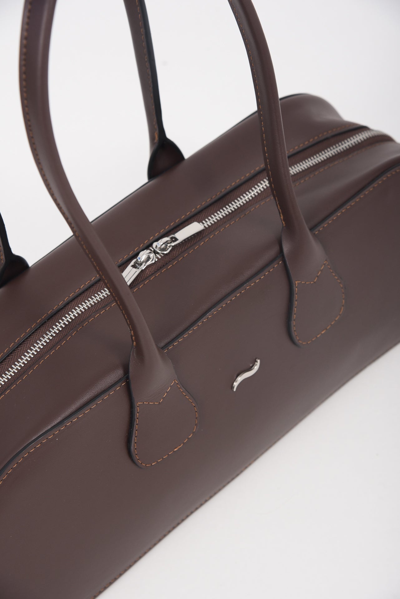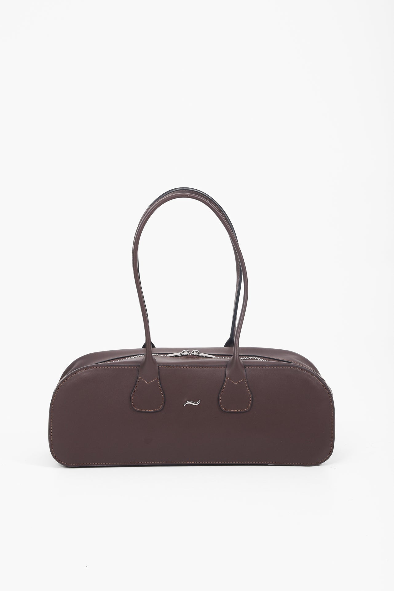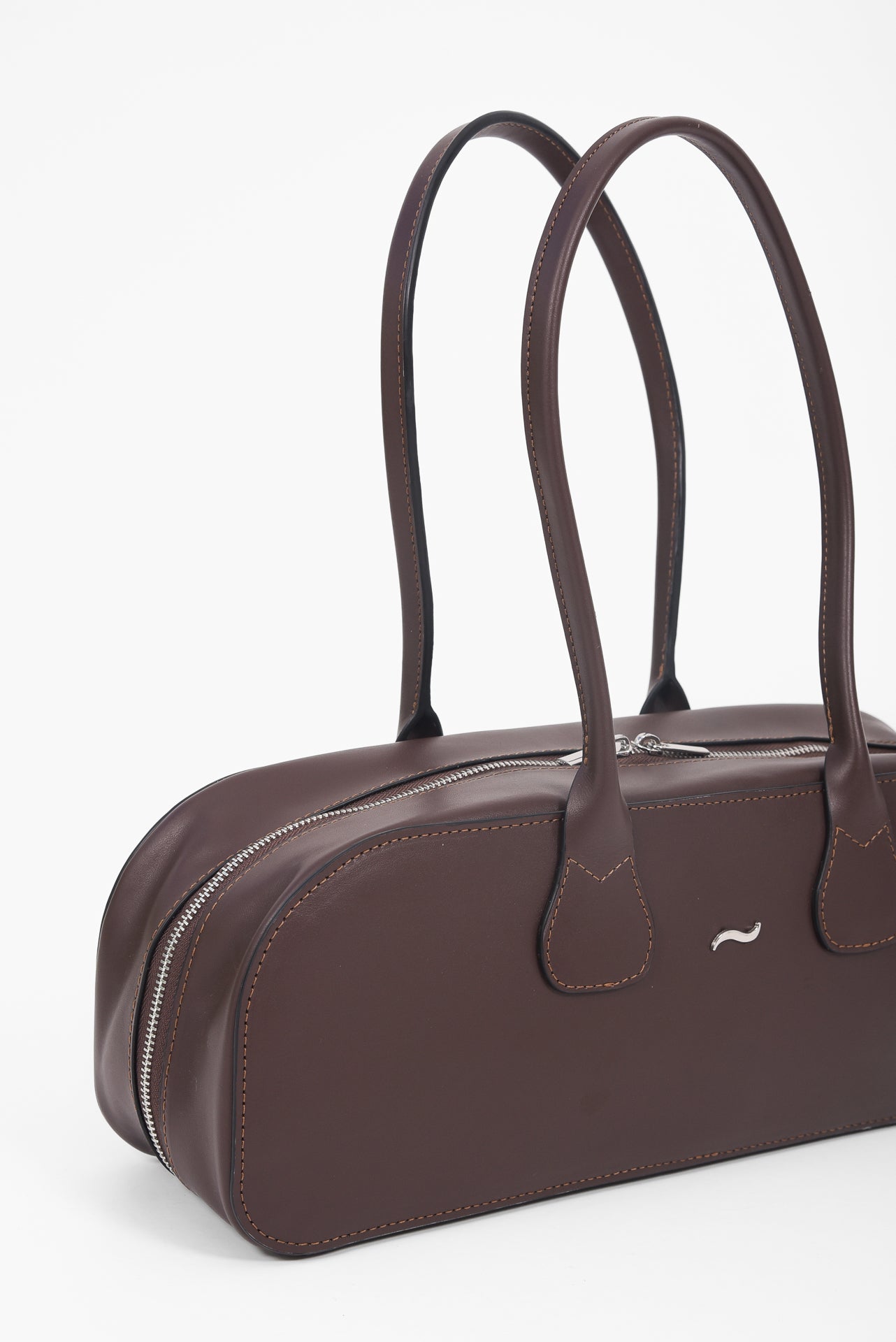 The Nalu Bag is a leather handbag defined by its structured silhouette and clean, minimal design. Crafted from smooth leather, it features double top handles and a zip closure that opens to a spacious interior with an inner pocket for essentials. The sleek shape and refined finish give it a modern, sculptural feel, making it an elevated everyday accessory that transitions effortlessly from day to evening.