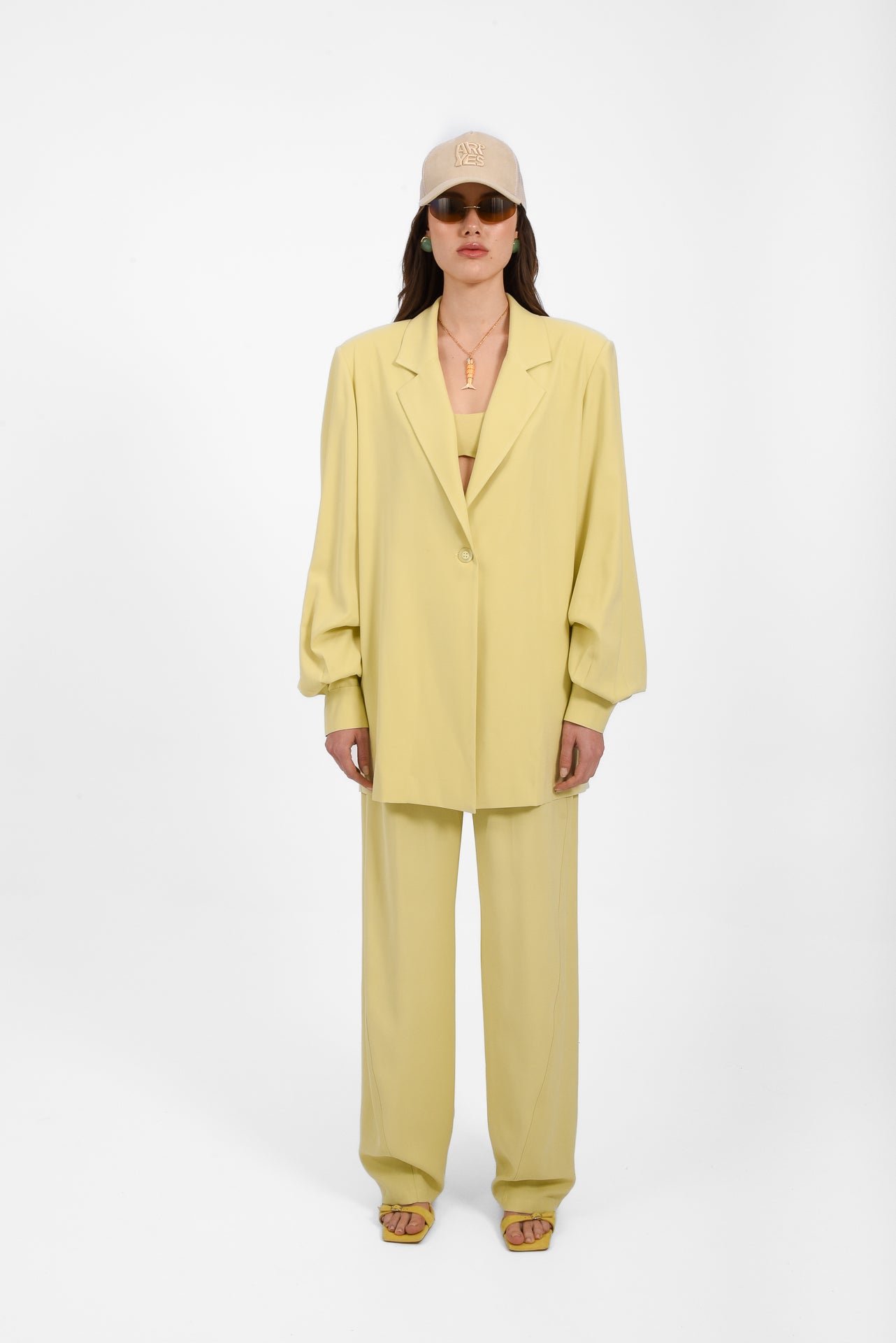 The Noa Tailored Pants combine comfort and modern tailoring with a soft barrel-fit silhouette that gently curves through the leg. Designed in a unique pastel-lime tone with a mid-rise waist, front button closure, belt loops, and functional pockets, they offer effortless movement and structure. Crafted from lightweight fabric, they create a relaxed yet polished look, perfect with the matching blazer or vest.