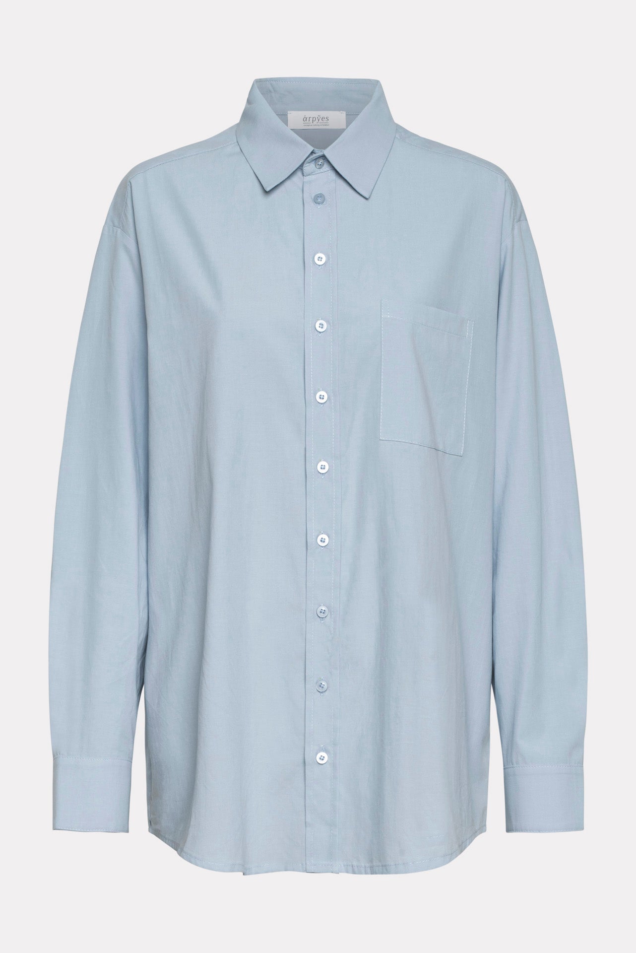 The Accept shirt is a timeless oversized button-up crafted from soft fabric. It features a sharp pointed collar, long sleeves with buttoned cuffs, and a single chest pocket. Designed with a relaxed fit, it falls longer at the back than the front, creating an effortless silhouette.