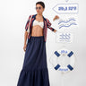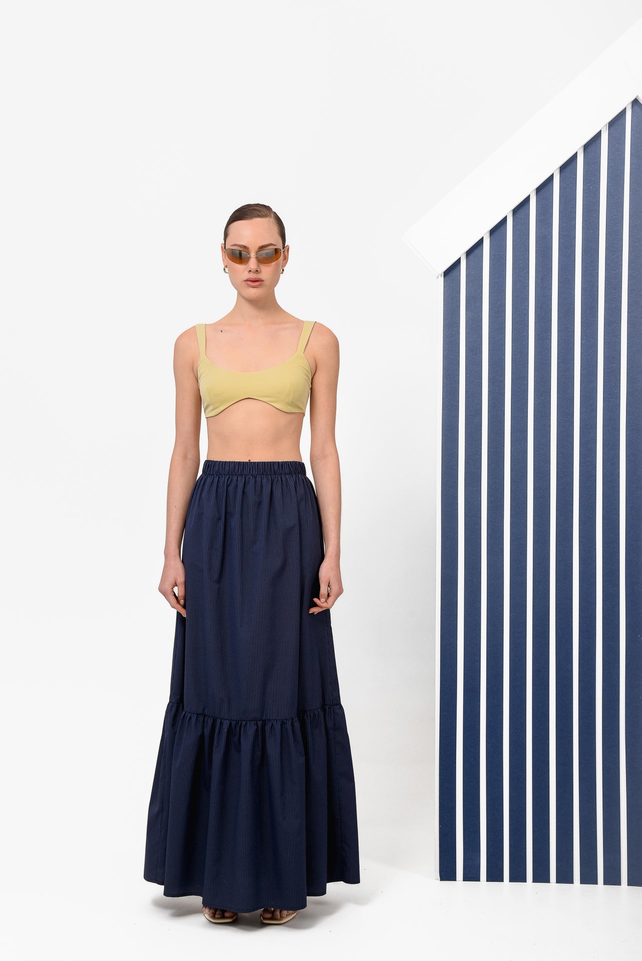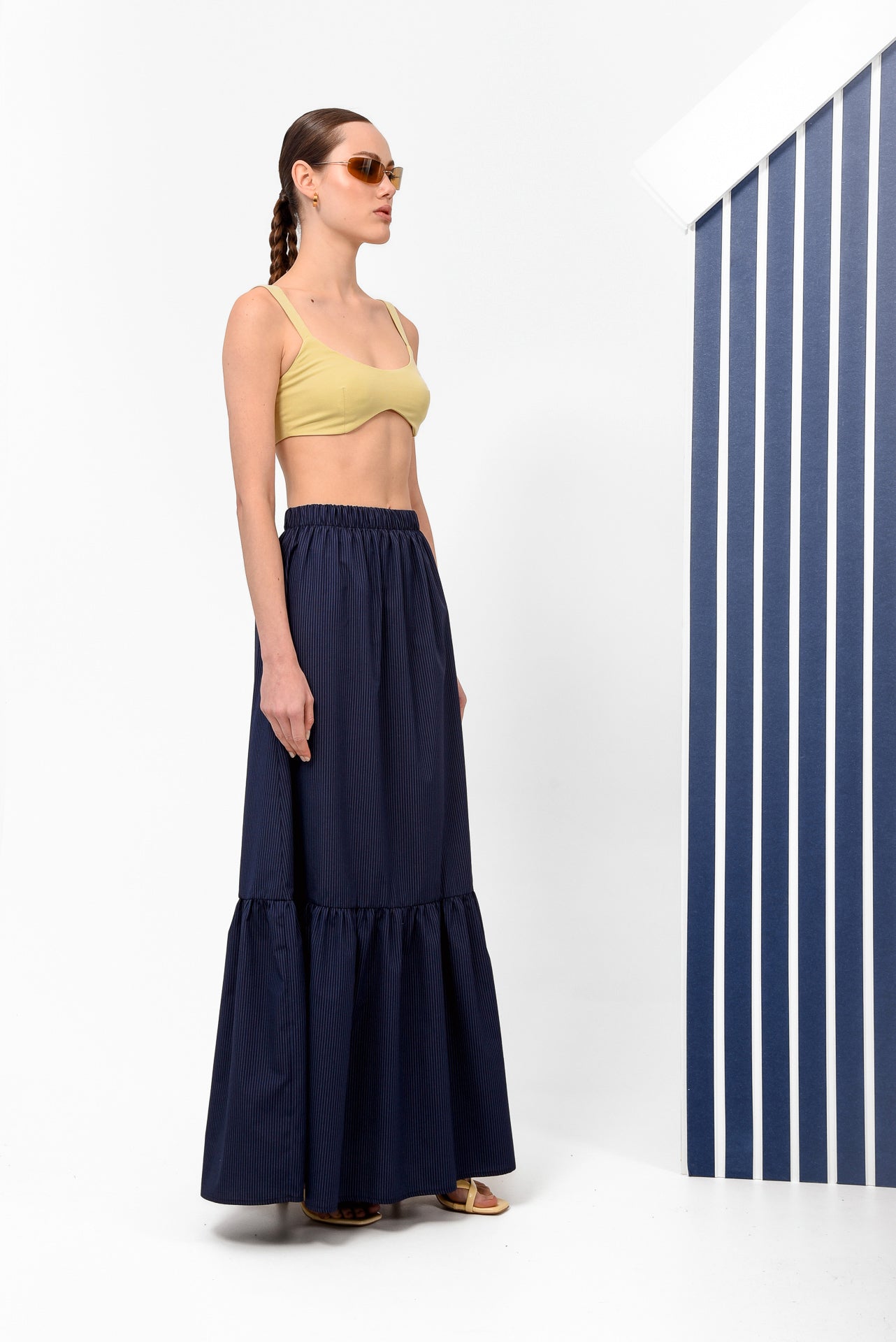 The Azul Skirt is a flowing maxi skirt designed with a relaxed, feminine silhouette. Crafted from lightweight cotton with subtle vertical stripes, it features a comfortable elasticated waistband for an easy fit. The skirt falls in soft volume and is finished with a gathered tier near the hem, adding movement and structure to the long silhouette. Effortless and versatile, it pairs easily with fitted tops, shirts, or lightweight knits for everyday wear.