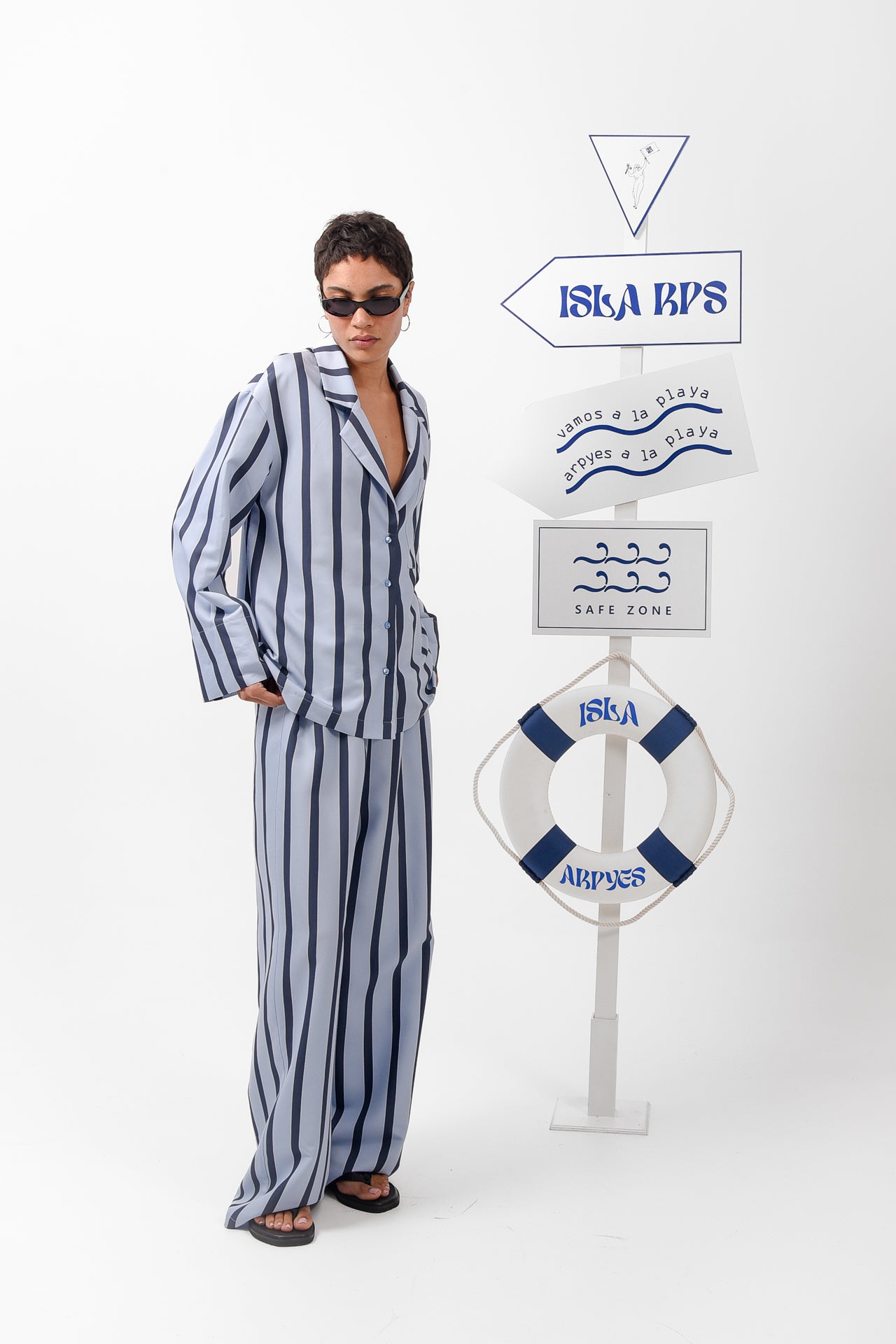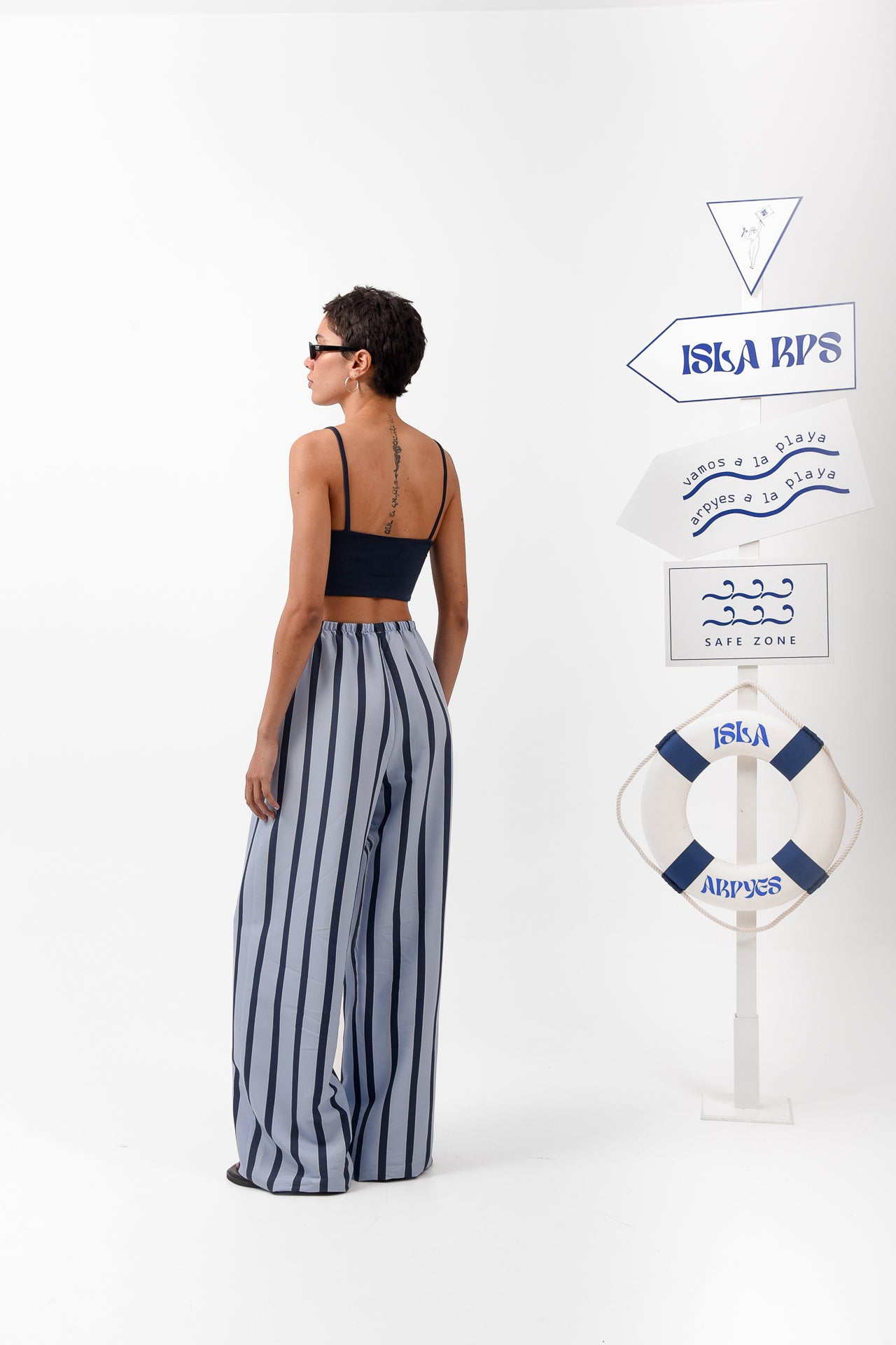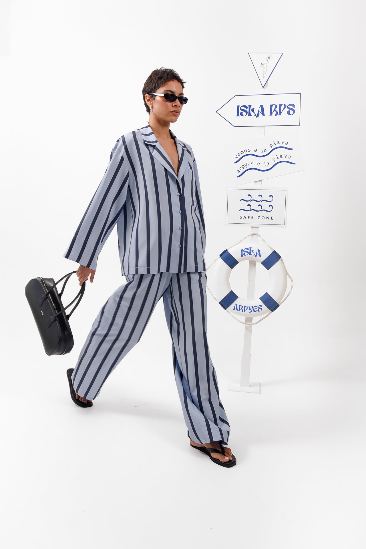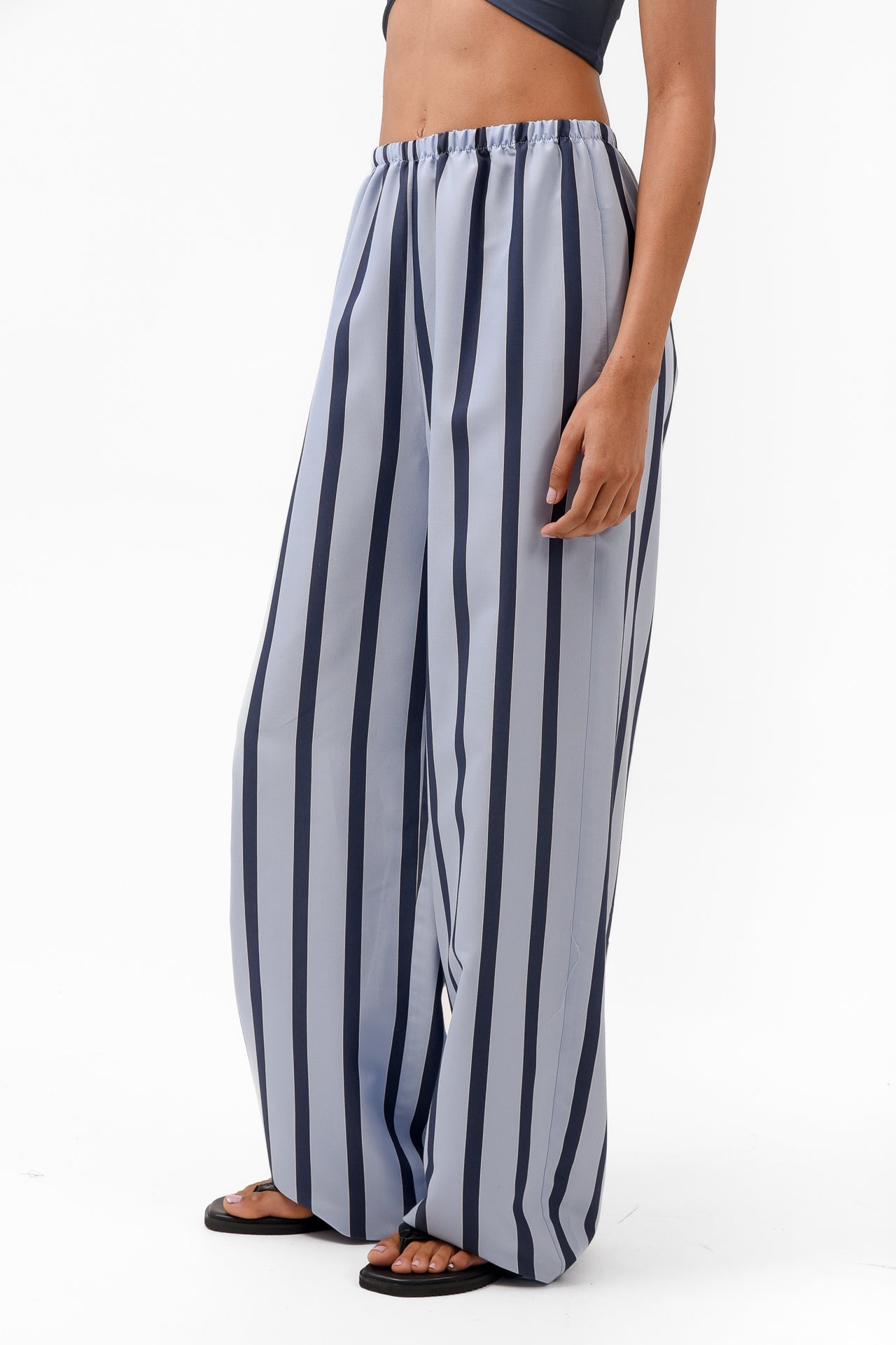 Bali Pants are crafted from smooth, lightweight striped fabric, designed to offer effortless movement and all-day comfort. Featuring a relaxed wide-leg silhouette, they sit softly on the waist with an elasticated waistband that ensures an easy, flexible fit. The fluid fabric creates a laid-back yet refined look, making them perfect to wear with the matching Bali Shirt or styled casually for relaxed summer dressing.