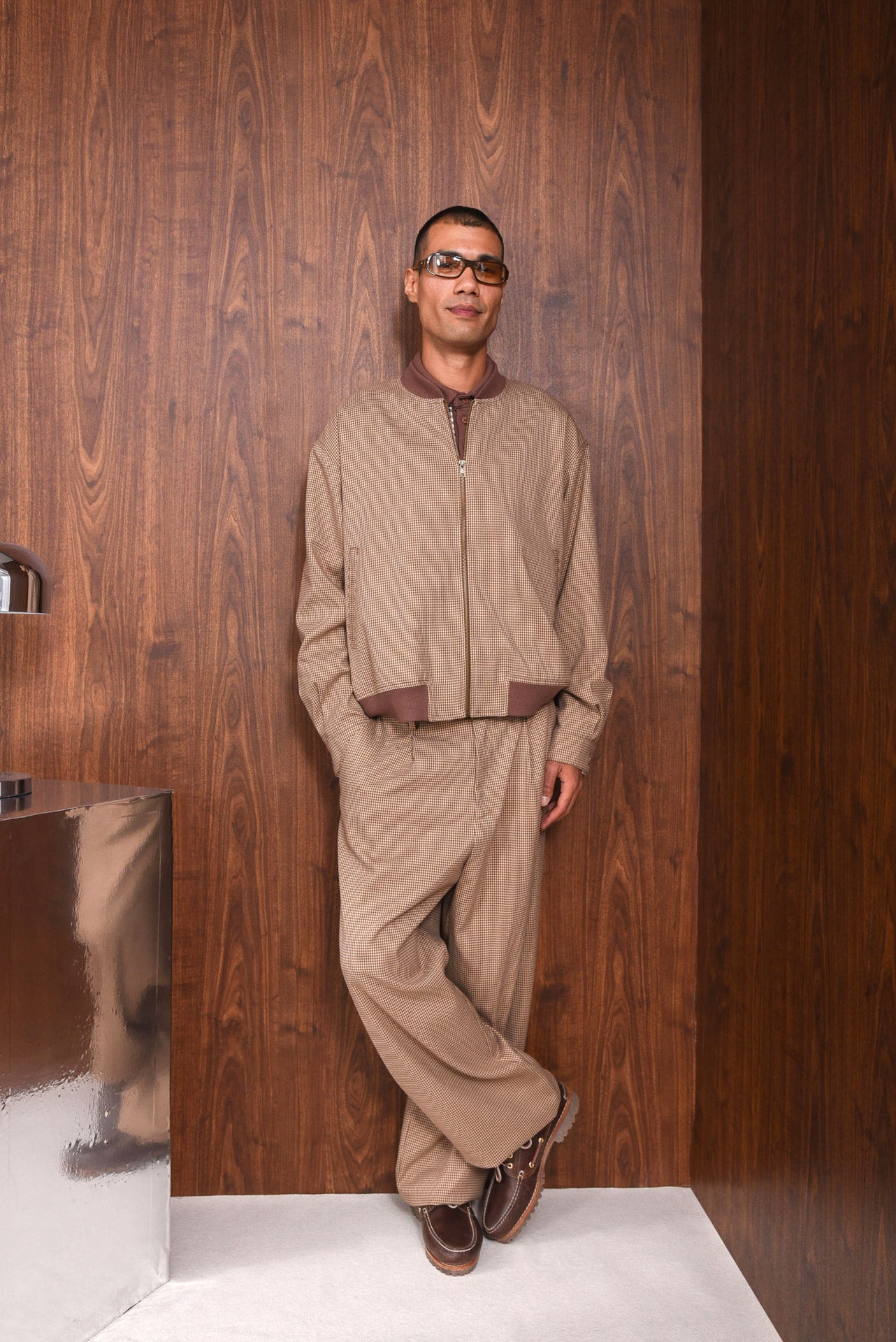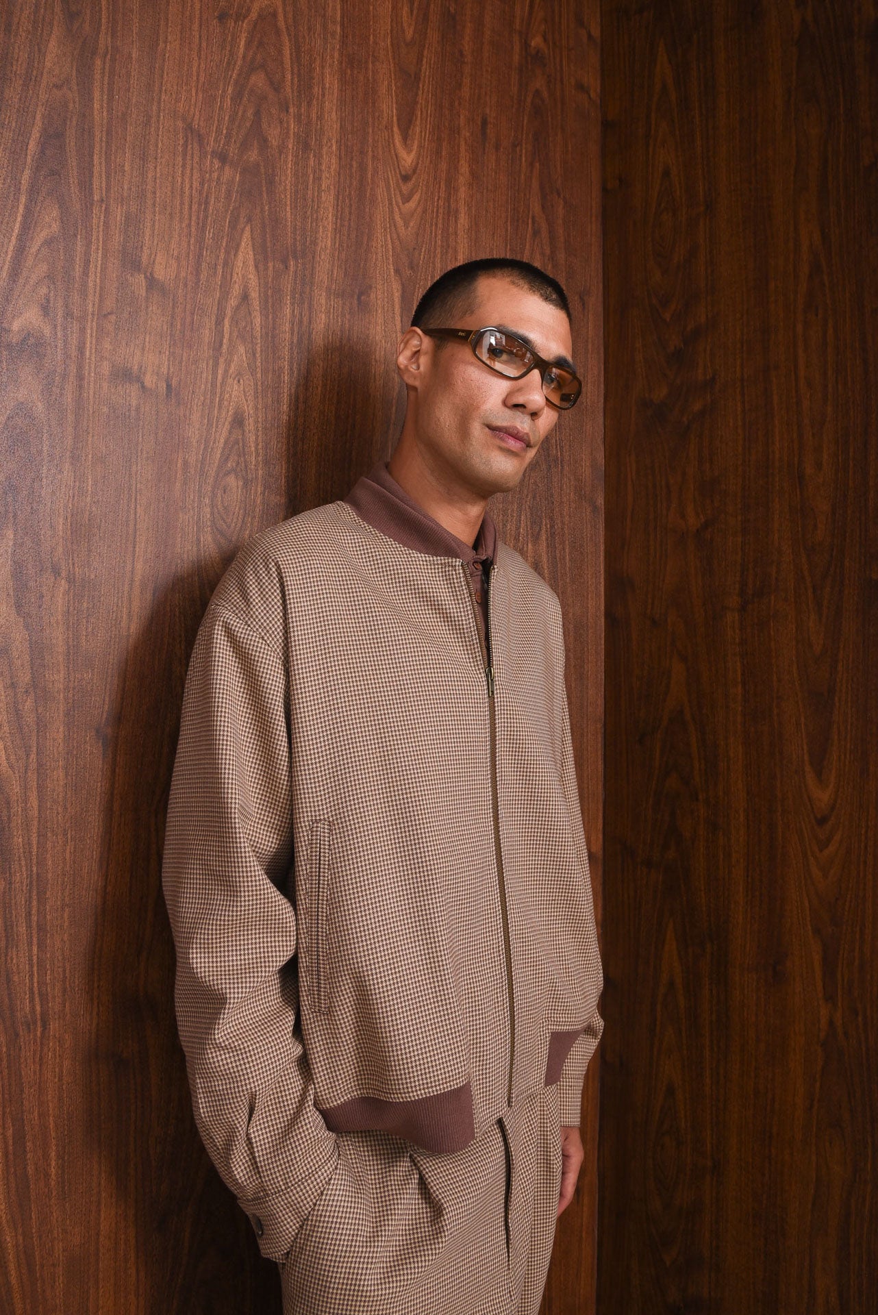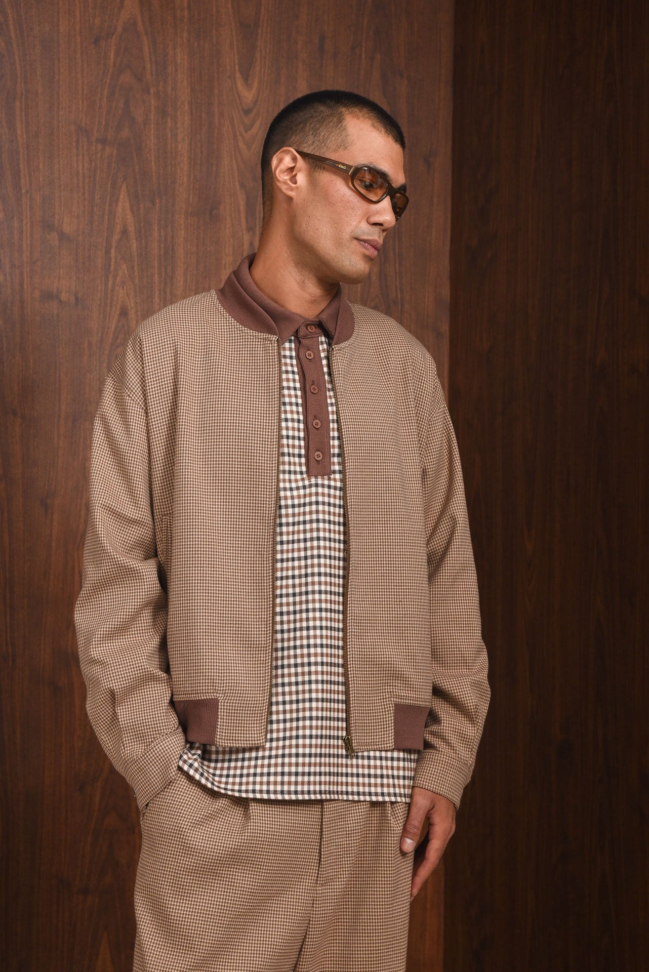 The Doubt Bomber offers a relaxed, boxy fit with a zip-up front and subtle dropped shoulders. Made from lightweight micro-check fabric, it features ribbed trims at the collar, cuffs, and hem, plus buttoned sleeves and side pockets for function. Fully lined inside for comfort.