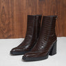 The Exist boots are made from croc-embossed vegan leather with a soft shine and rich texture. Designed with a pointed toe, side zip, and sturdy block heel, they offer a modern, structured look that’s easy to wear. Finished with a subtle metallic logo detail for an elegant touch.