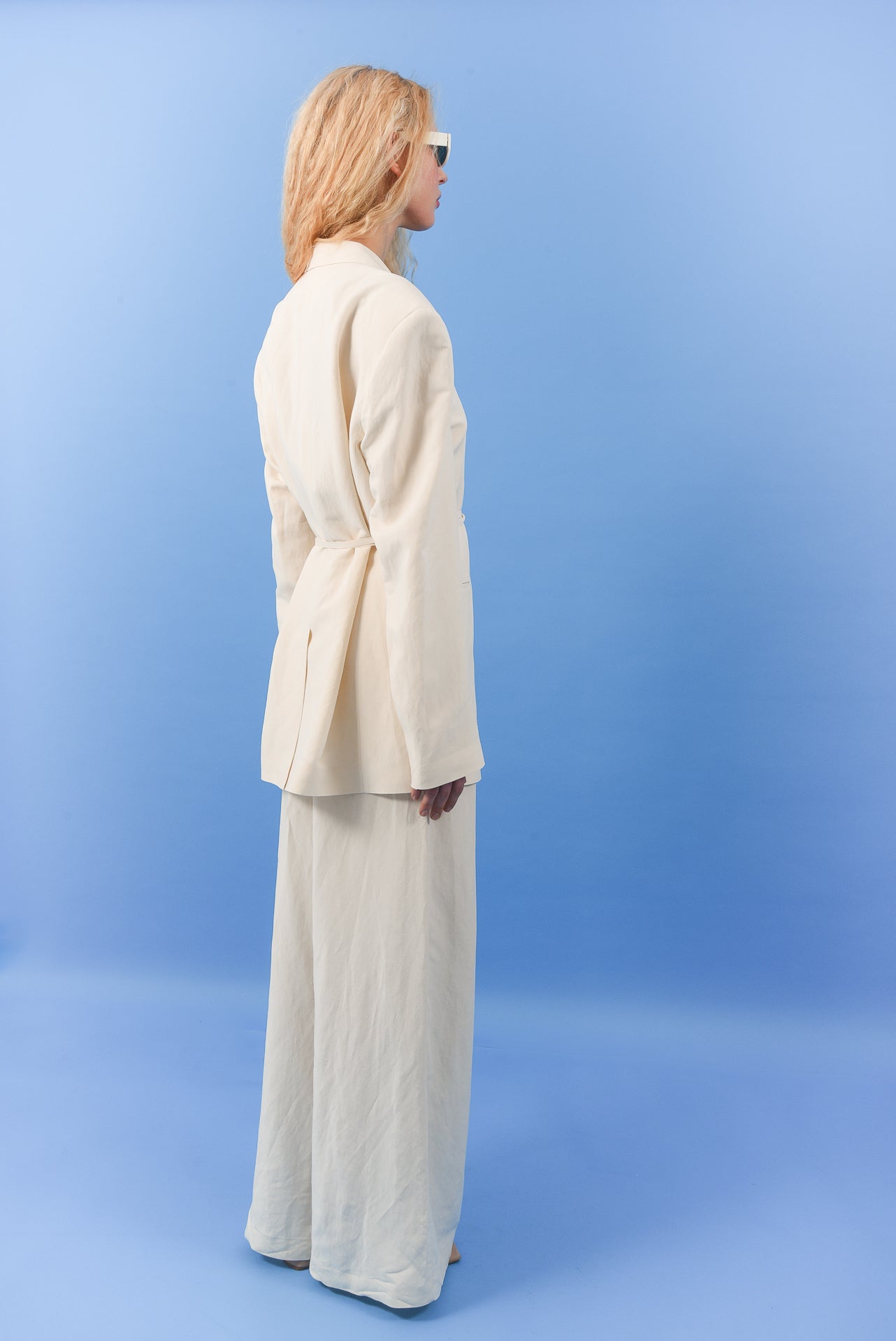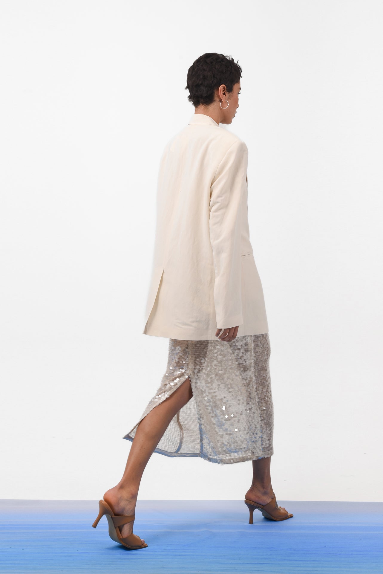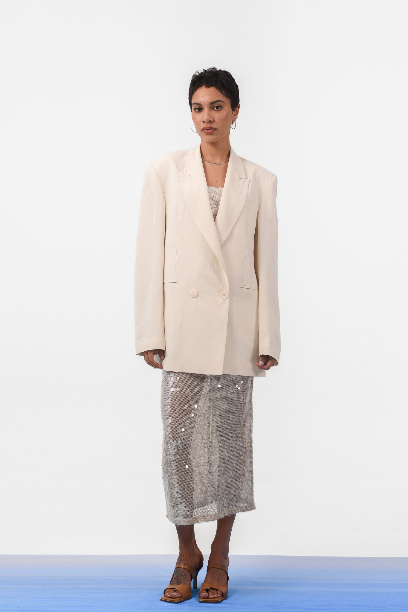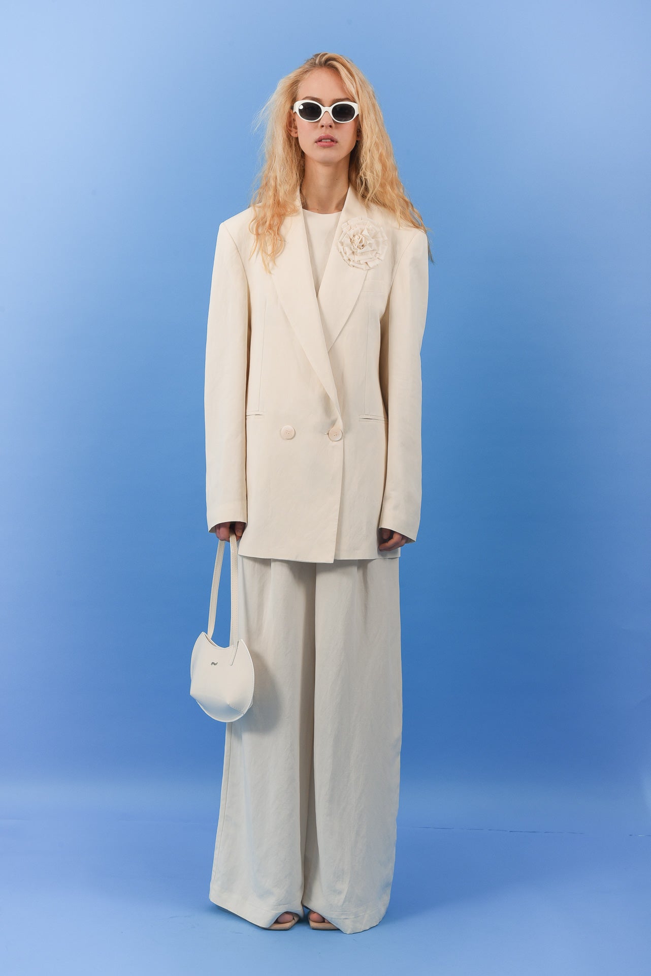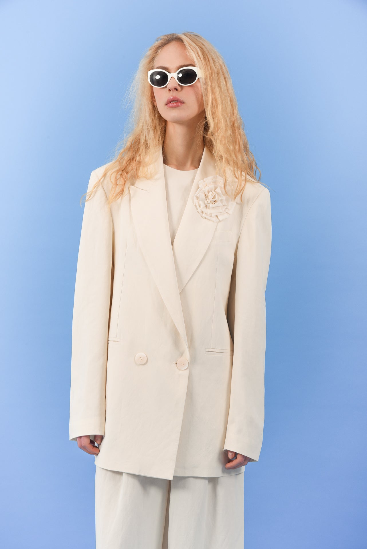June Blazer is a softly tailored, double-breasted jacket designed for effortless elegance. Crafted in lightweight fabric, it features structured shoulders, classic lapels, flap pockets, and tonal buttons. A detachable floral pin adds a refined statement touch. Its relaxed, elongated silhouette makes it perfect for both polished tailoring and modern everyday styling.