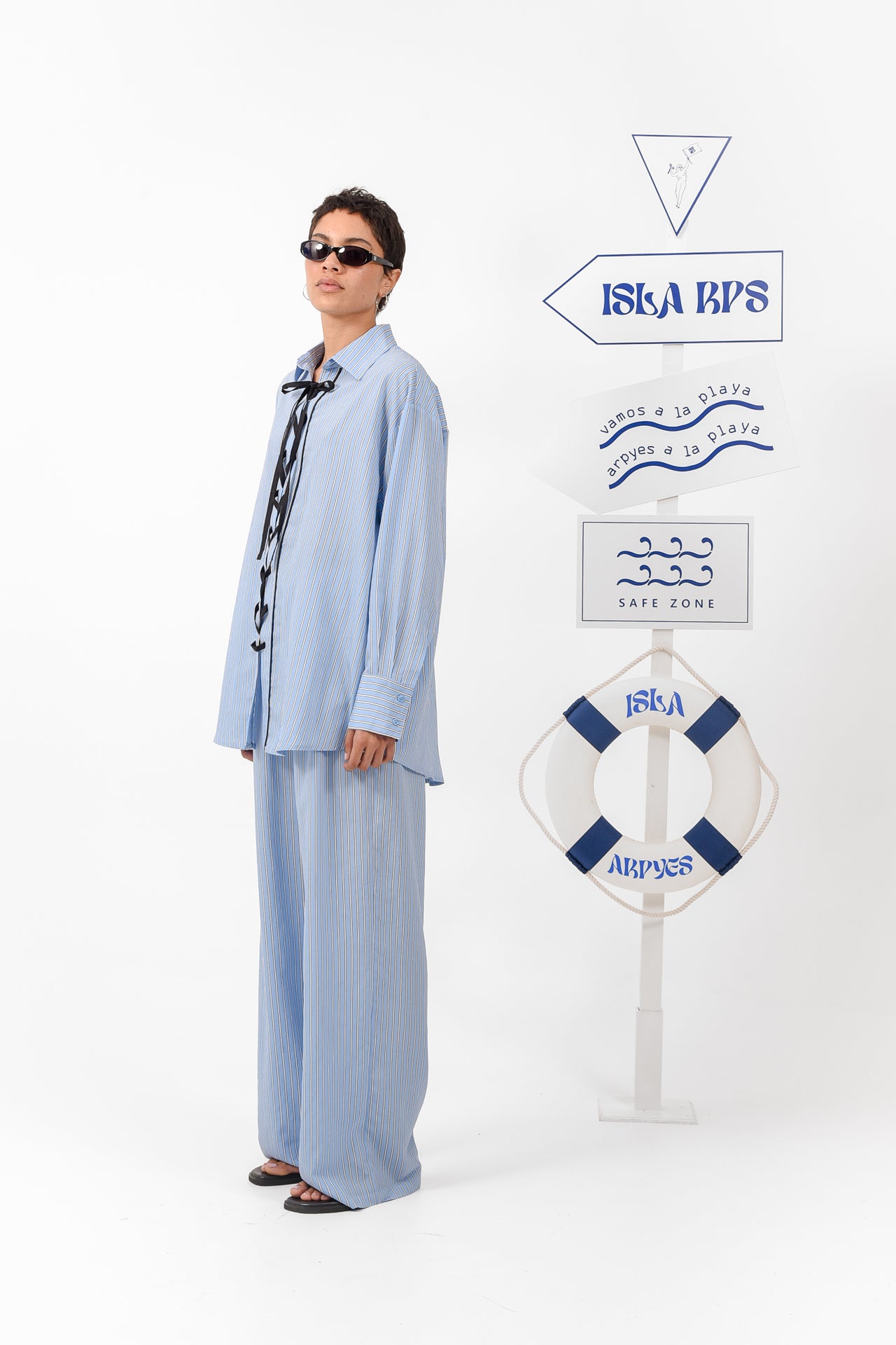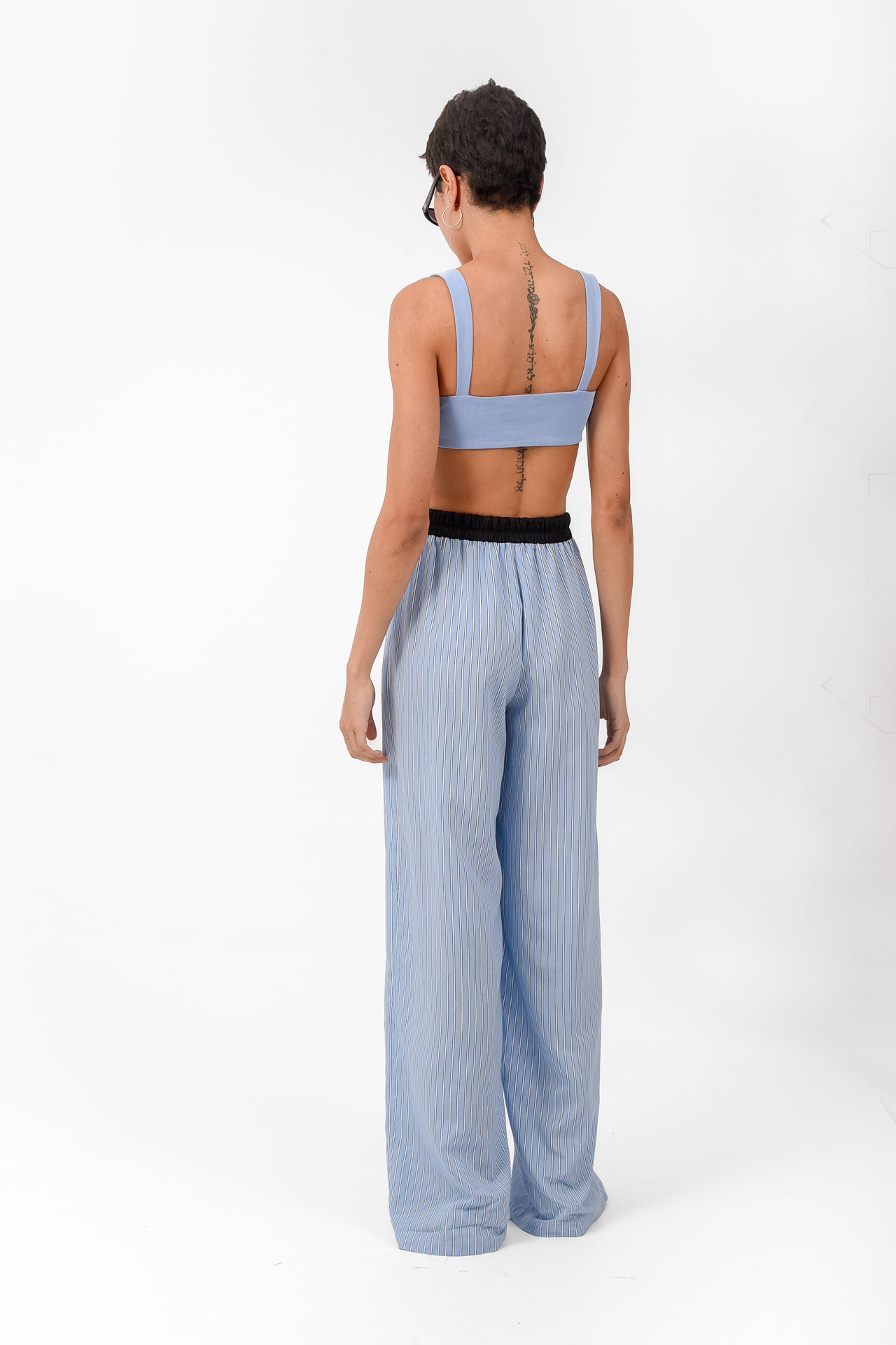 Relaxed wide-leg pants designed with a fluid silhouette and effortless drape. Featuring an elastic waistband with adjustable black drawstring for a flexible fit. Crafted in lightweight striped fabric, they offer comfort and movement while maintaining a clean, elongated shape. Perfect styled with the matching shirt or worn separately.