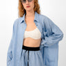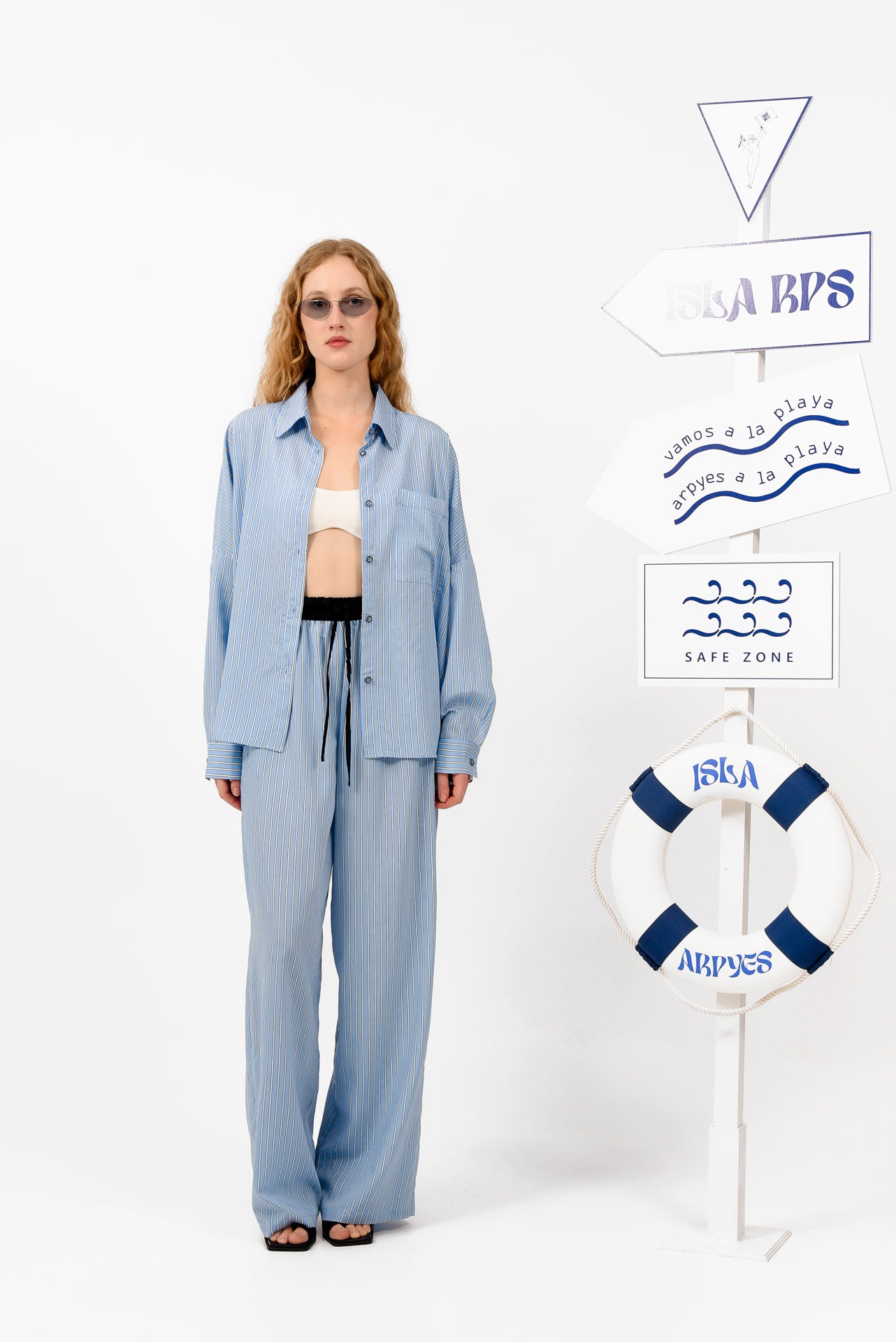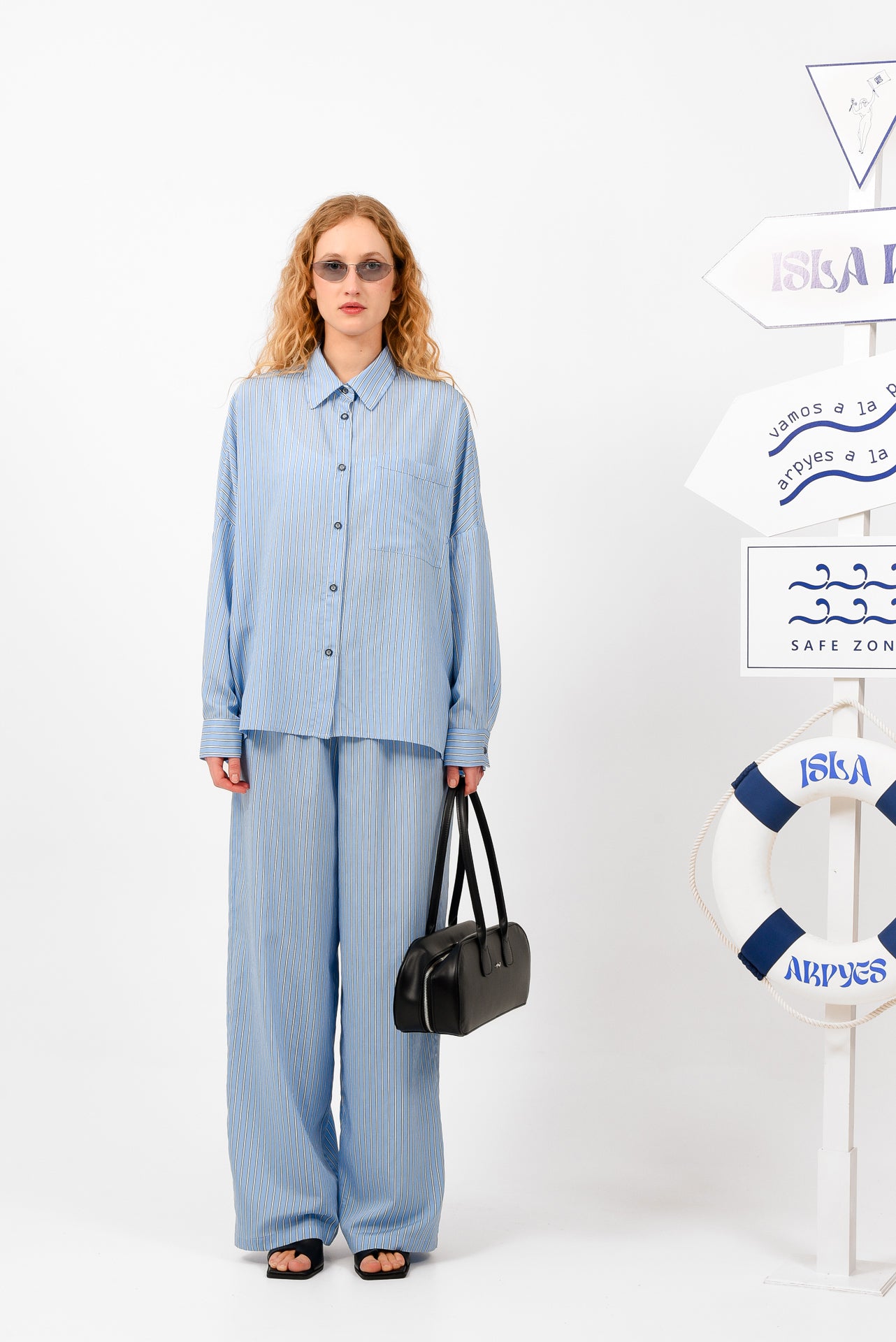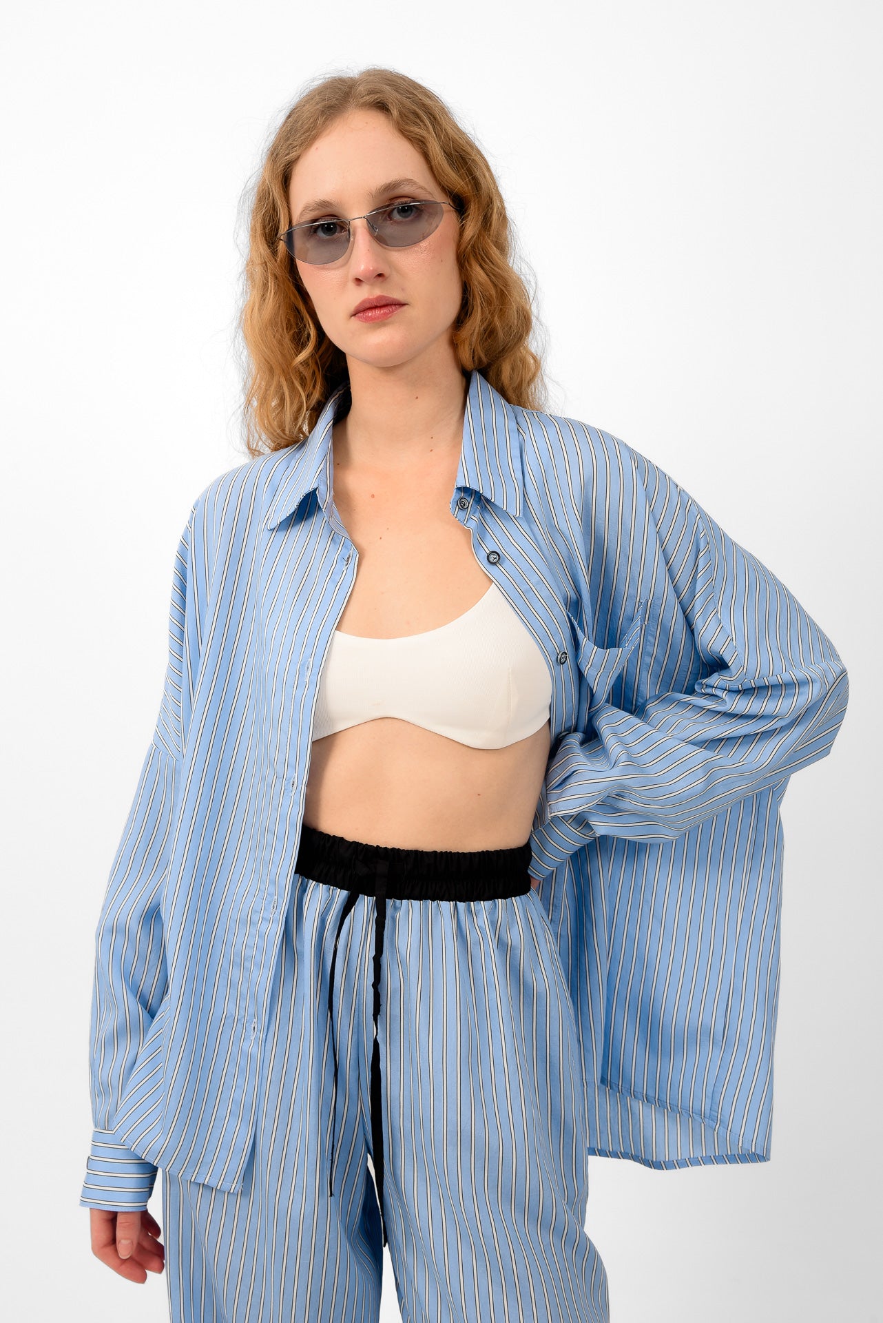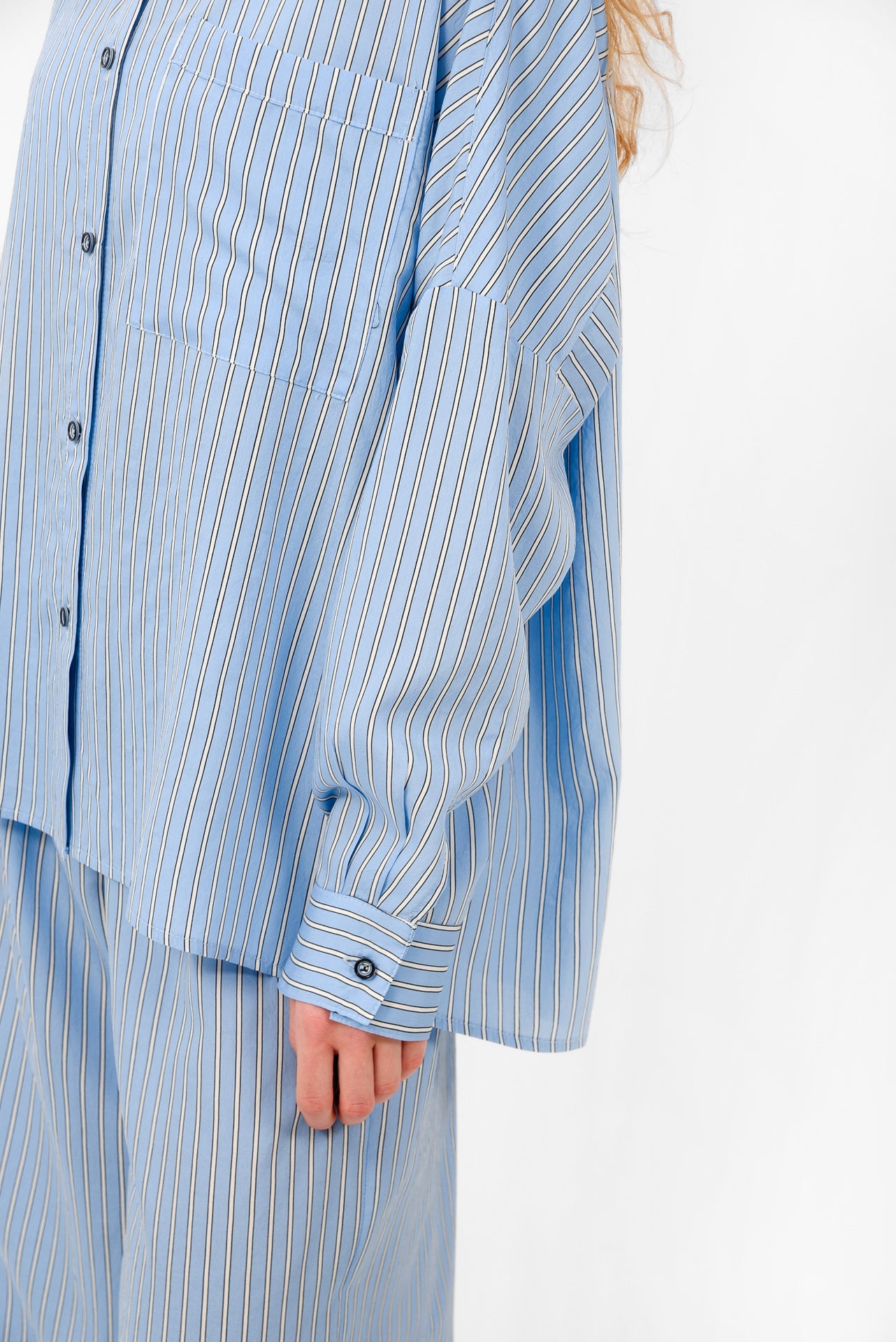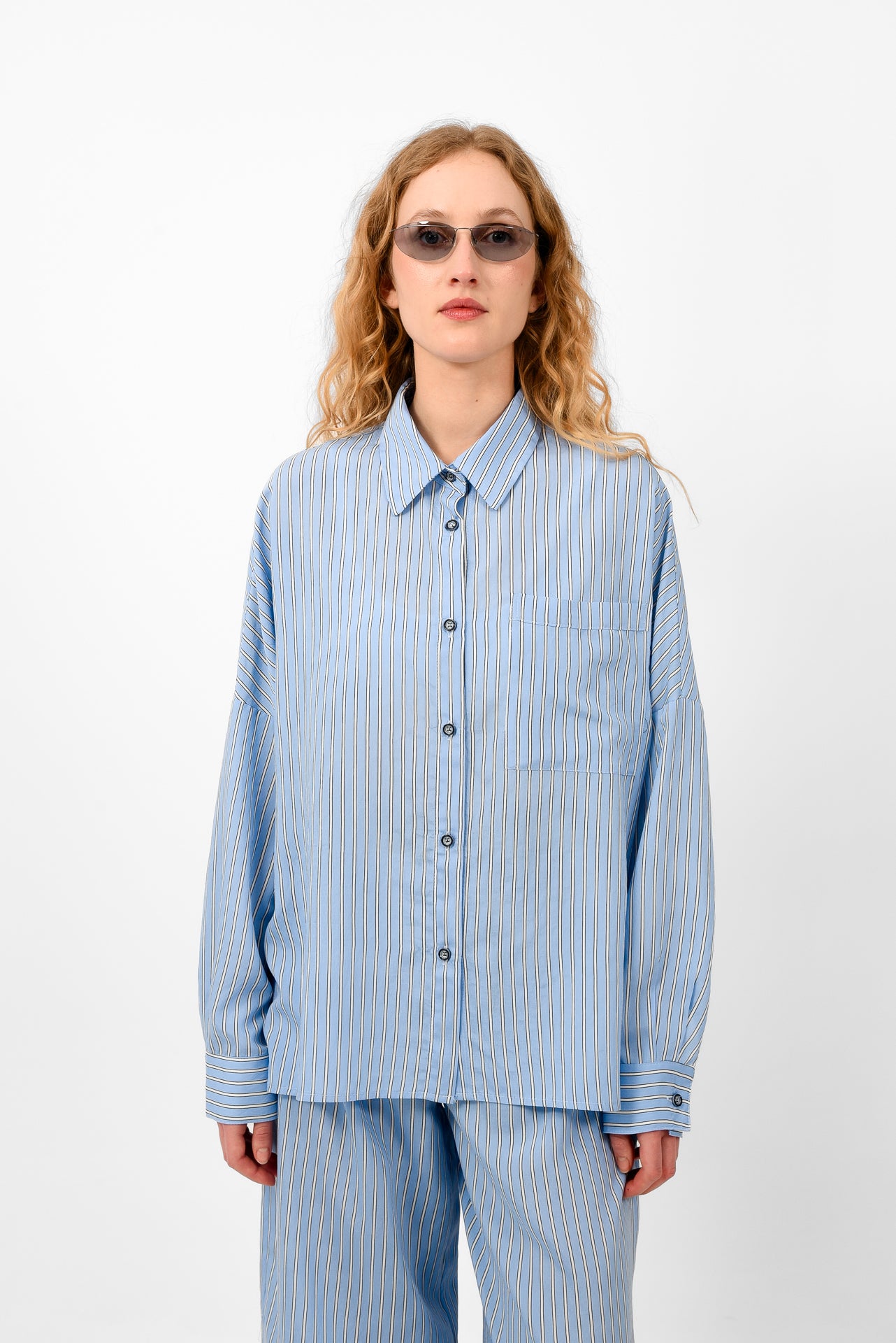 Relaxed-fit striped shirt designed with a classic collar and full button-down front. Featuring a chest pocket, dropped shoulders, and long sleeves with buttoned cuffs. Cut in lightweight, fluid fabric, it offers effortless movement and a laid-back silhouette. Wear it open or closed, styled alone or as a set with the matching pants.