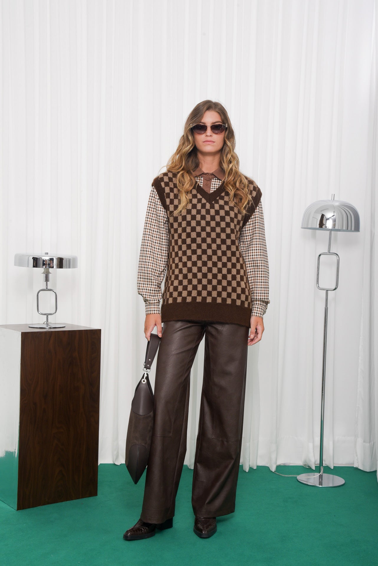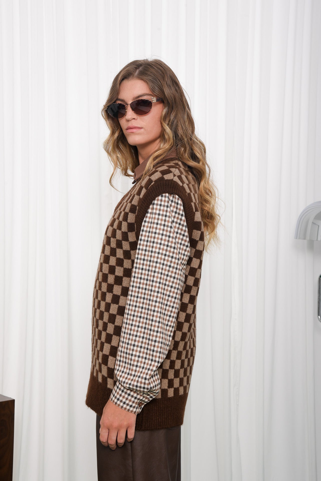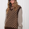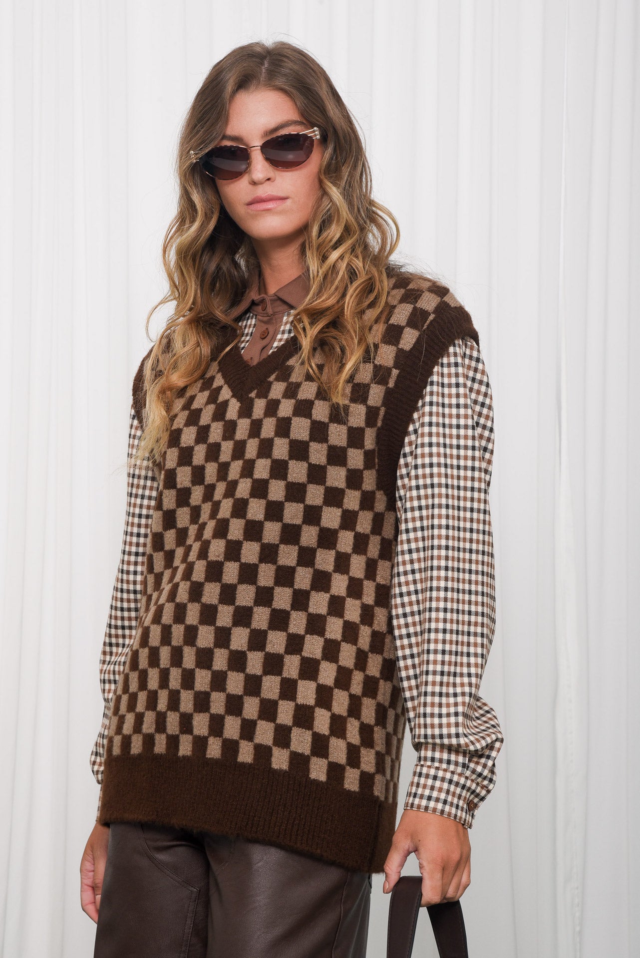 Manner Knitted Vest, a soft, cosy vest with a bold checkered pattern for everyday layering. Designed with a relaxed fit, V-neckline and ribbed trims for structure. Easy to wear over shirts or tops, adding warmth and style. A simple, comfortable knit that works with any outfit.