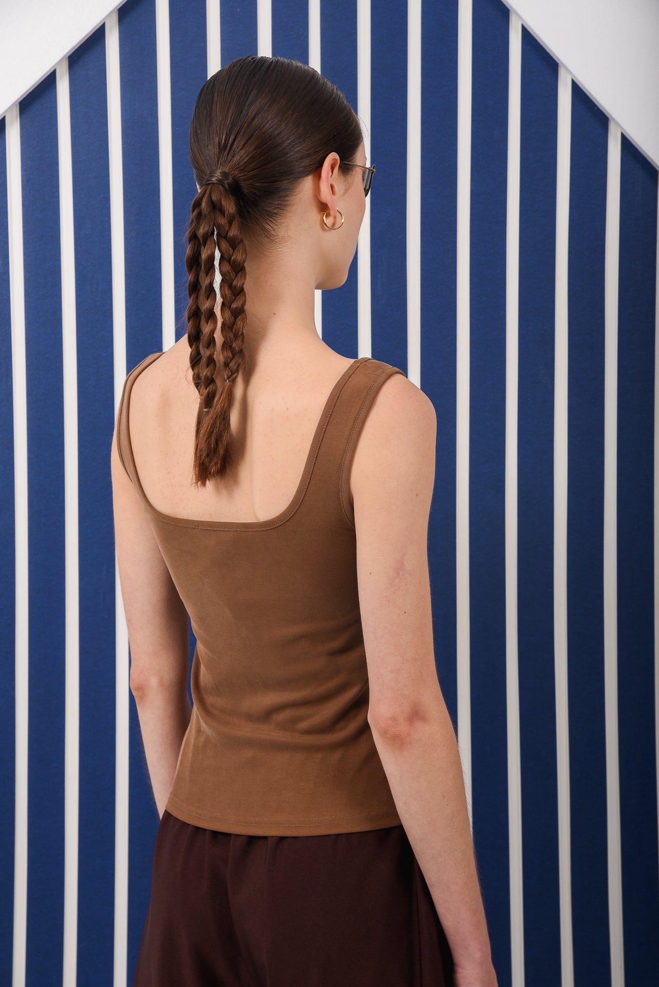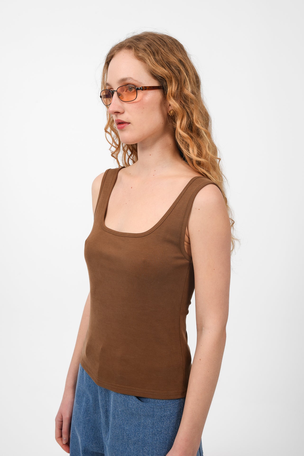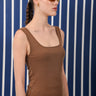 Fitted sleeveless tank top designed with a soft scoop neckline and wide straps. Cut from comfortable stretch fabric that gently hugs the body, creating a clean and flattering silhouette. Lightweight and versatile, it’s an easy everyday piece, perfect for layering or wearing on its own with skirts, shorts, or denim.