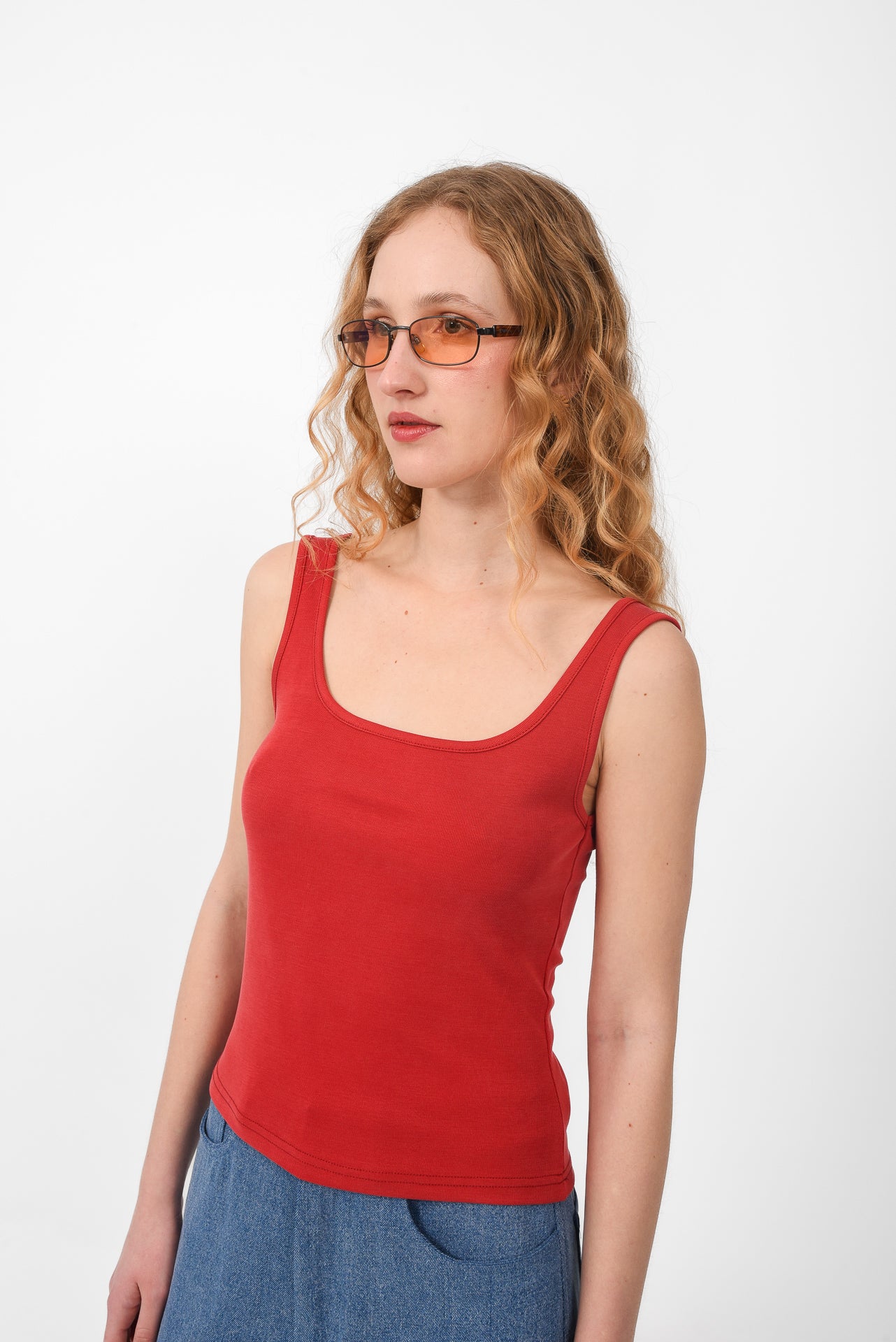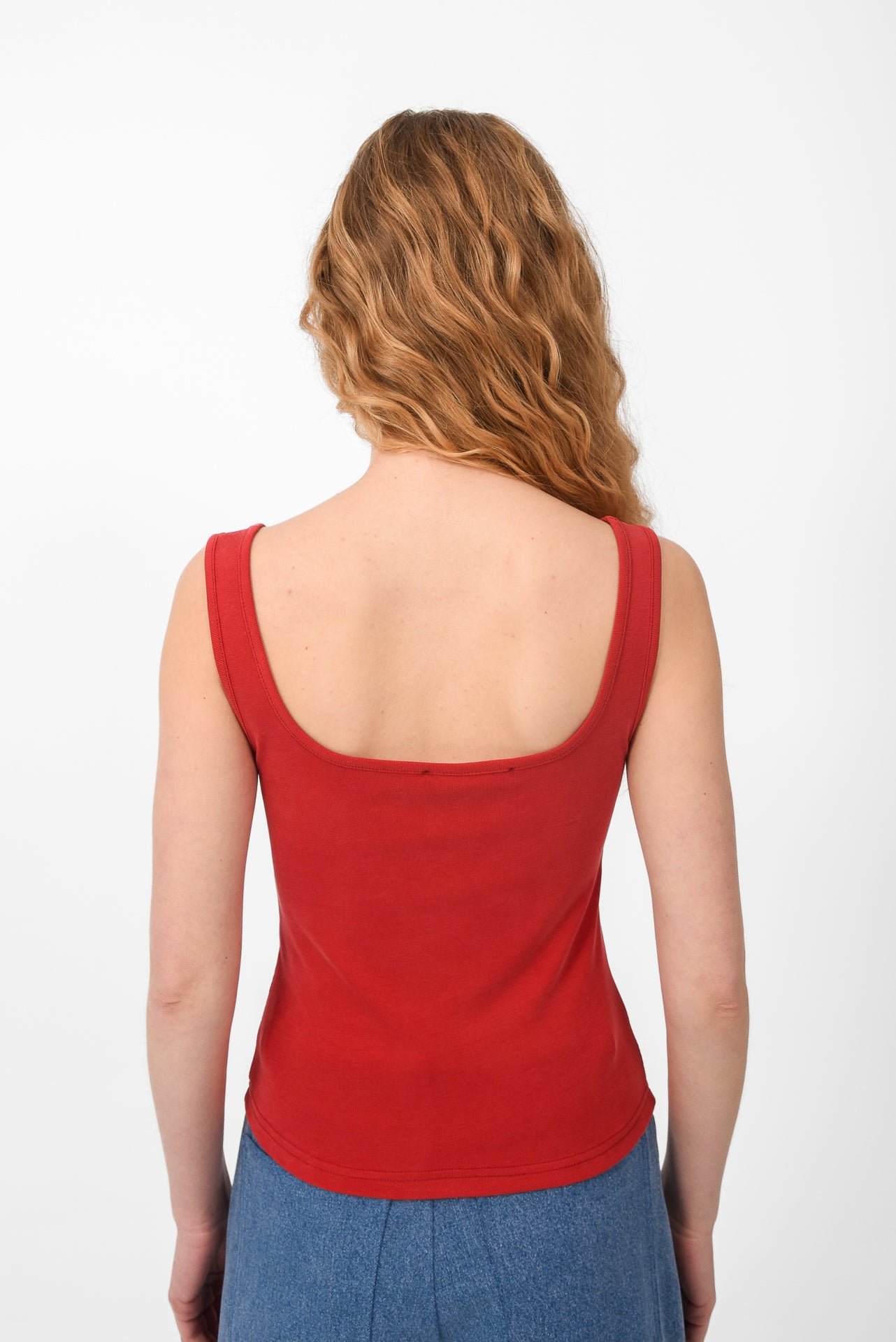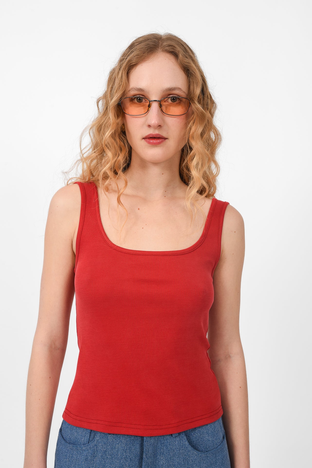 Fitted sleeveless tank top designed with a soft scoop neckline and wide straps. Cut from comfortable stretch fabric that gently hugs the body, creating a clean and flattering silhouette. Lightweight and versatile, it’s an easy everyday piece, perfect for layering or wearing on its own with skirts, shorts, or denim.