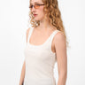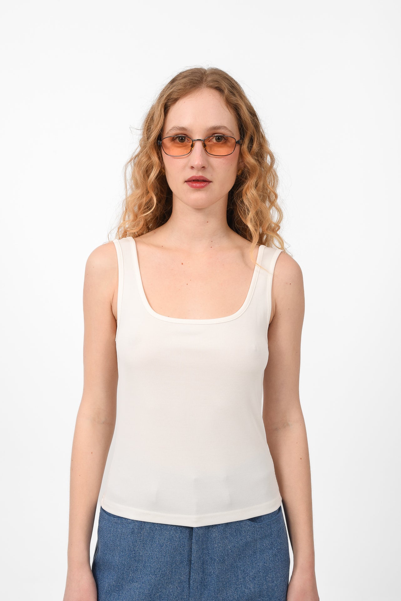 Fitted sleeveless tank top designed with a soft scoop neckline and wide straps. Cut from comfortable stretch fabric that gently hugs the body, creating a clean and flattering silhouette. Lightweight and versatile, it’s an easy everyday piece, perfect for layering or wearing on its own with skirts, shorts, or denim.