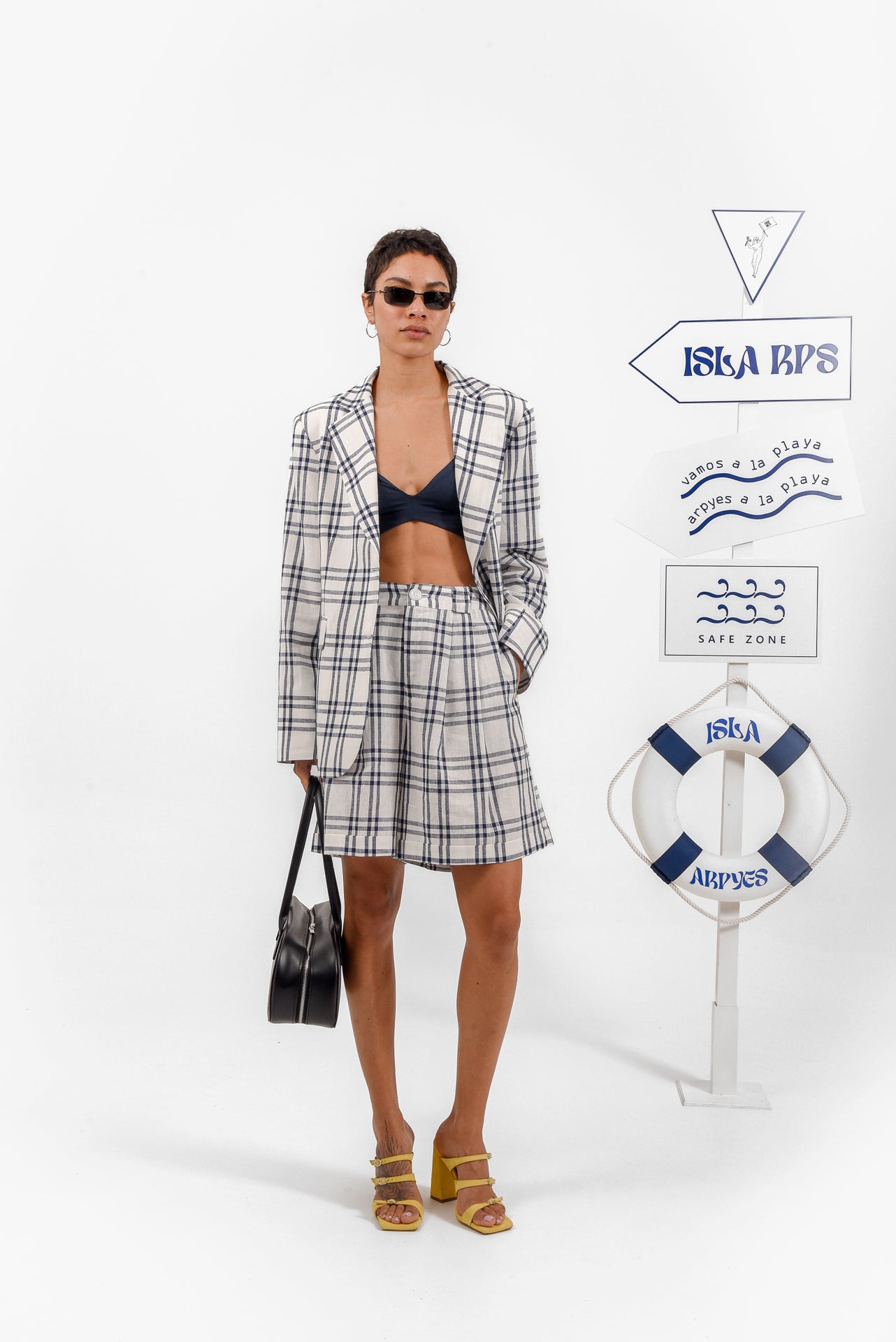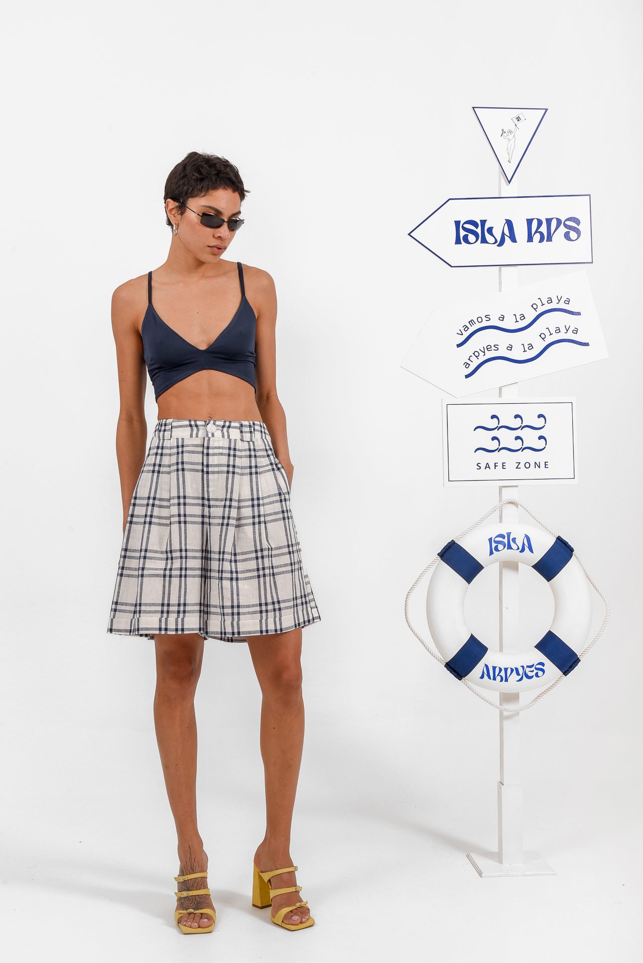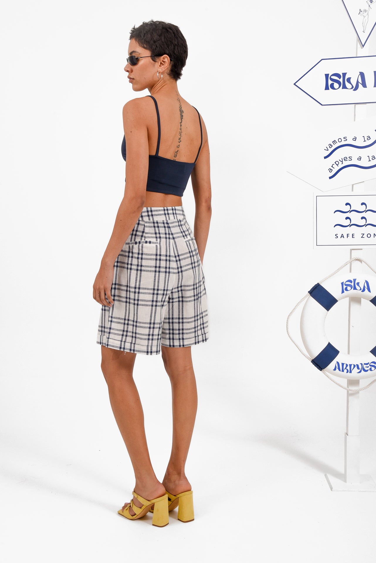 Pelagos Shorts are designed in a lightweight checked fabric, offering a relaxed yet tailored feel. Featuring a high-waisted fit, soft front pleats, side pockets, and a clean button closure, they combine comfort with effortless structure. Wear them with the matching Pelagos Blazer or style casually for an easy, polished summer look.