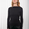 The Respect top is a fitted long-sleeve blouse made from soft ribbed fabric for comfort and stretch. It features a boat neckline and a unique diagonal seam detail across the front, adding a modern twist to a timeless design.
