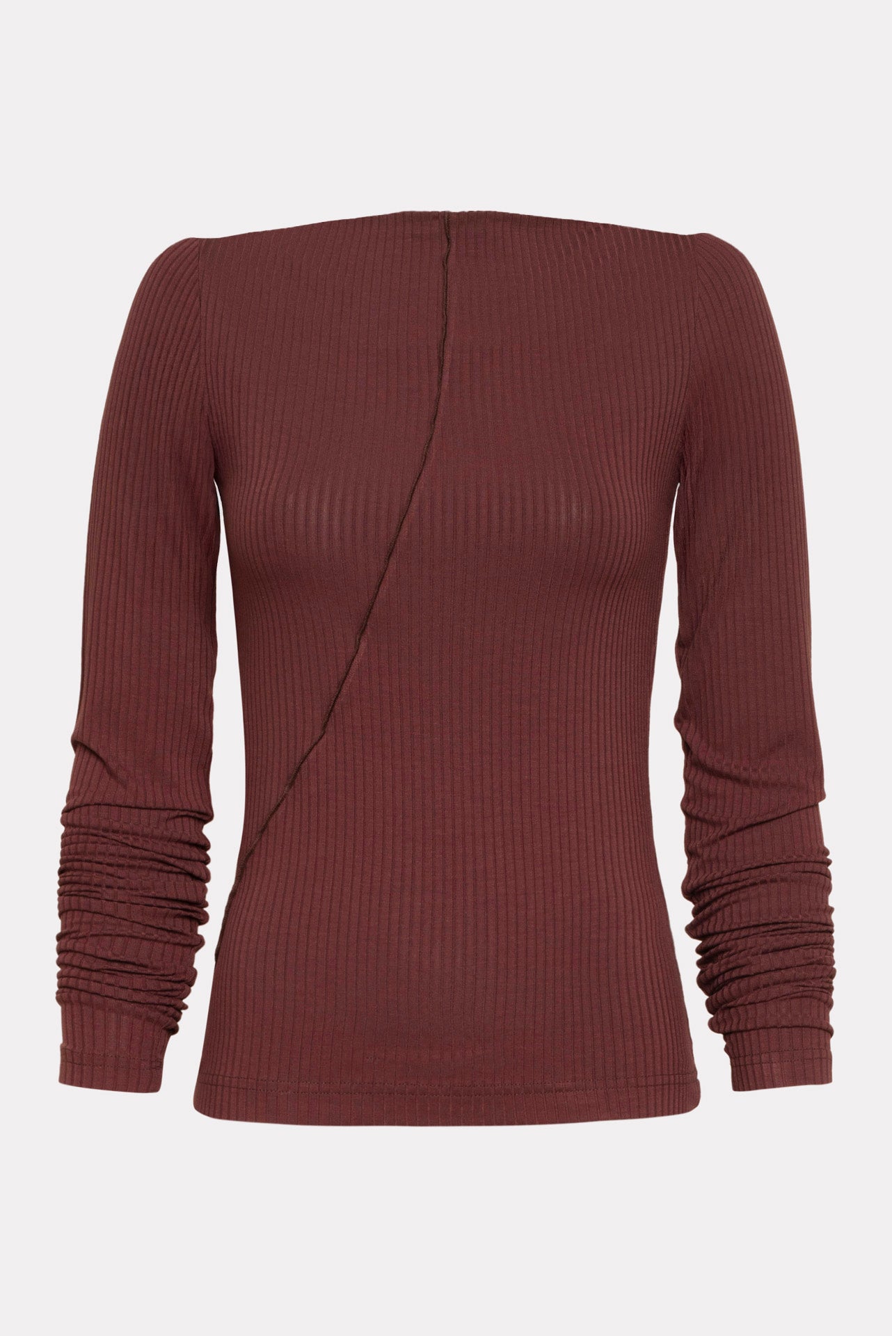 The Respect top is a fitted long-sleeve blouse made from soft ribbed fabric for comfort and stretch. It features a boat neckline and a unique diagonal seam detail across the front, adding a modern twist to a timeless design.