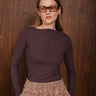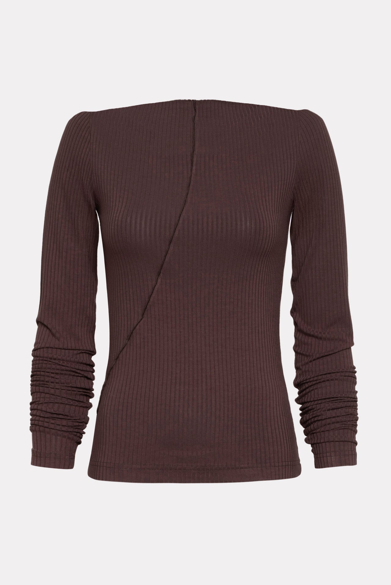 The Respect top is a fitted long-sleeve blouse made from soft ribbed fabric for comfort and stretch. It features a boat neckline and a unique diagonal seam detail across the front, adding a modern twist to a timeless design.