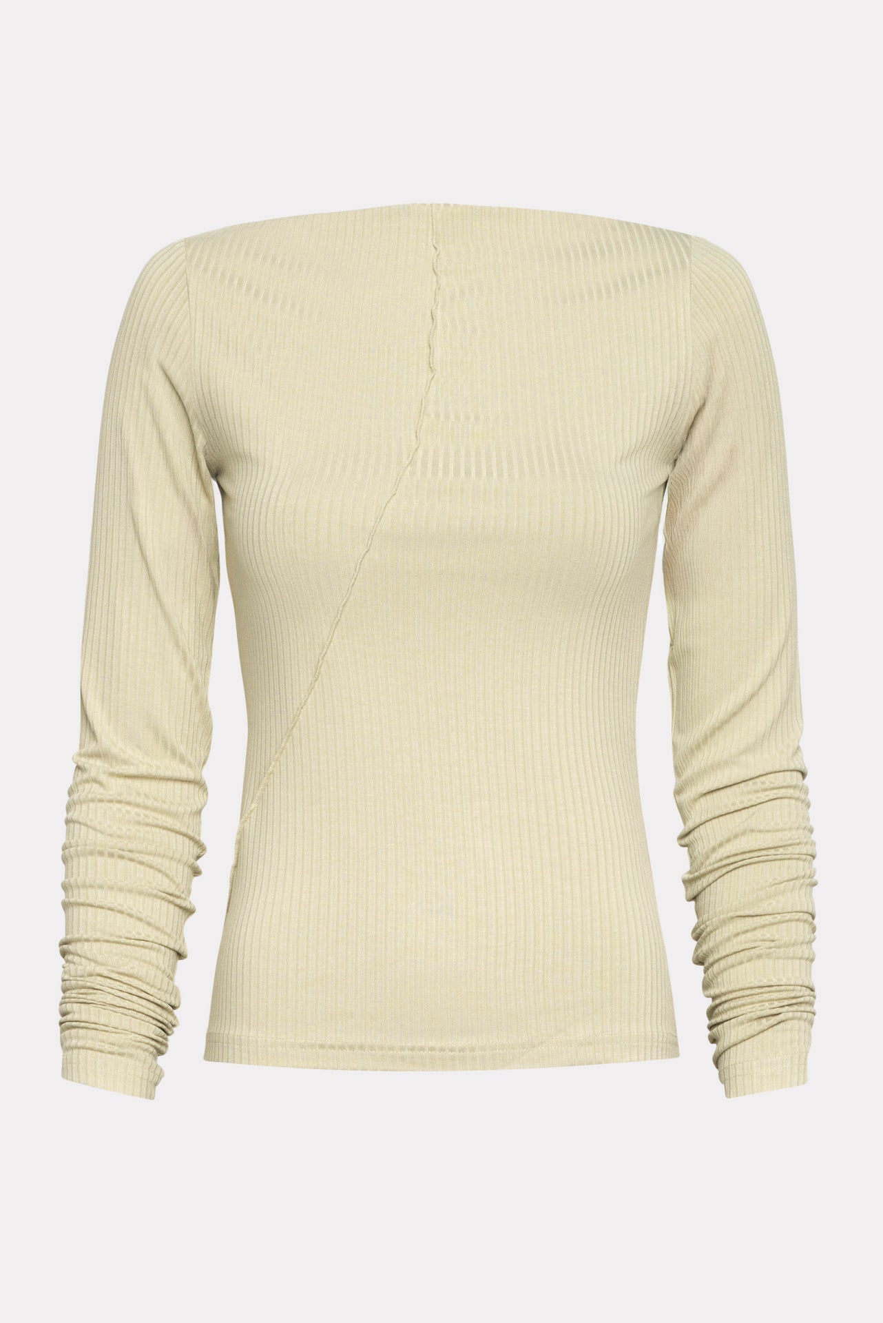 The Respect top is a fitted long-sleeve blouse made from soft ribbed fabric for comfort and stretch. It features a boat neckline and a unique diagonal seam detail across the front, adding a modern twist to a timeless design.