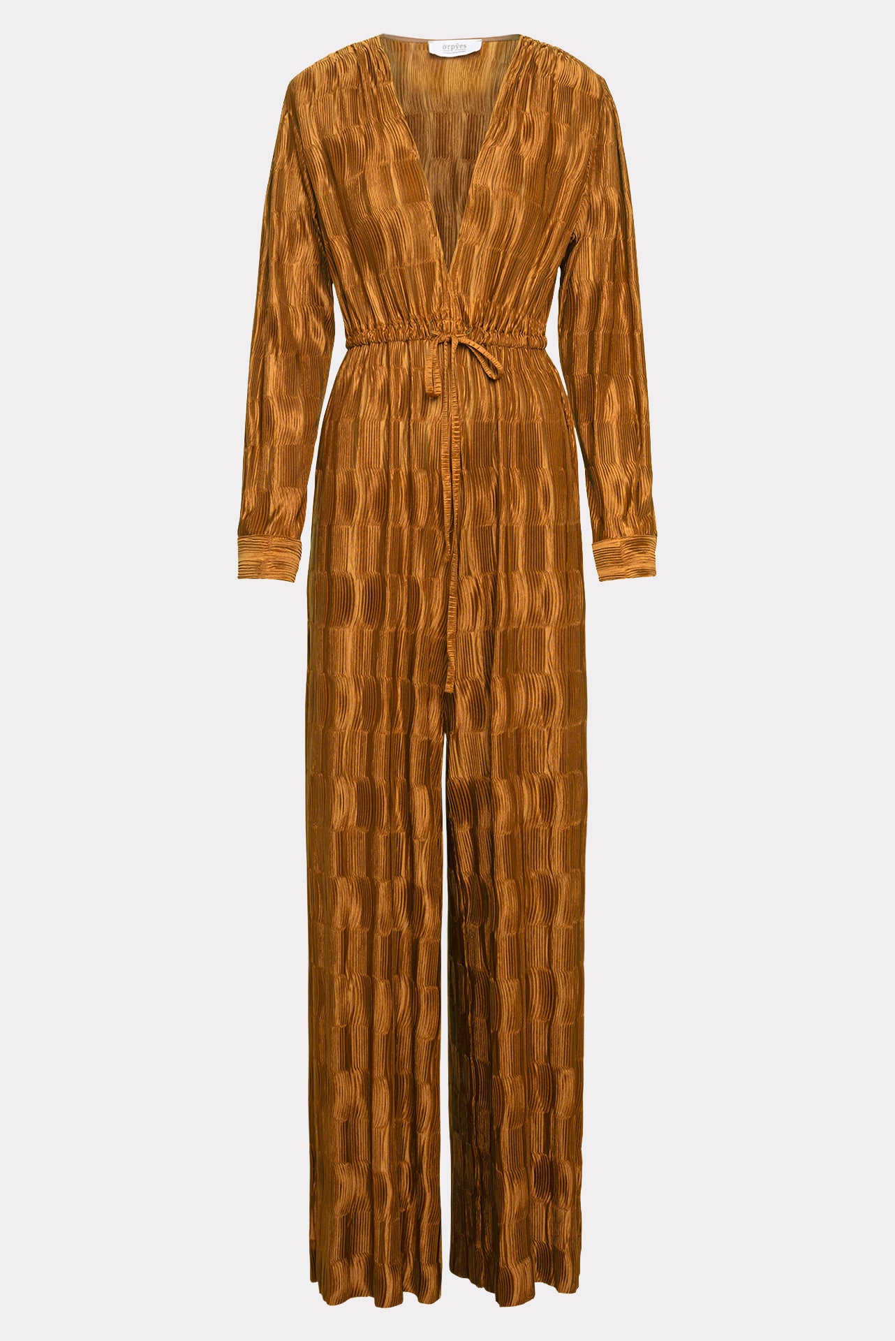 The Role Jumpsuit features fluid wide legs, long sleeves, and a plunging neckline with gathered waist ties for a flattering shape. Its subtly pleated texture elevates movement. Each jumpsuit includes a matching triangle top, perfect for wearing underneath or styled separately.