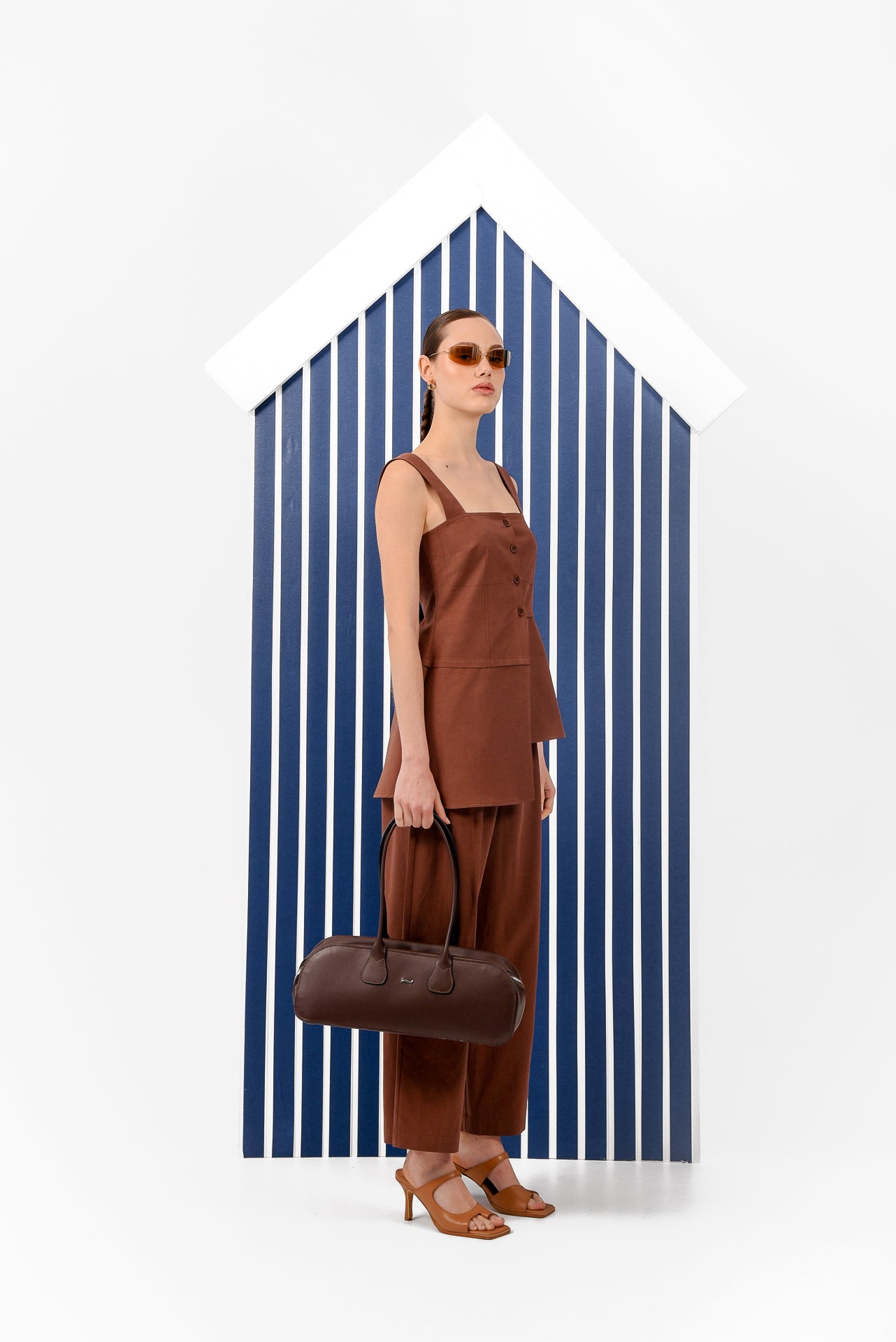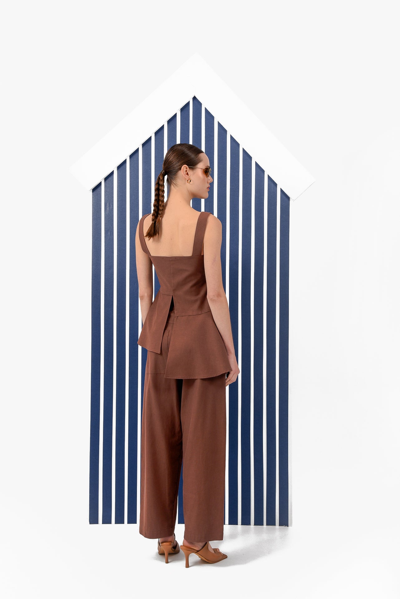 A structured sleeveless top designed with clean, modern lines. Featuring a square neckline, wide straps, and a button-front closure, it creates a flattering, tailored silhouette. The layered asymmetric panels add movement and dimension, while the lightweight fabric makes it an elegant and versatile piece for refined everyday dressing.