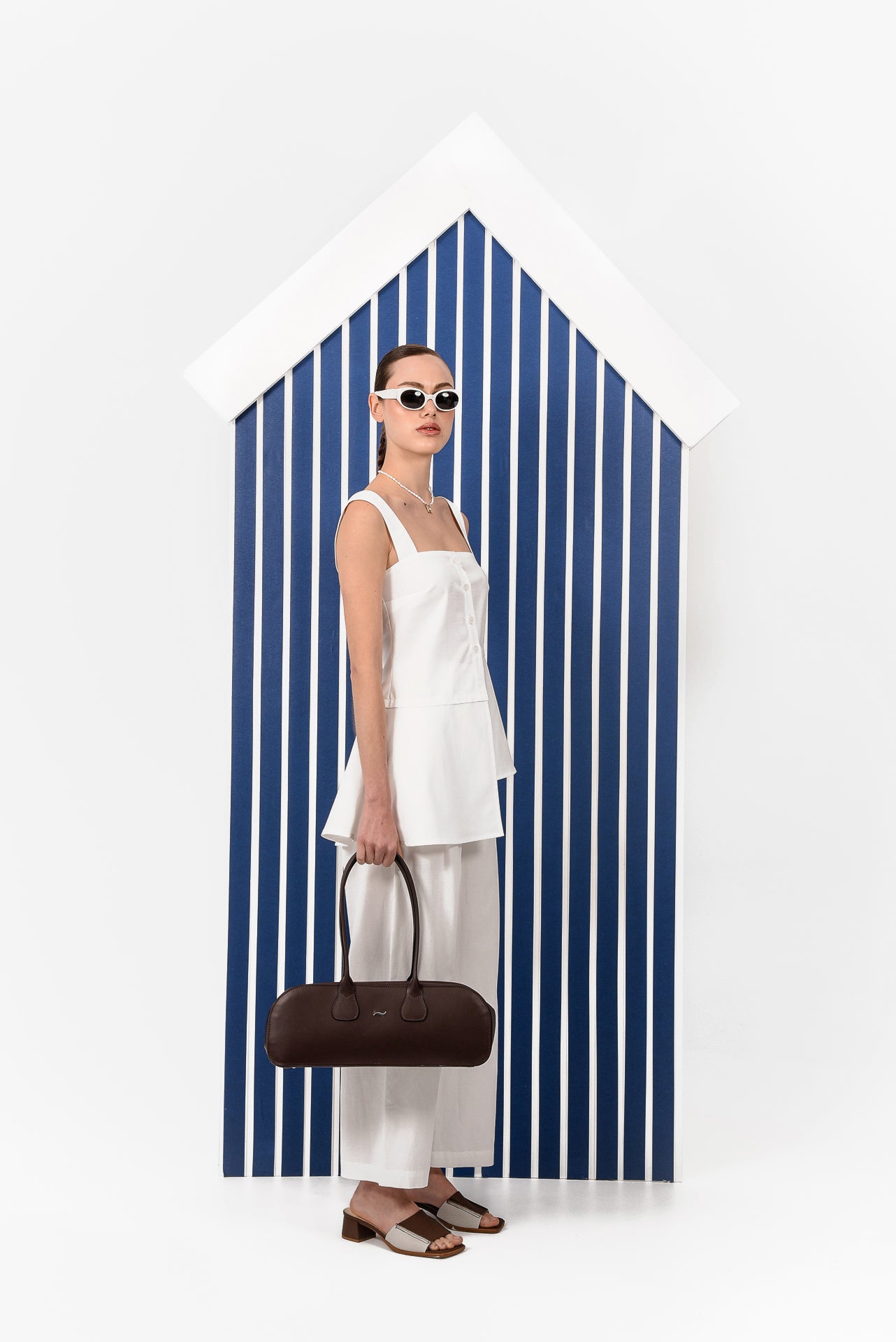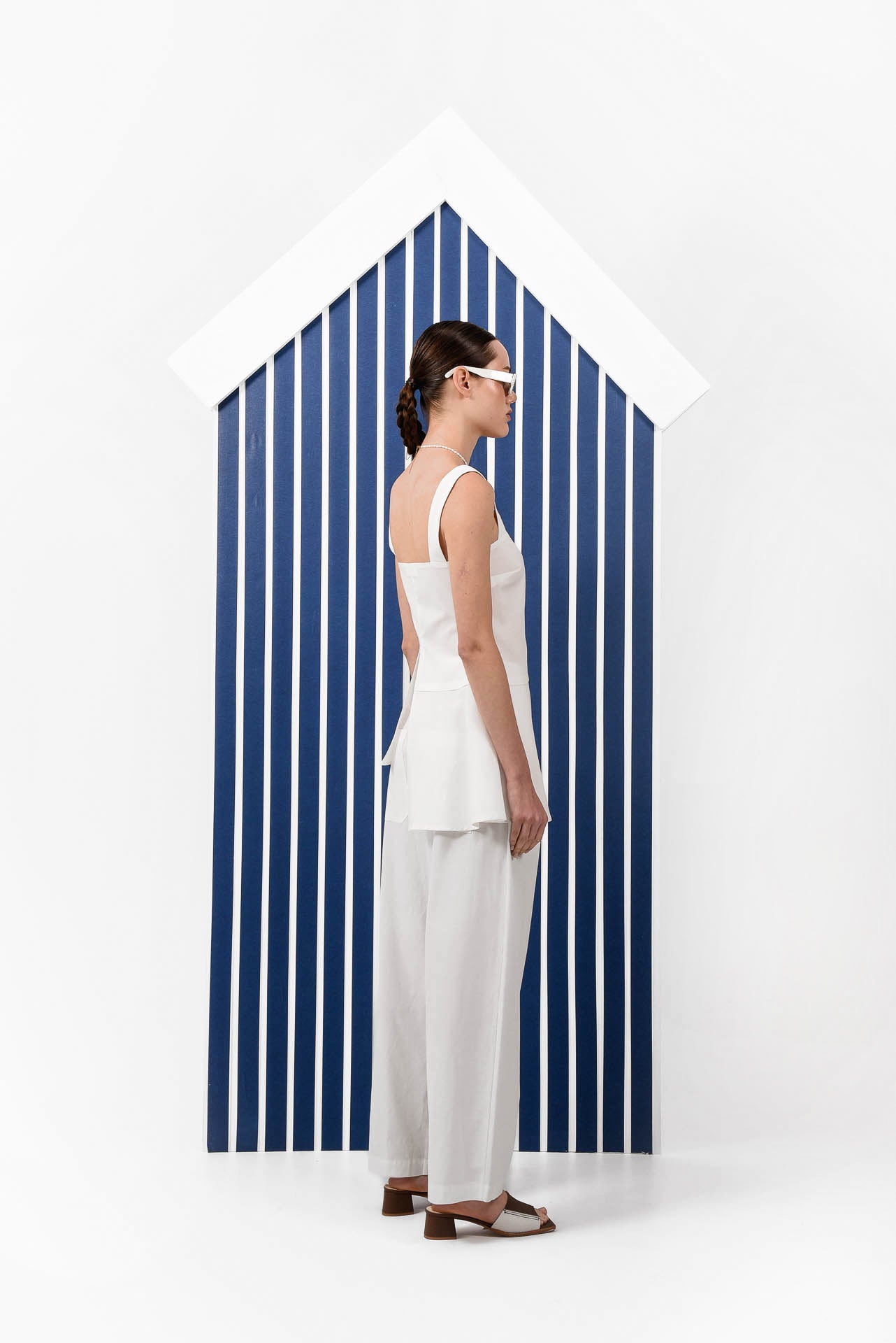 A structured sleeveless top designed with clean, modern lines. Featuring a square neckline, wide straps, and a button-front closure, it creates a flattering, tailored silhouette. The layered asymmetric panels add movement and dimension, while the lightweight fabric makes it an elegant and versatile piece for refined everyday dressing.
