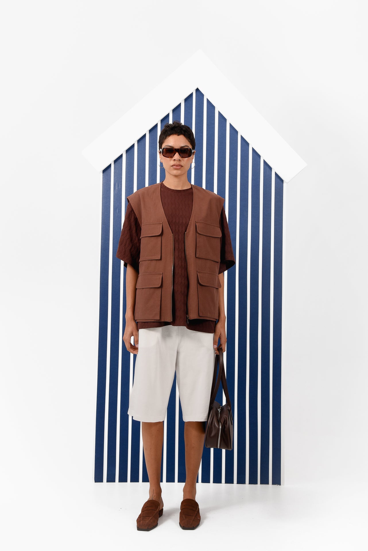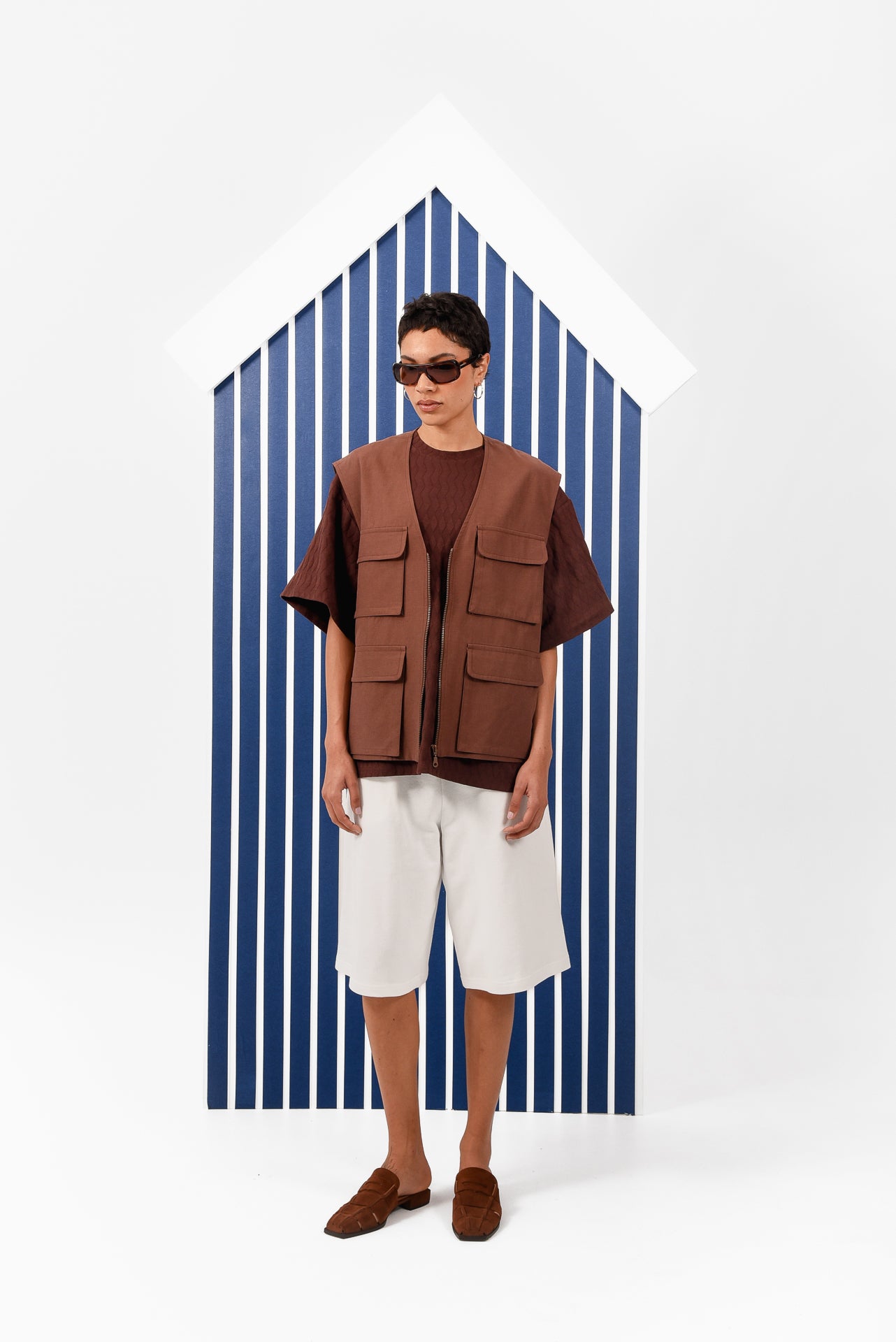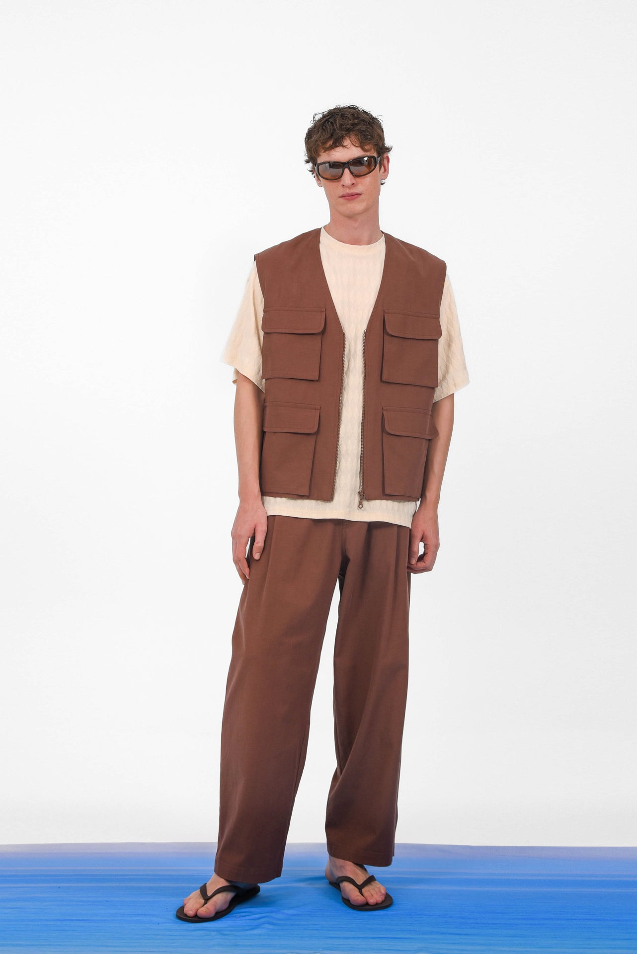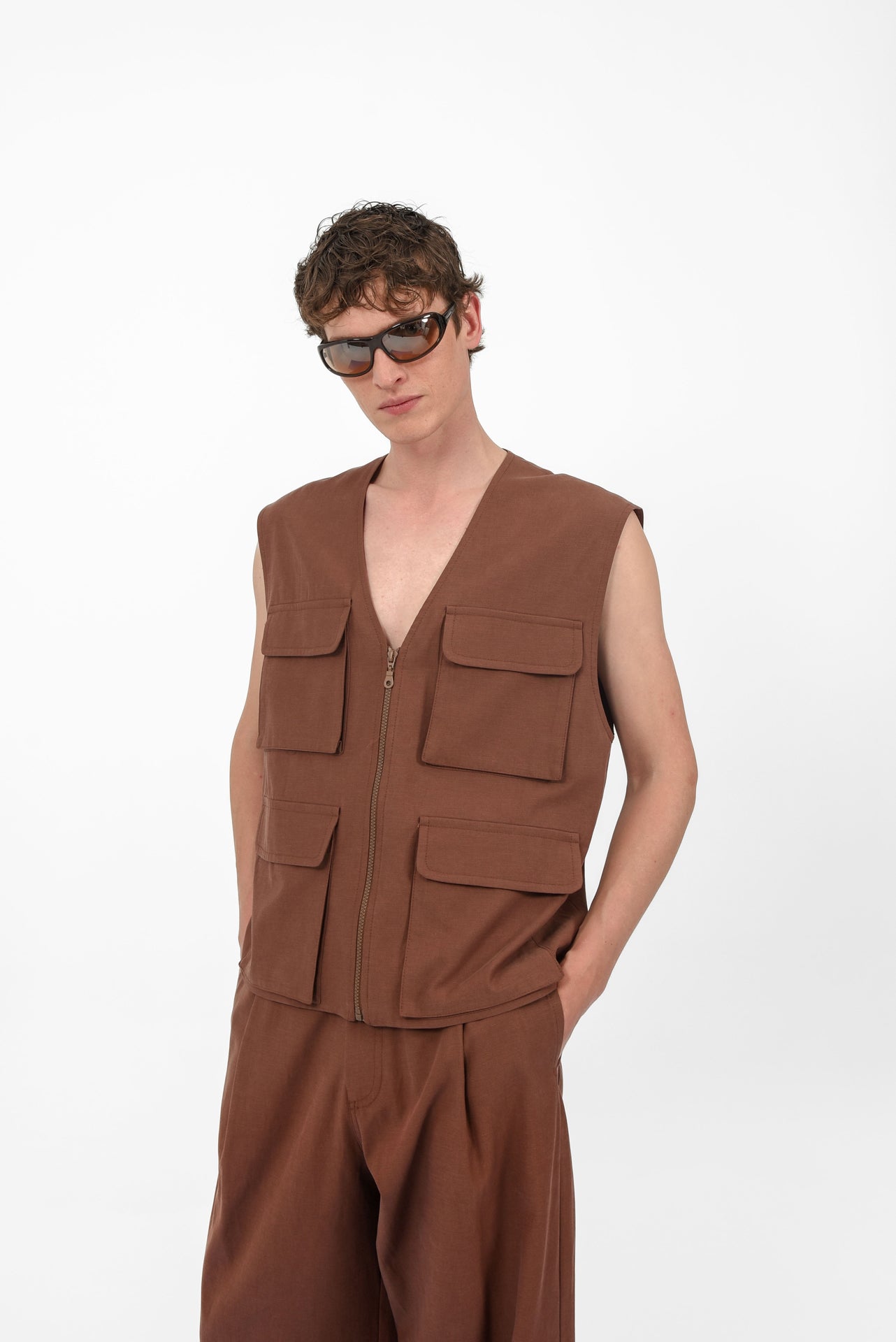 A structured sleeveless vest designed with a clean, utilitarian silhouette. Featuring a front zip closure and multiple flap pockets, it combines functionality with modern tailoring. The straight fit and lightweight fabric make it an easy layering piece, adding a refined yet relaxed edge to everyday styling.