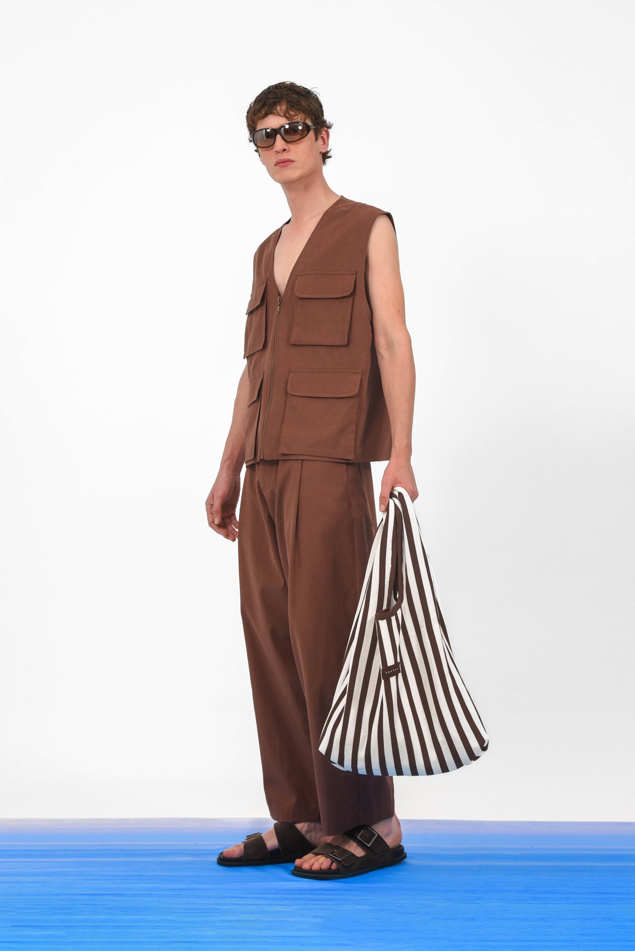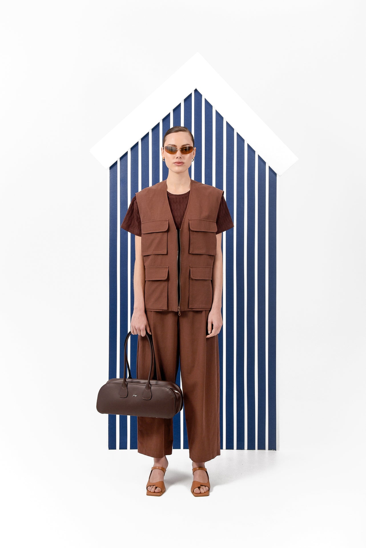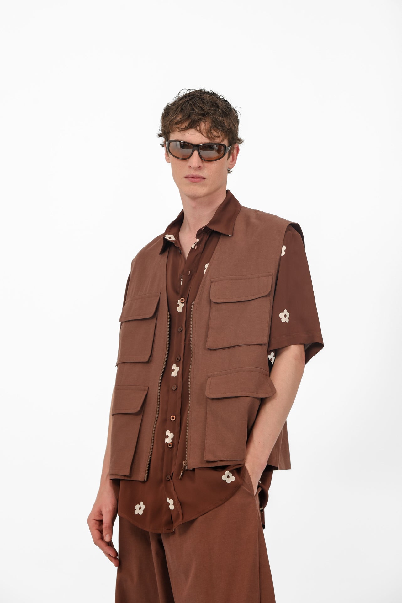 A structured sleeveless vest designed with a clean, utilitarian silhouette. Featuring a front zip closure and multiple flap pockets, it combines functionality with modern tailoring. The straight fit and lightweight fabric make it an easy layering piece, adding a refined yet relaxed edge to everyday styling.
